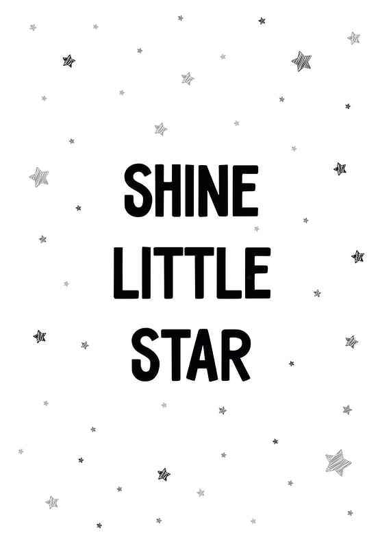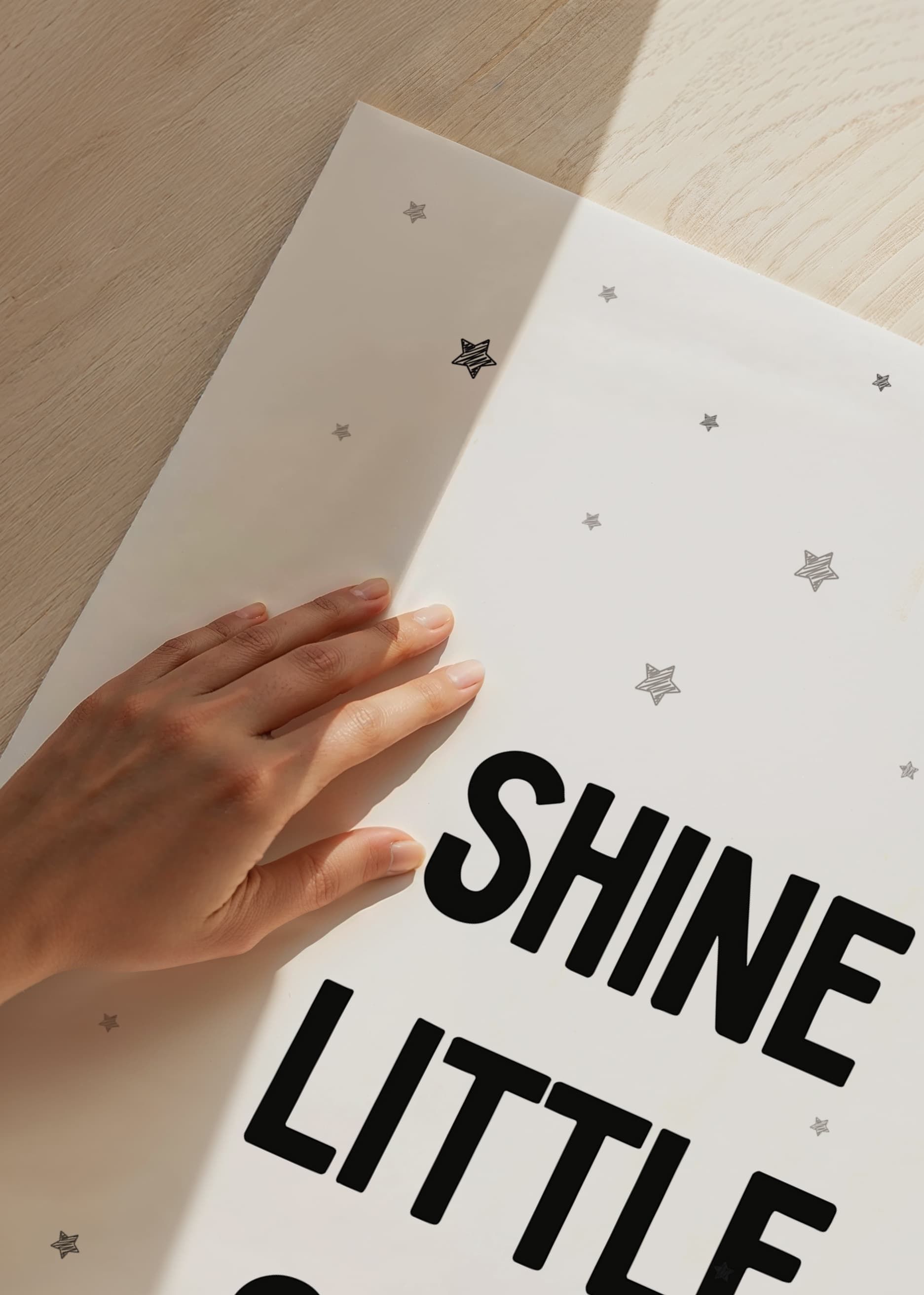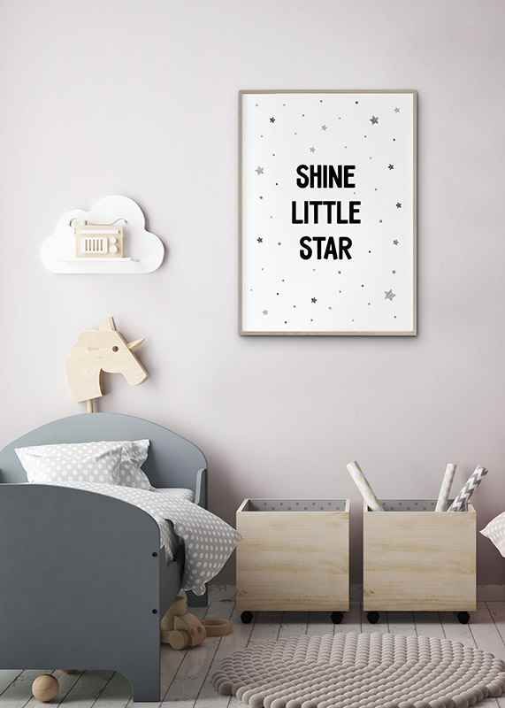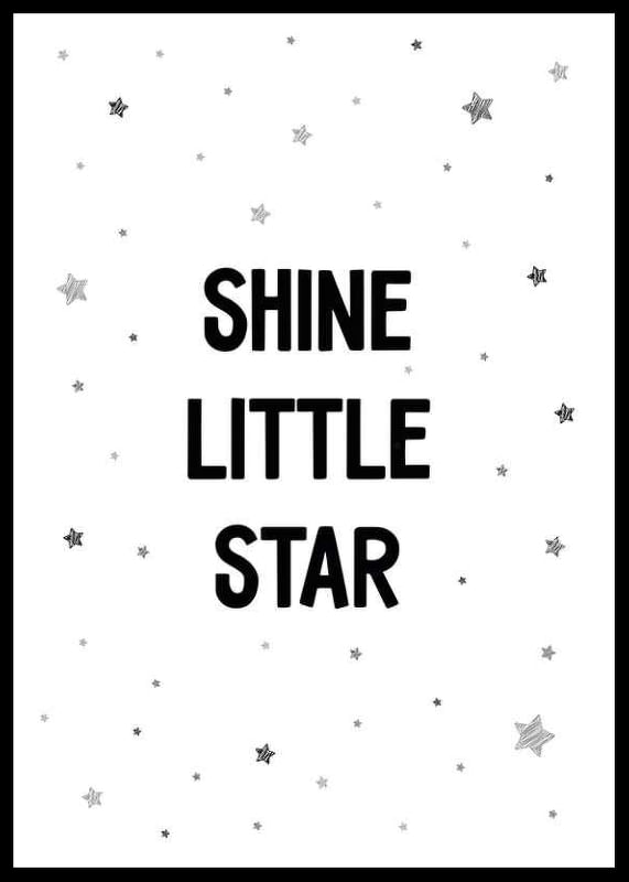 The motif consists of the black text 'Shine Little Star' in capital letters centered on a white background. Around the text are cartoon stars in different sizes and shades of gray, distributed over the surface. The neutral color scheme makes the poster easy to combine in children's rooms and goes well with both colorful and black and white motifs.