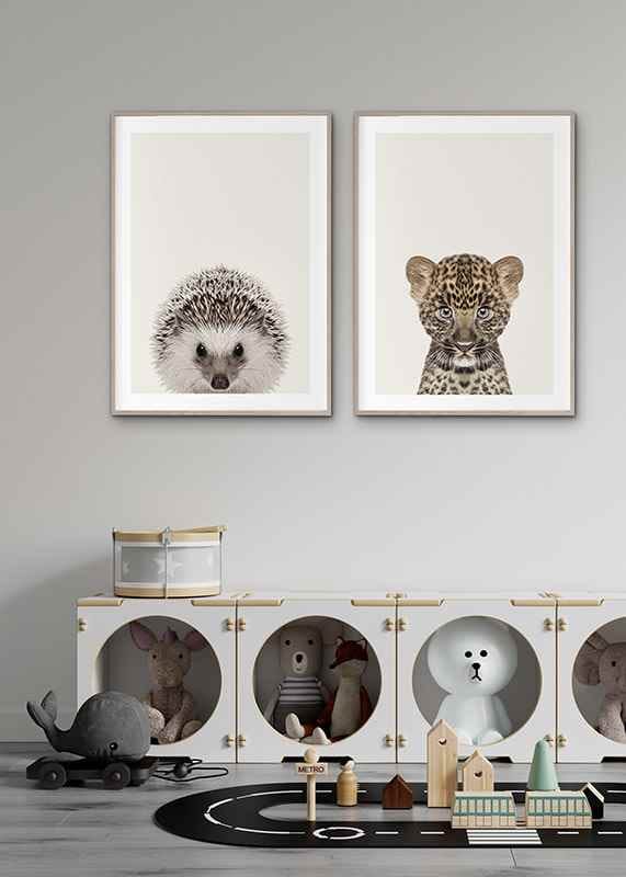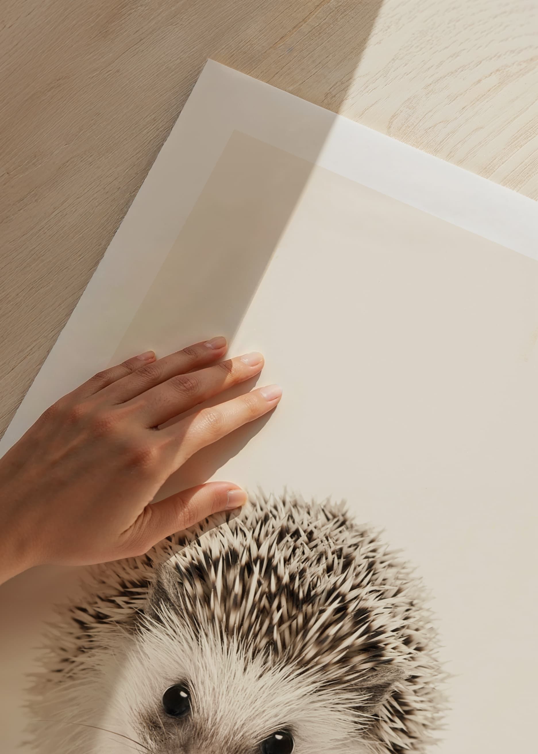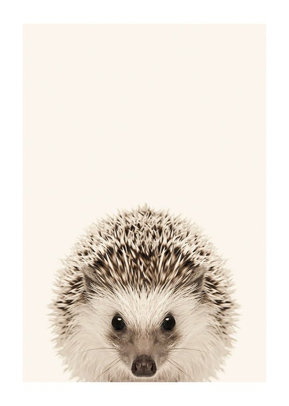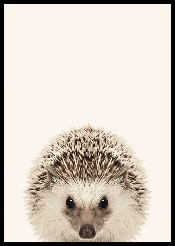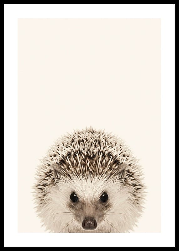 The motif consists of a close-up of a small baby hedgehog looking straight ahead with big black eyes. The background is simple and light, which highlights the animal's spines and soft face. This poster fits naturally in children's rooms or playful environments where you want to create a warm and inviting atmosphere.