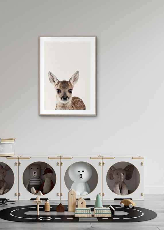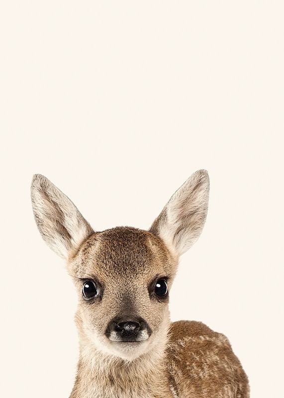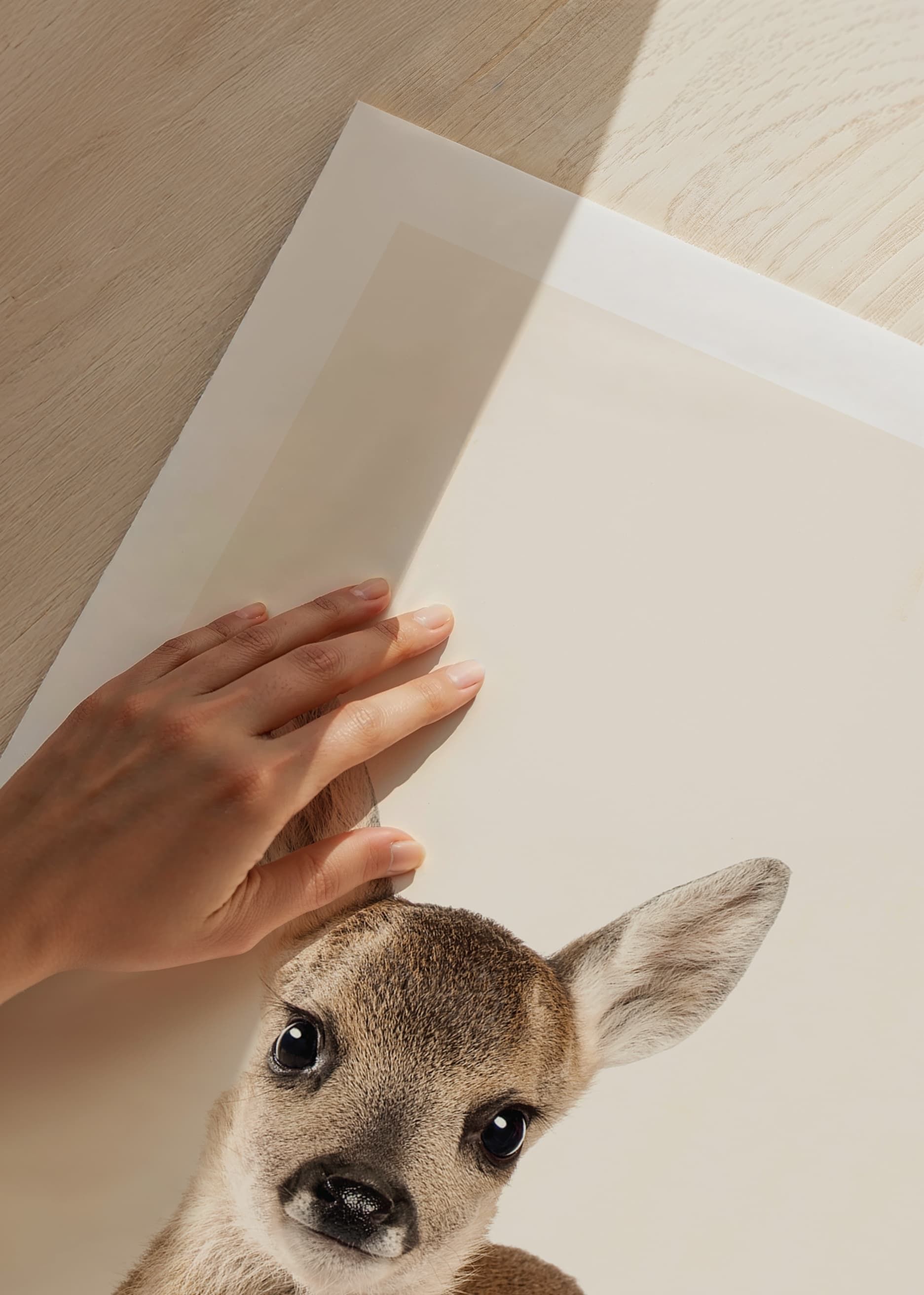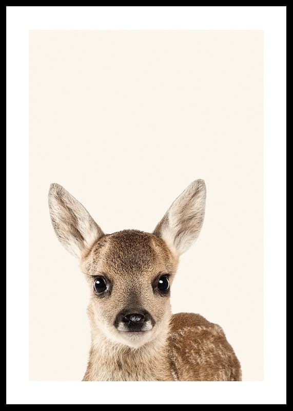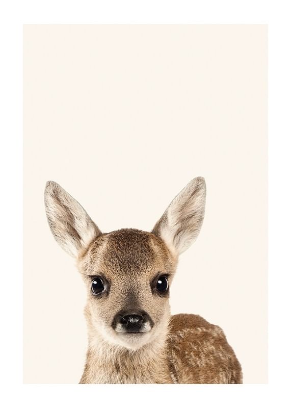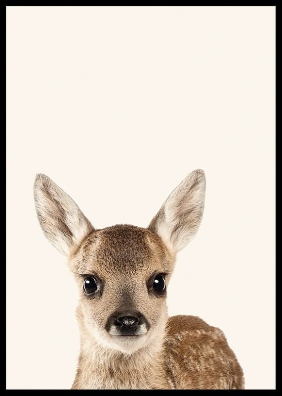 Close-up of a young deer calf with large, dark eyes and soft, brown fur with light spots. The motif has a light beige background that highlights the animal's face and expression. The stylish poster fits well in children's rooms or other environments where a natural and friendly feel is desired.