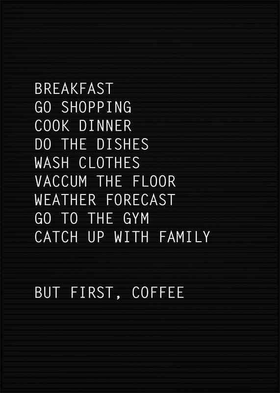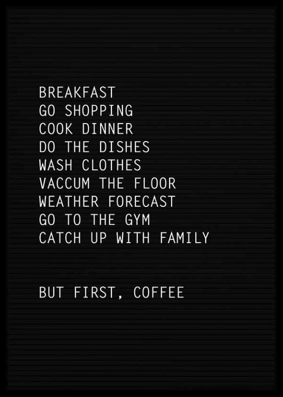 The motif consists of a black letter board with white capitals that lists typical weekend chores such as breakfast, cooking and exercise. The list ends further down with the words 'But first, coffee'. Graphic and minimalist poster that adds a personal and humorous tone to the kitchen or home office.