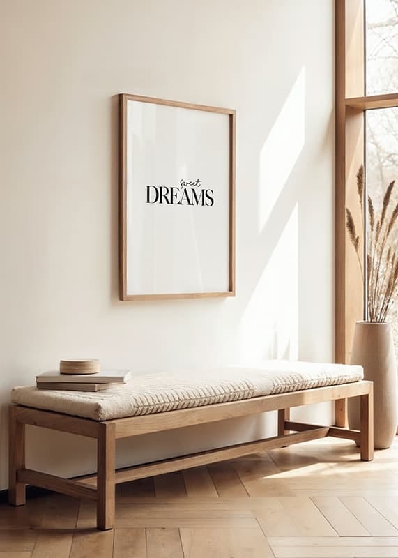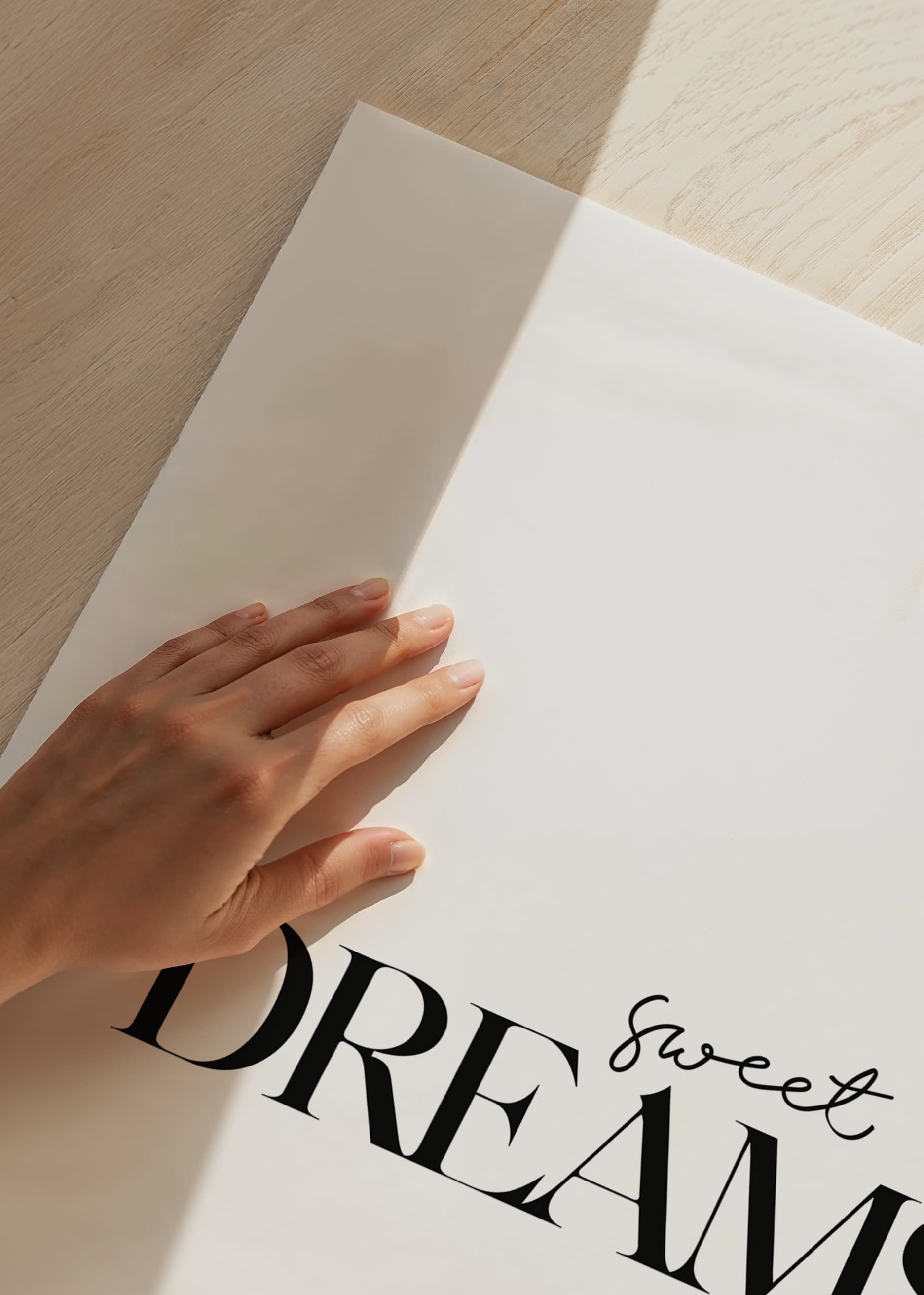 The motif consists of the words Sweet Dreams placed centrally against a completely white background. The combination of a thin, handwritten style for the word sweet and large, classic capital letters for DREAMS gives a clear and graphic feel. This poster is perfect for the bedroom or children's room for a stylish and calm end to the day.