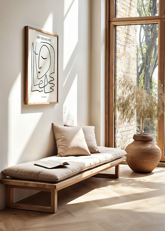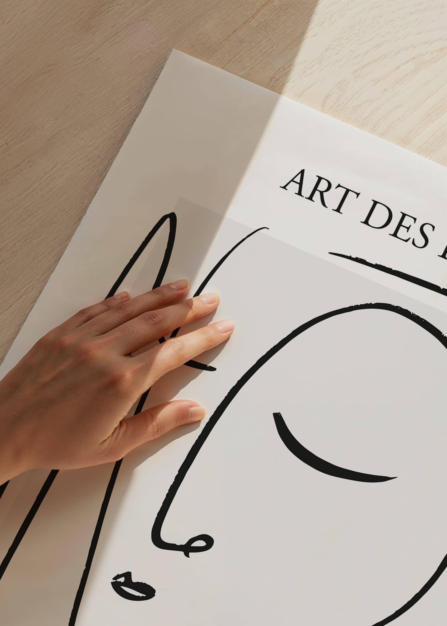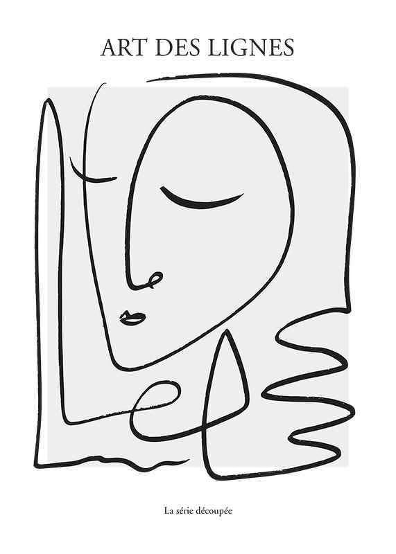 The motif consists of an abstract face created with a single black line in a style inspired by Picasso. The face, with closed eyes and a hint of hand and hair, is drawn against a light gray background and framed by a white border. This poster gives a graphic and artistic expression that suits both modern and classic interiors.