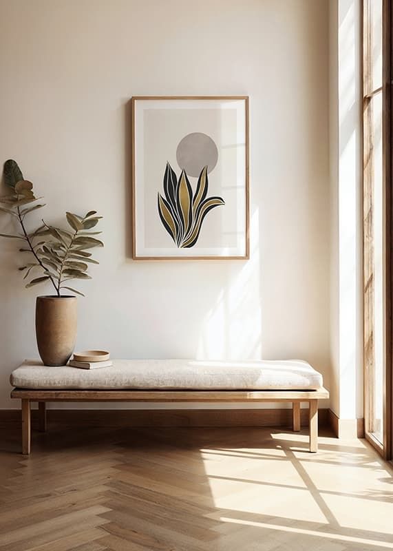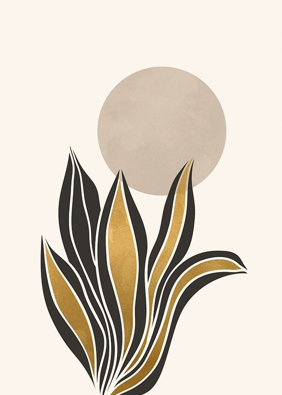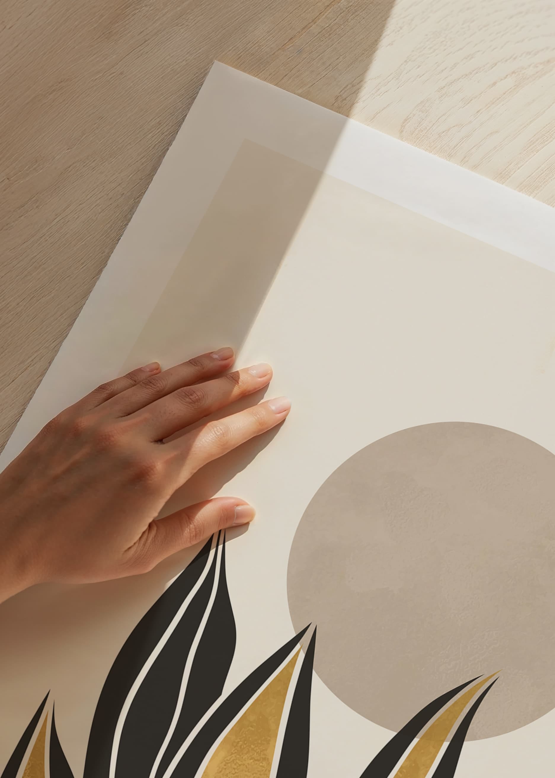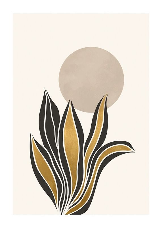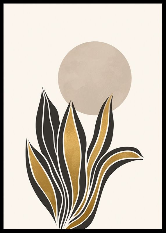 The motif consists of stylized leaves in black and gold with white lines, placed in front of a soft, sand-colored circle against a light background. The color combination creates a modern yet timeless feel. This poster is great for living rooms or bedrooms where you want to give your interior an artistic and warm touch.