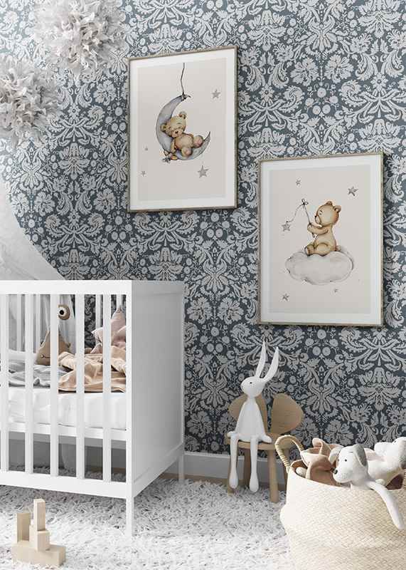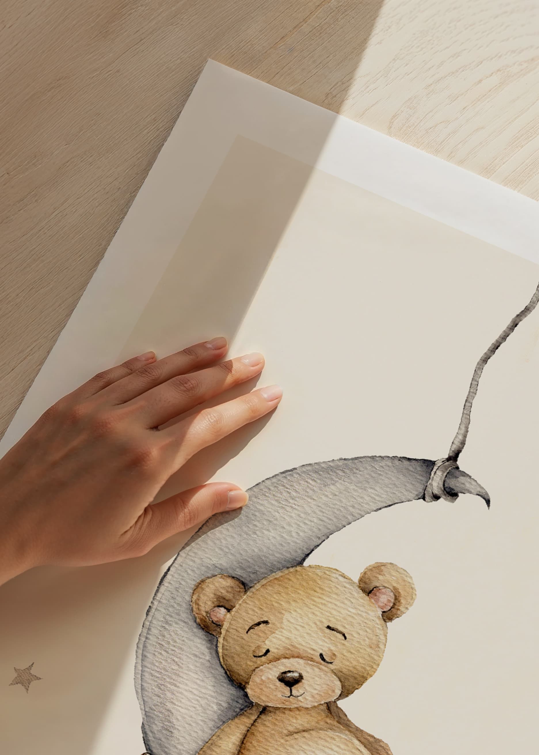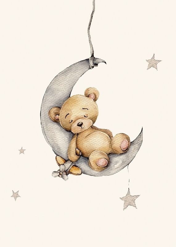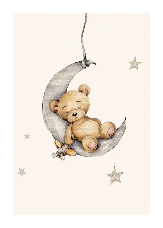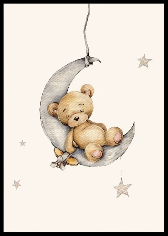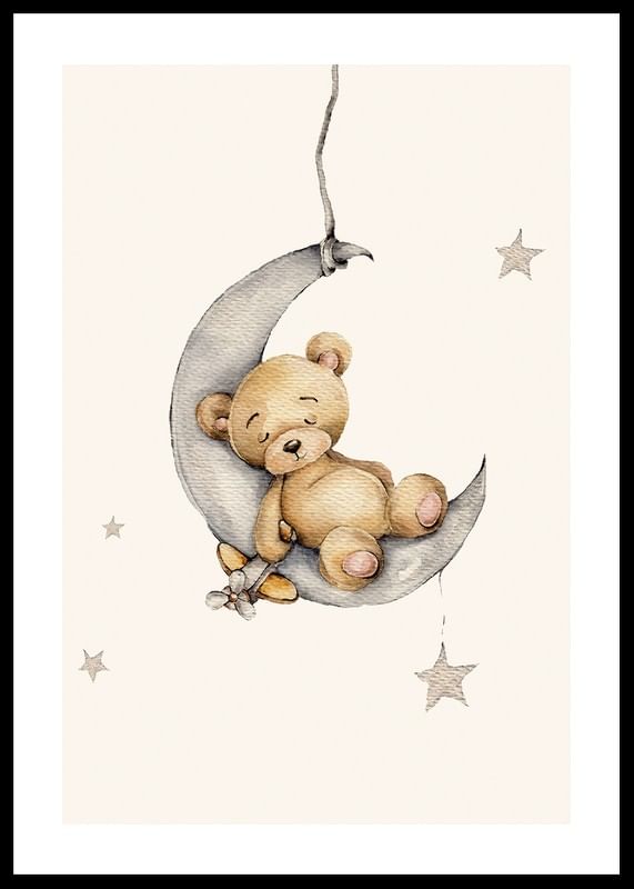 A small teddy bear sleeps safely on a gray crescent moon, surrounded by soft stars on a light background. The illustration's gentle pastel tones and simple expression give a peaceful impression. This poster creates a warm and welcoming feeling in a child's room, especially together with other motifs in the same series.