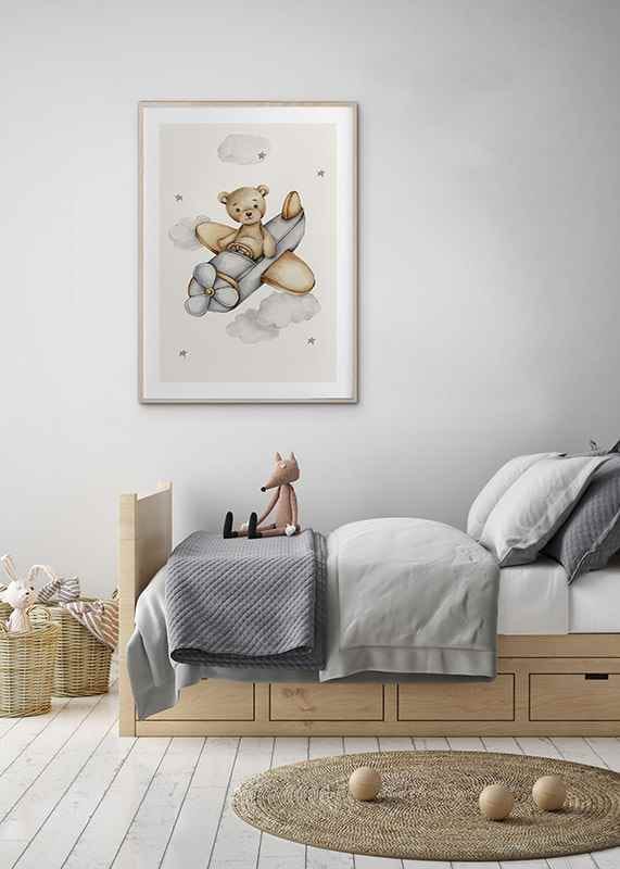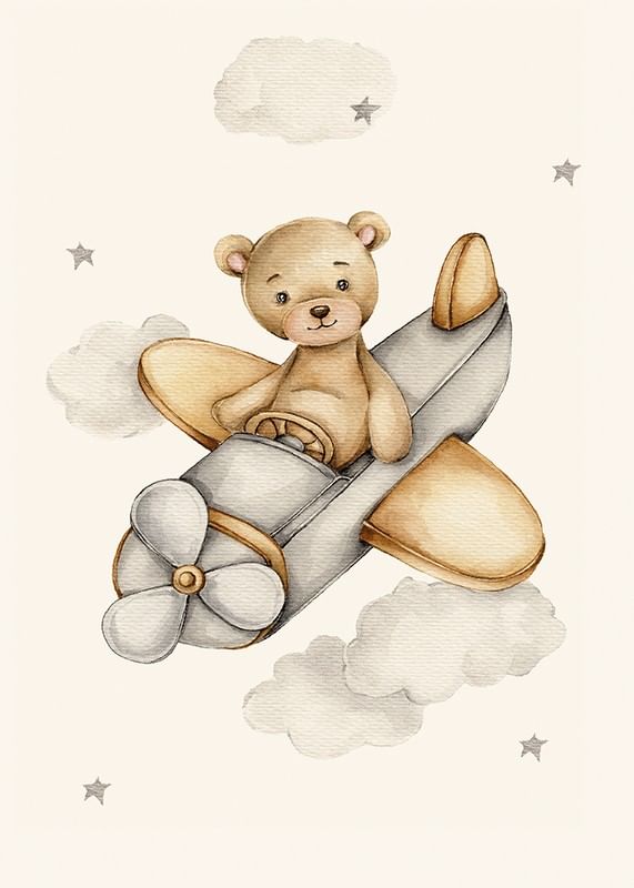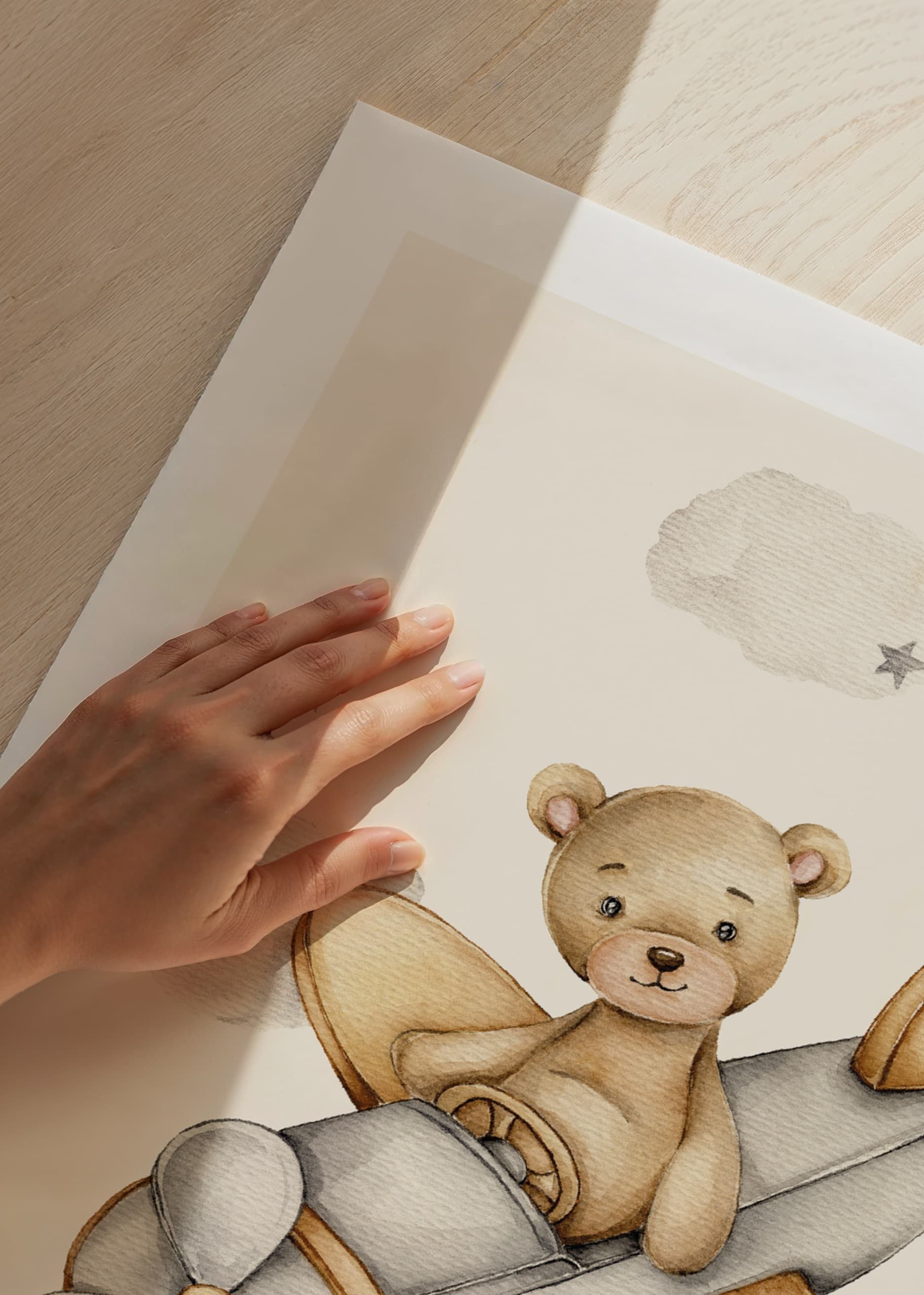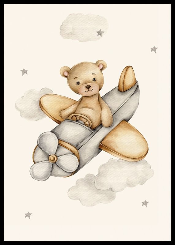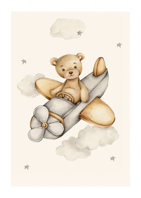 A teddy bear sits at the controls of a gray and beige airplane that floats among soft clouds and small stars against a light background. The warm, muted colors and watercolor technique give a playful feel. The poster is a cozy element in the children's room and fits nicely with other motifs in the series.