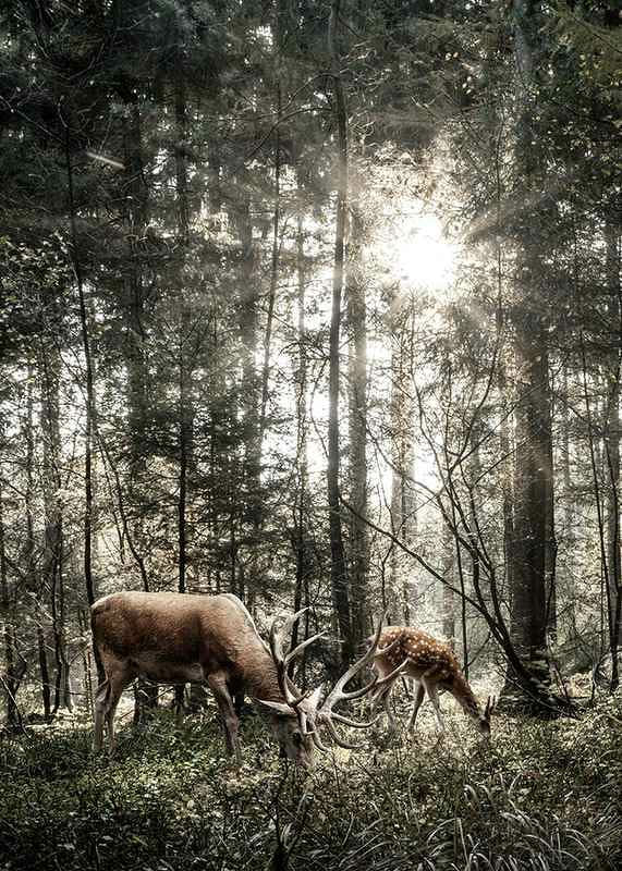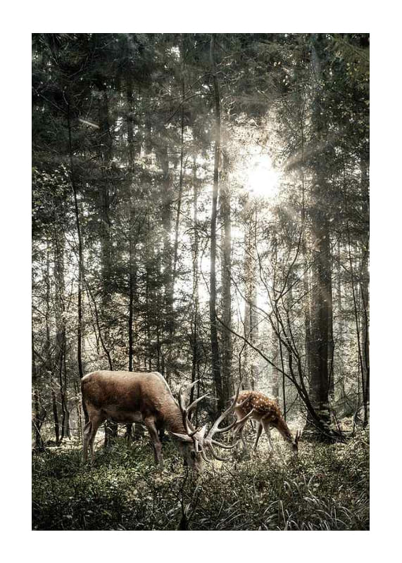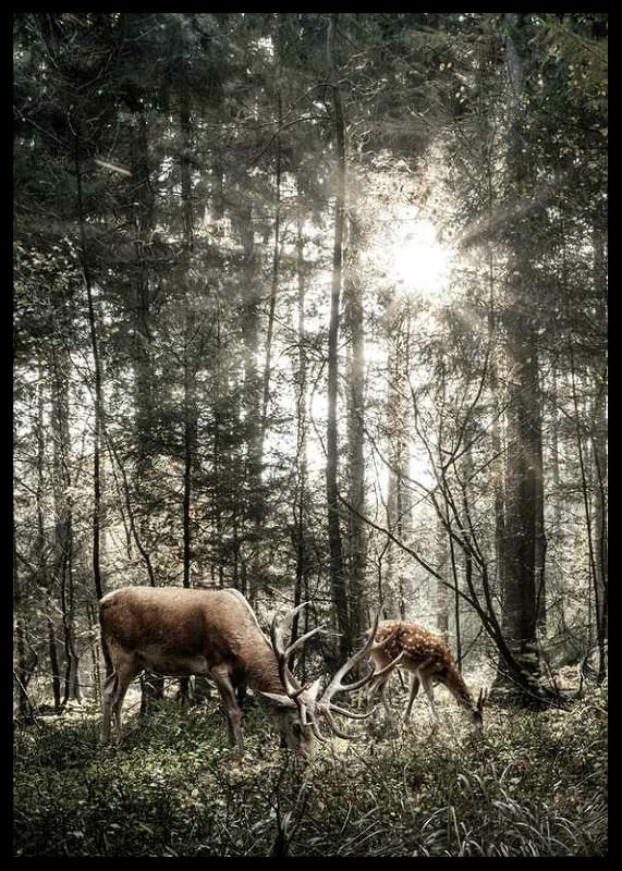 Two deer graze in a lush forest clearing with tall trees where the sun's rays filter through the branches and give the motif a soft light. Dull green and brown tones dominate, with a detailed natural feel. This poster fits equally well in living rooms and offices and contributes a quiet element of nature and wildlife.