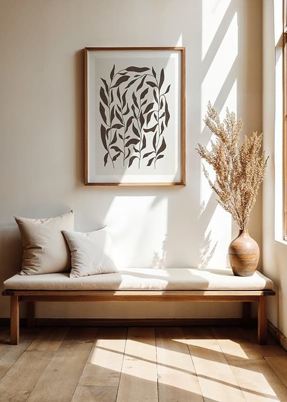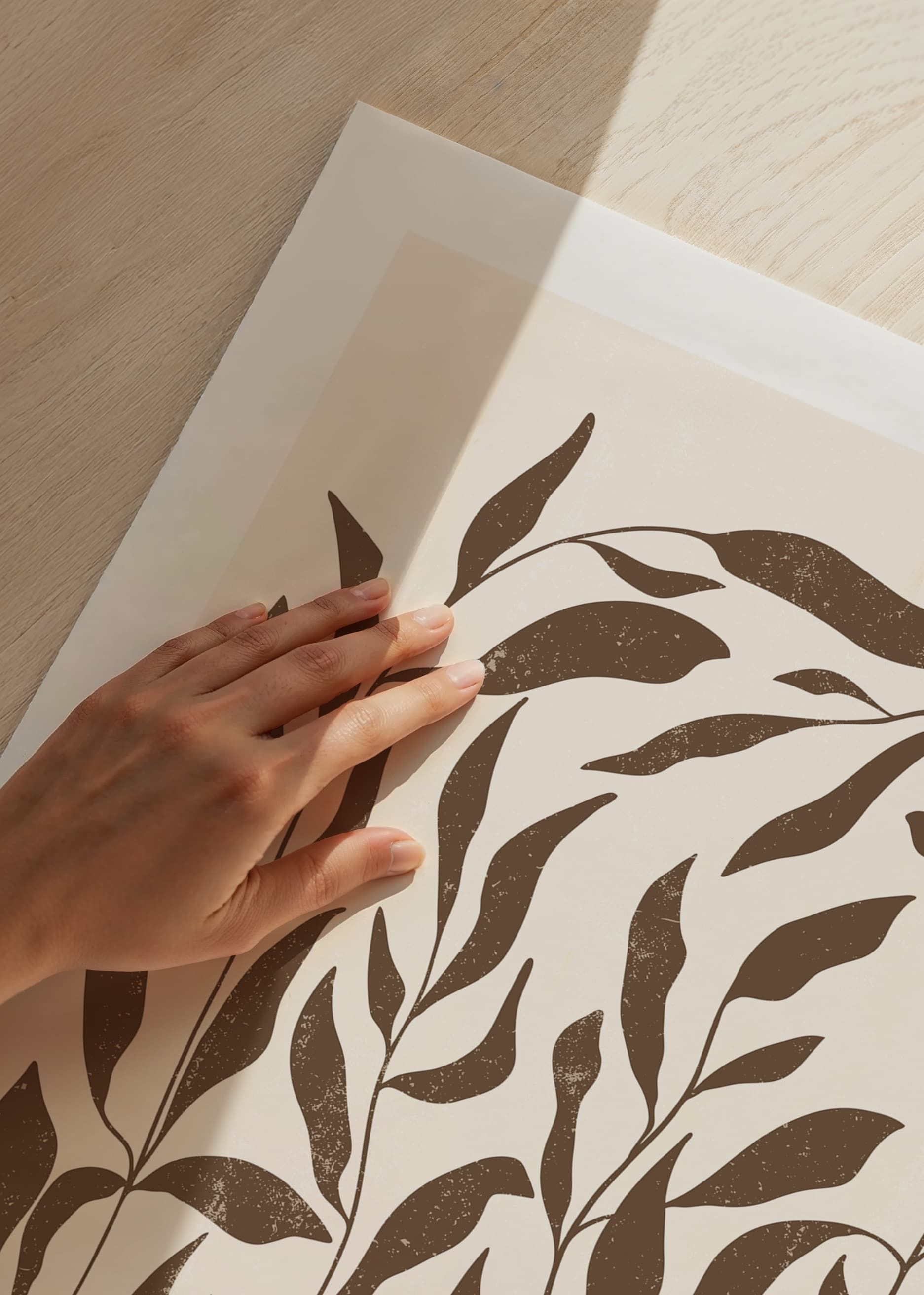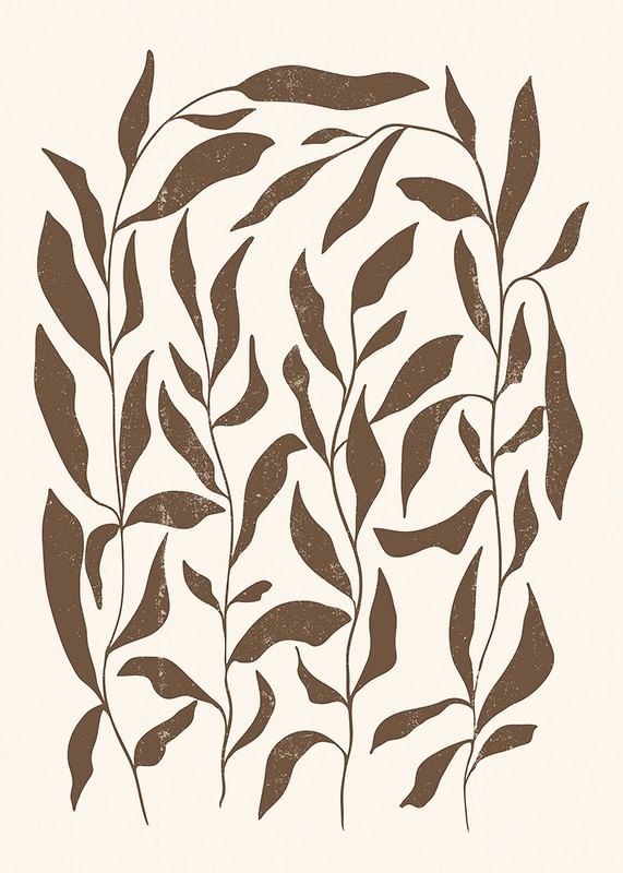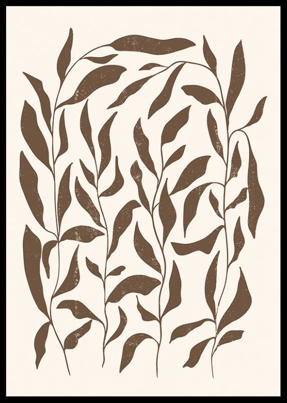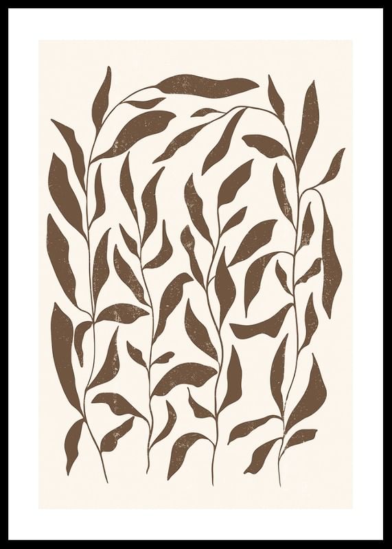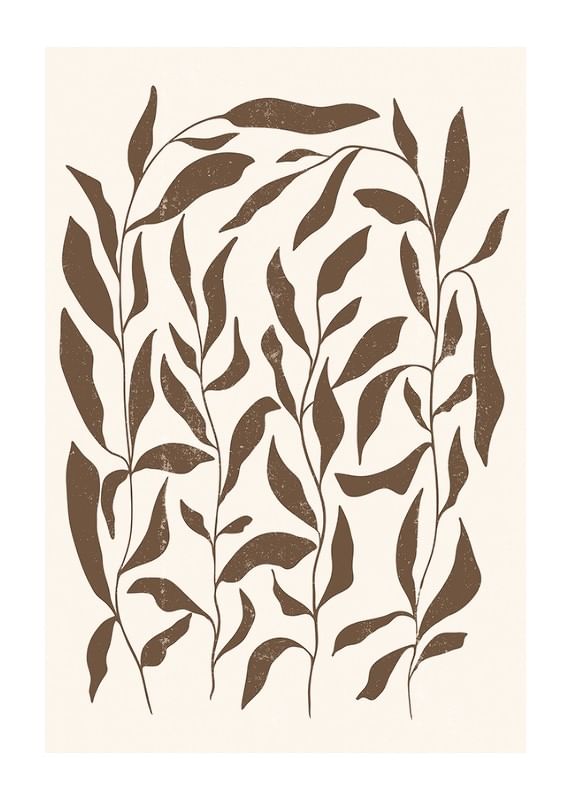 The motif consists of stylized, brown leaves and stems that extend vertically in a repeating pattern. The light beige background highlights the organic shapes and creates a graphic expression. This poster is suitable for adding a subtle plant feel to both the living room and bedroom.