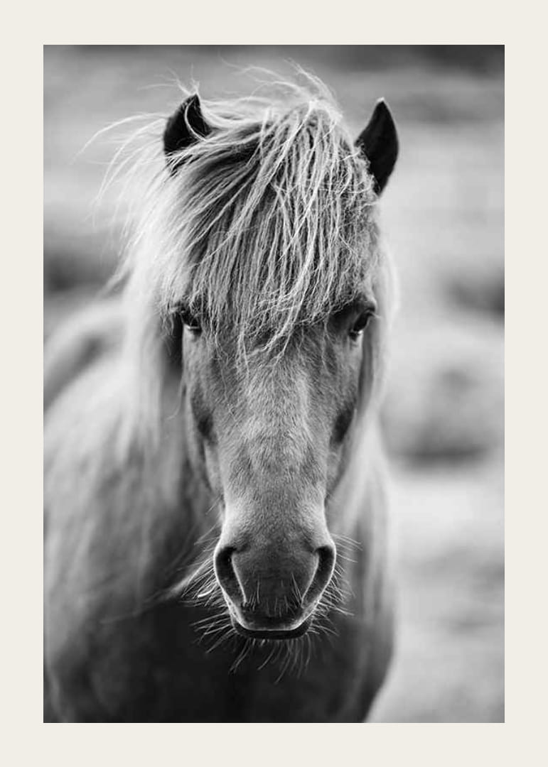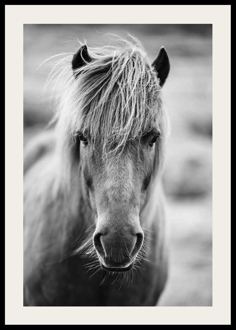 A close-up of an Icelandic horse in black and white, with the horse's long, shaggy mane and distinct facial features in focus against a softly blurred background. Stylish and expressive, this poster highlights the horse's character and strength. It works equally well in modern environments as in more rustic interiors.