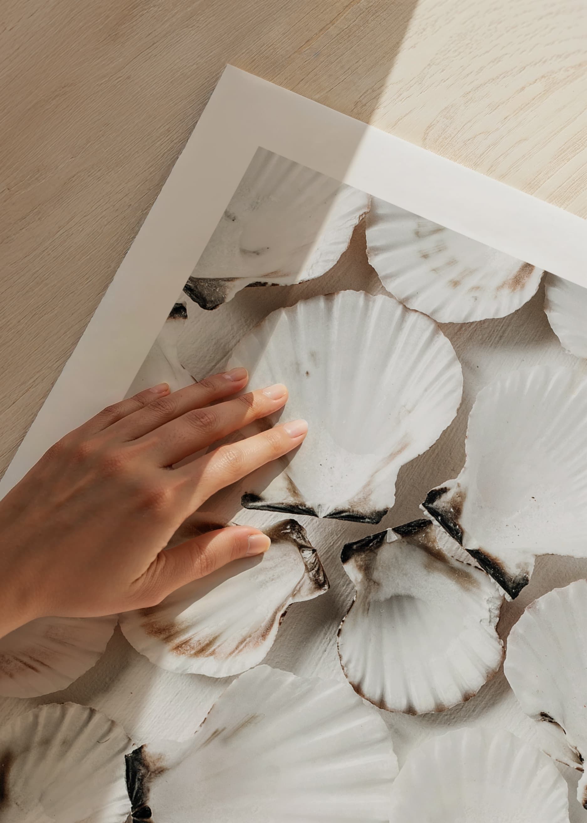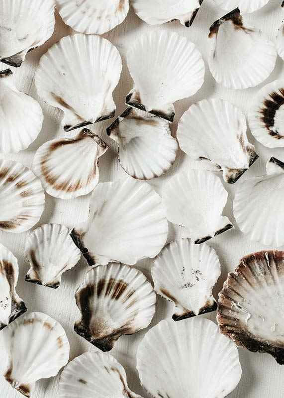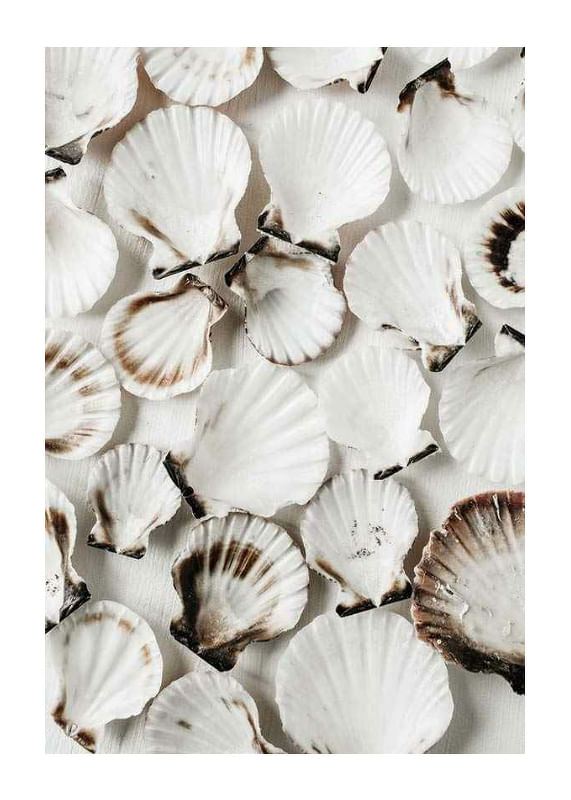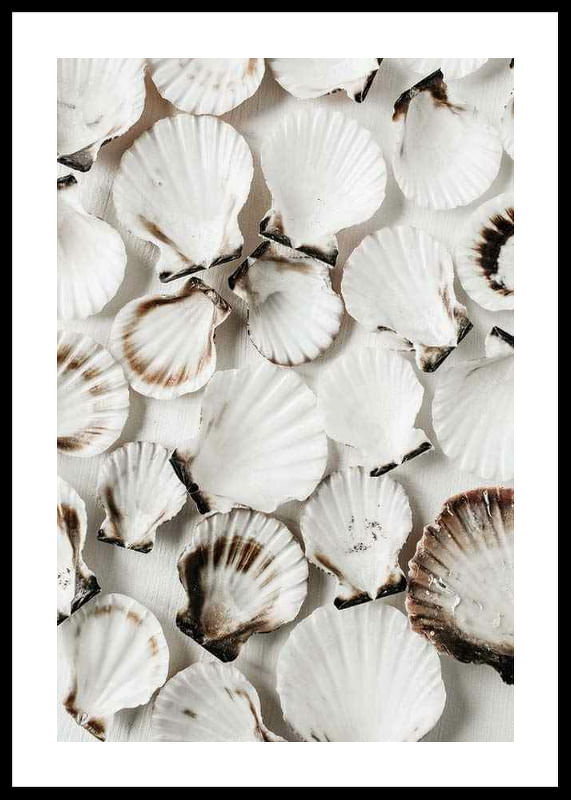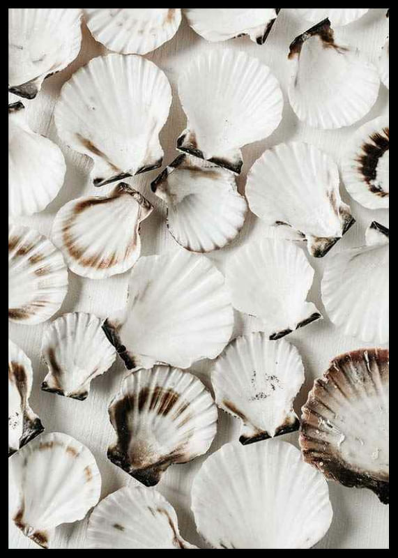 A collection of white seashells with distinct brown details are scattered across a light surface. The motif highlights the natural shapes and variations in texture, capturing the feeling of the beach and summer. This poster fits well in everything from bathrooms to living rooms, giving the room a subtle maritime atmosphere.