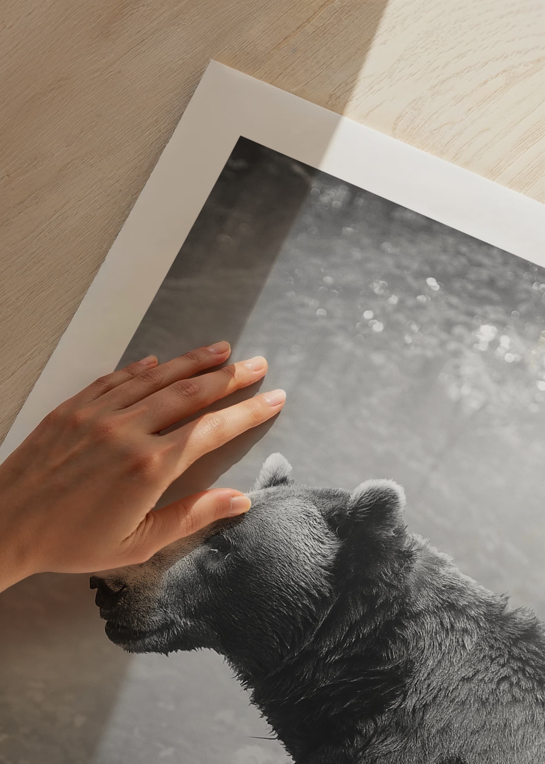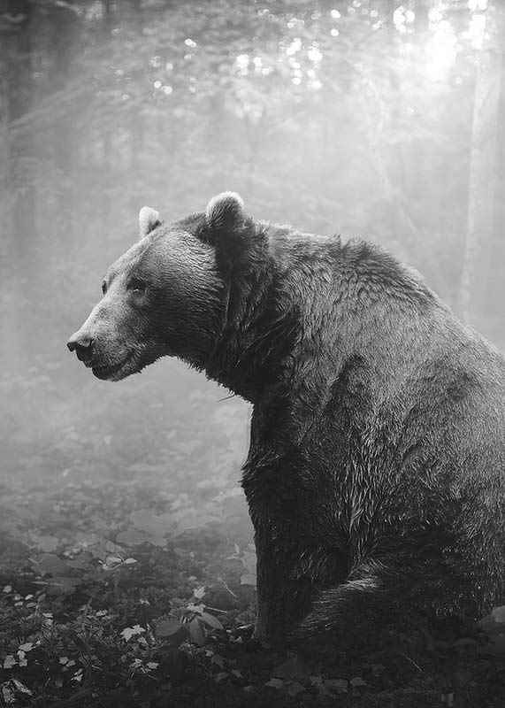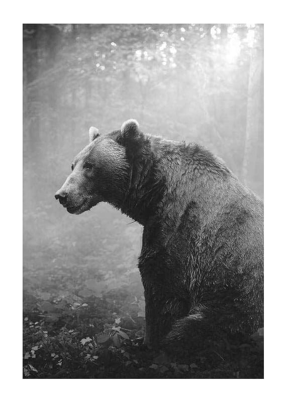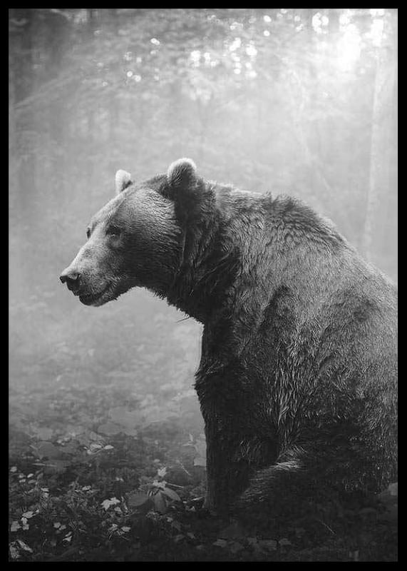 Grizzly bear in profile looking to the left, surrounded by dense forest and soft light coming through the fog. Black and white tones highlight the bear's fur and the natural structures. This poster gives a natural feel and is suitable for homes where a timeless and calm atmosphere is desired.