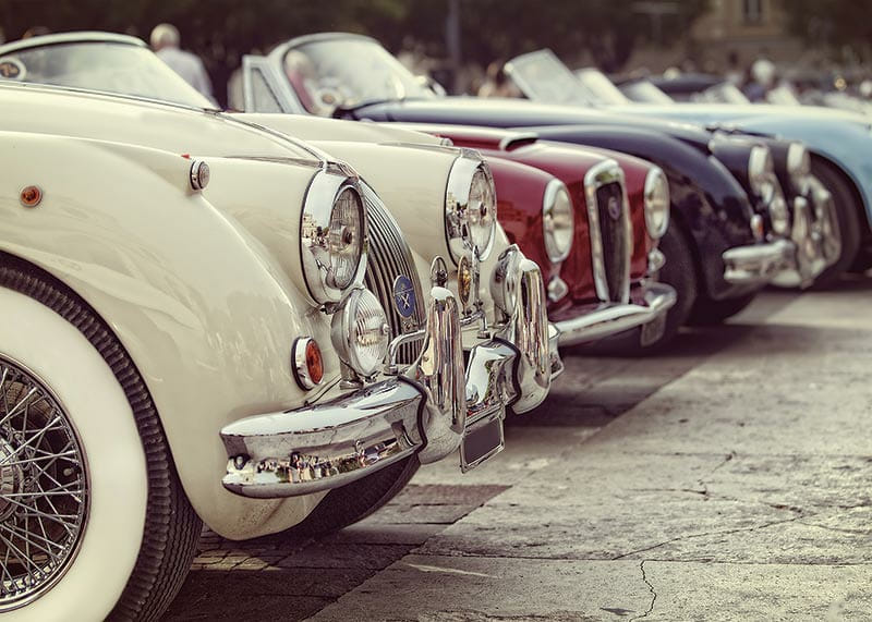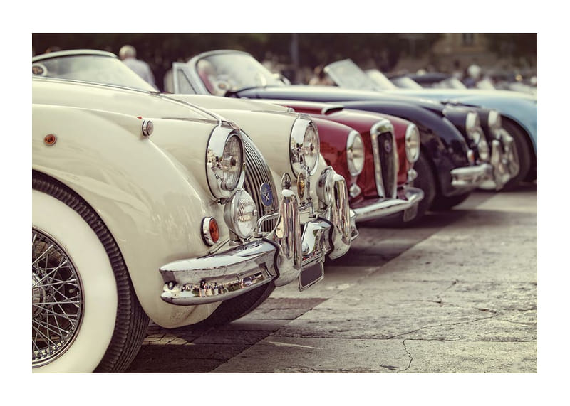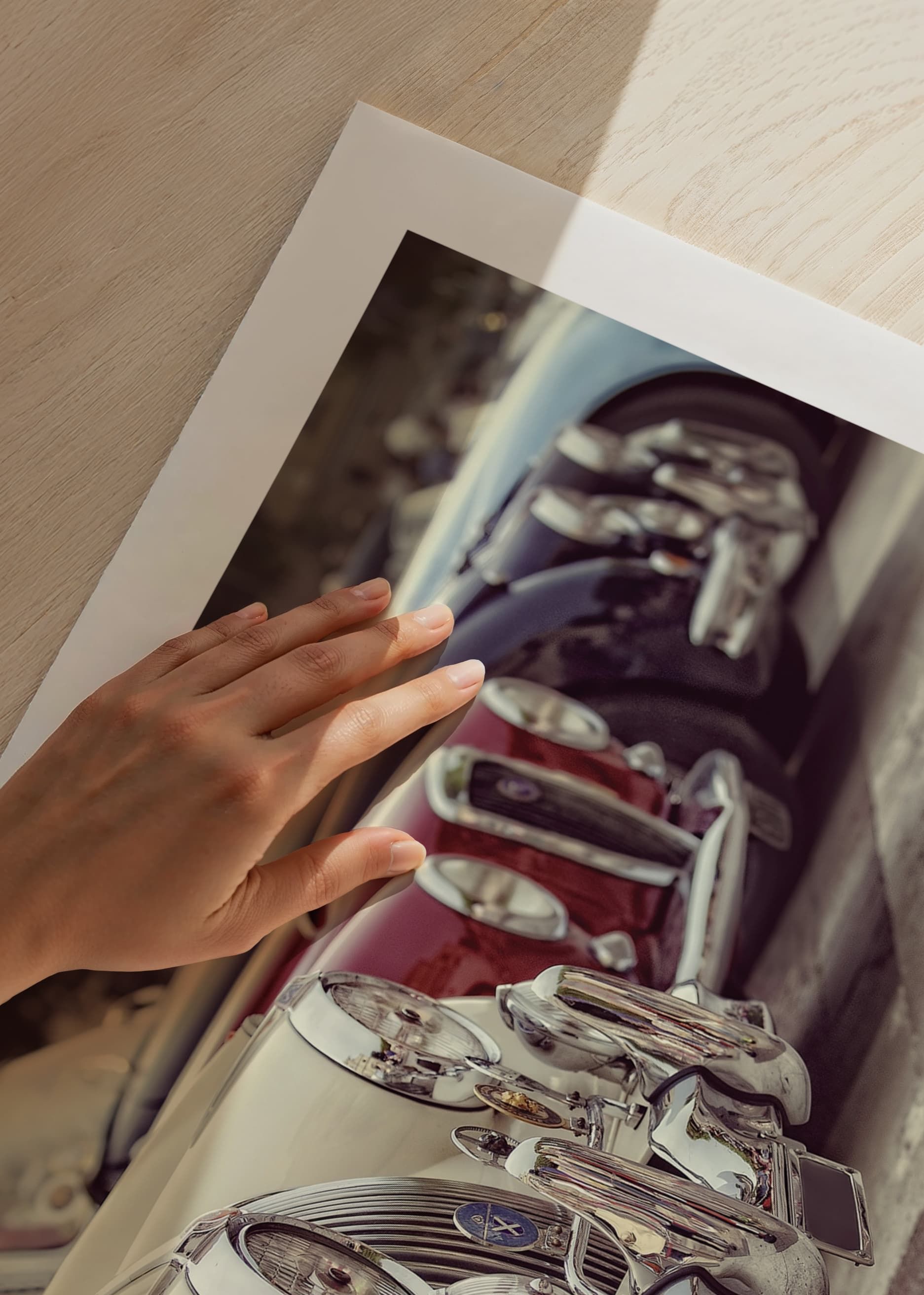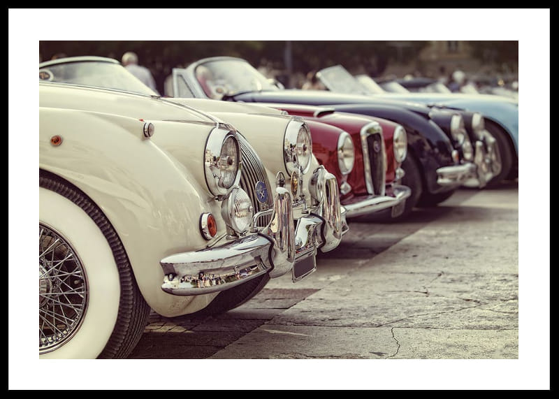 Several classic vintage cars are lined up in a row with the fronts visible, painted in shades of cream white, red, black and blue. Chrome details and distinctive shapes from the 1950s and 60s give the image a distinct retro character. This poster adds a nostalgic feel to, for example, a living room or study.