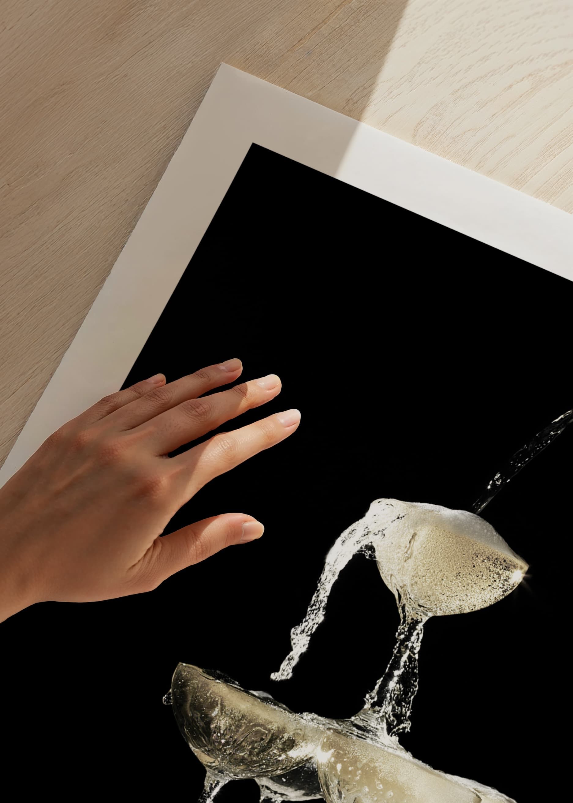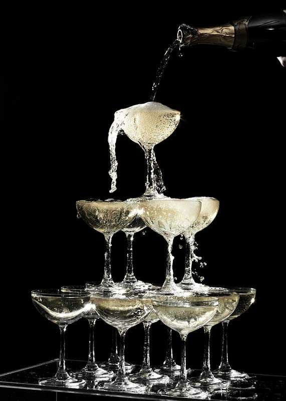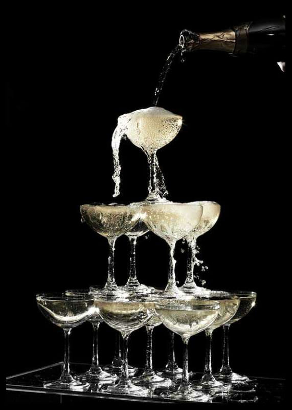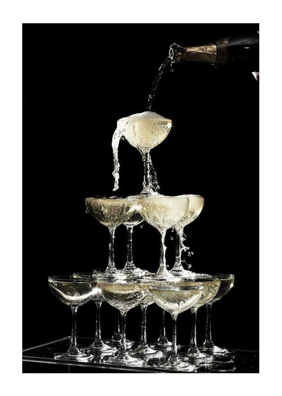 Pyramid of champagne glasses where sparkling wine is poured from a bottle into the top glass and flows down through layers of glass. Sharp contrasts between the sparkling bubbles and the deep black background give the motif a timeless vintage feel. Suitable as a poster in the kitchen, dining room or home bar for a stylish impression.