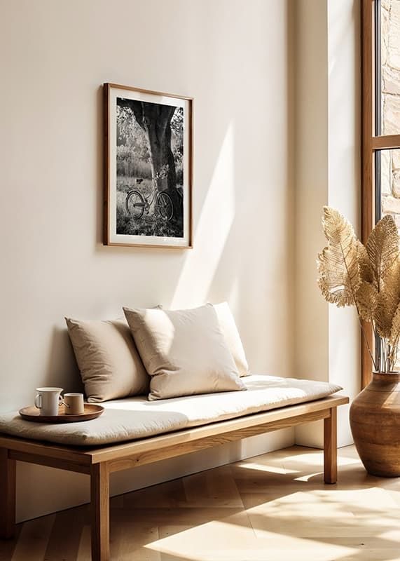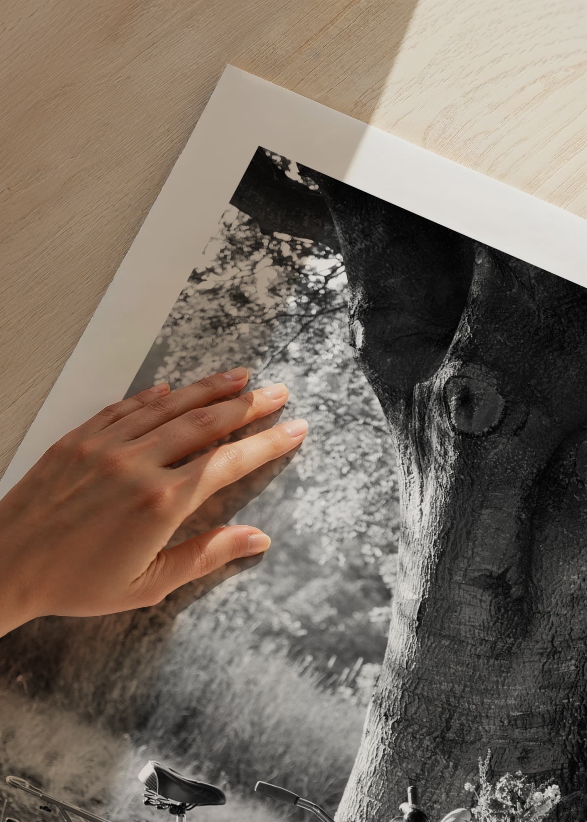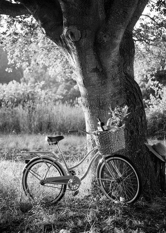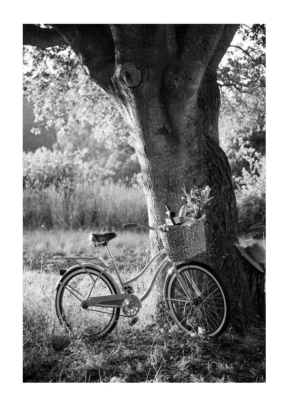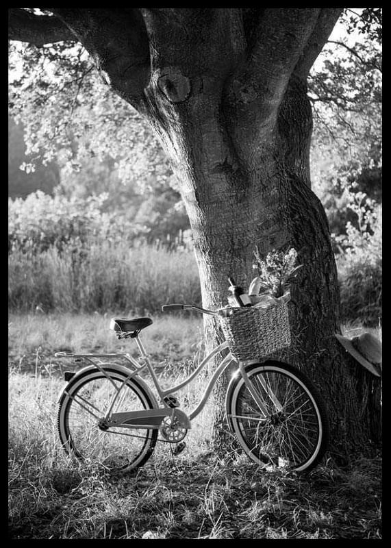 Beneath a mighty tree stands a retro bicycle leaning against the trunk, with a large wicker basket on the handlebars filled with flowers and picnic items. Sunbeams filter through the foliage, creating soft contrasts in the black and white photo. The timeless feel of this poster makes a peaceful addition to a kitchen, hallway or living room.