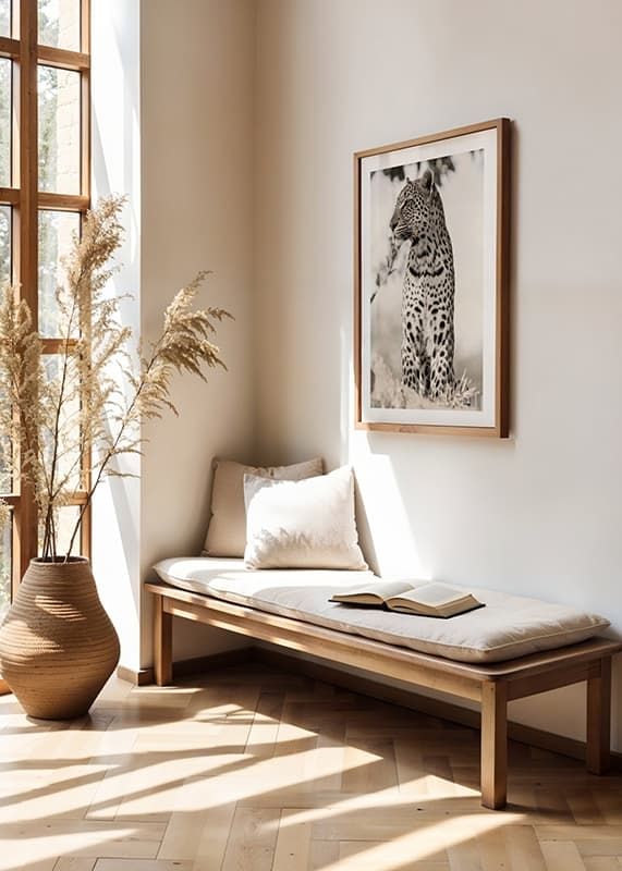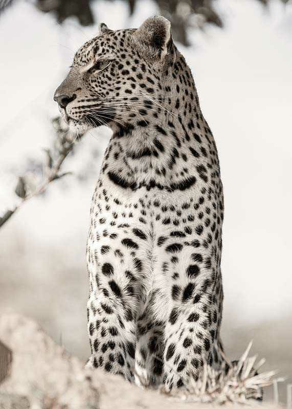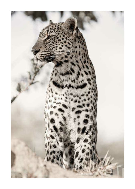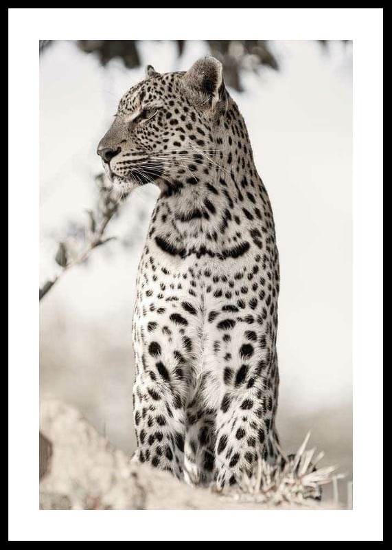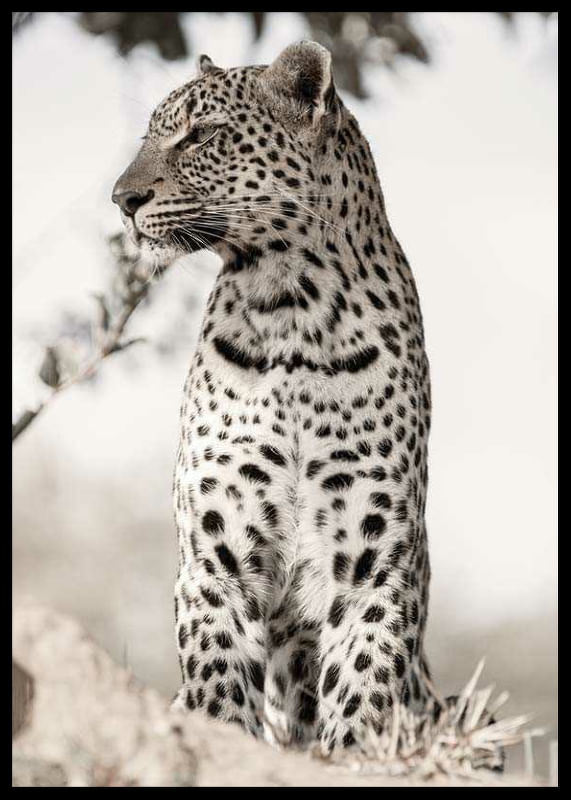 Leopard in profile with distinct, spotted fur sits on a raised spot among dry tufts of grass. Detailed photography with a soft, light and blurred background that highlights the animal's shapes. Natural beige and black tones give the poster a calm and sophisticated expression, suitable for living rooms and study rooms.