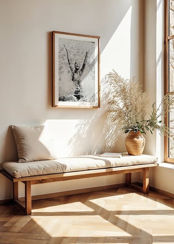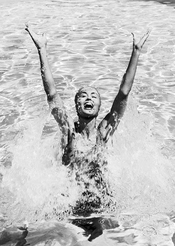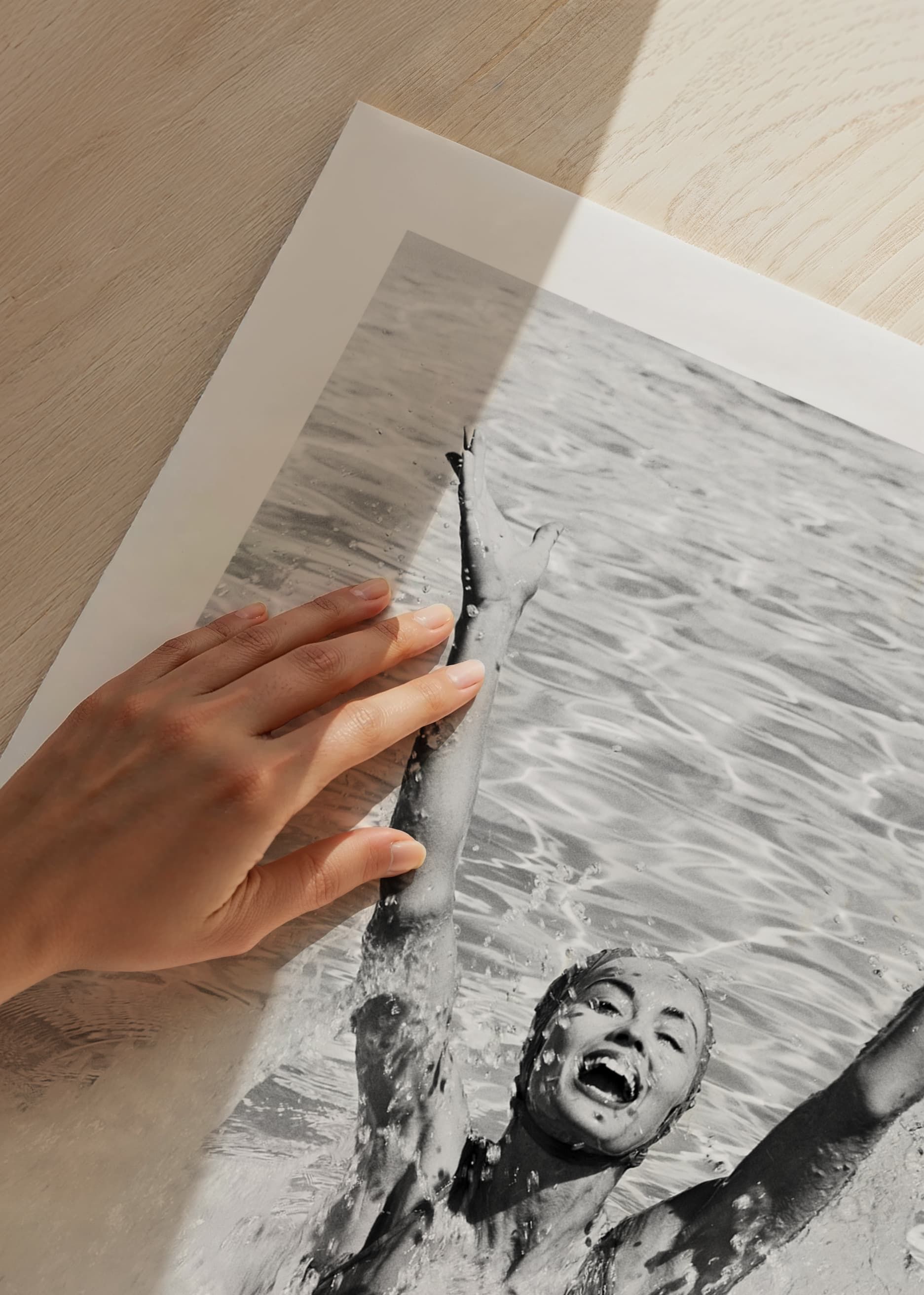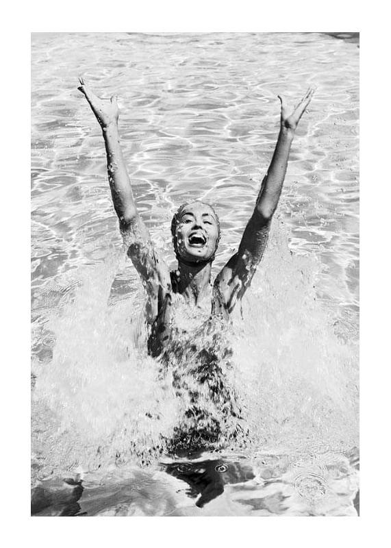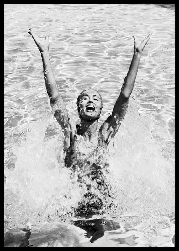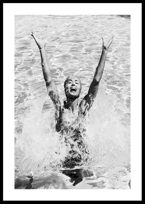 A young woman is seen in a pool, her arms raised and her face lit up with a smile. The water spreads around her in large splashes while the light creates patterns on the water's surface. The black and white poster has a timeless and energetic feel that fits well in everything from the living room to the bathroom for a vibrant interior detail.