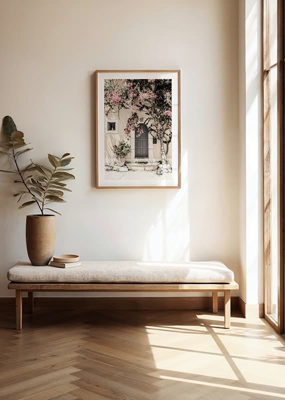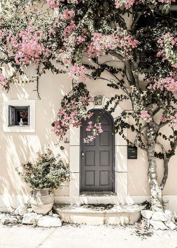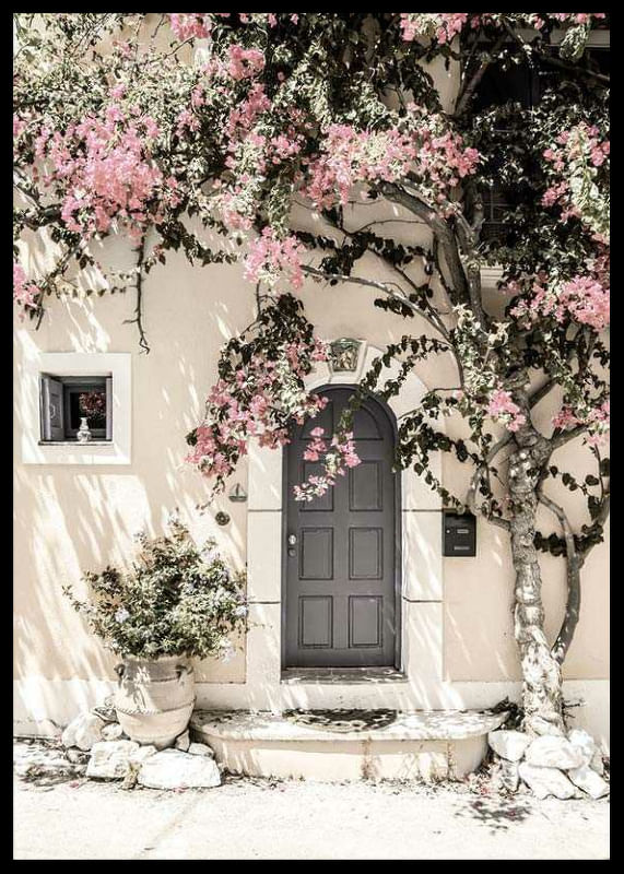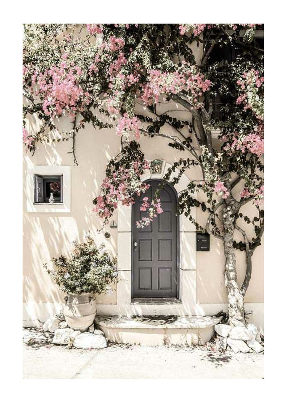 The motif shows a classic grey door with an arched lintel, framed by blooming bougainvillea in soft pink shades and green leaves against a light plastered facade. Shadows from the vegetation fall over the entrance and the terracotta pot by the door. This poster brings a touch of Mediterranean flair to the home and inspires a sense of calm and spring.
