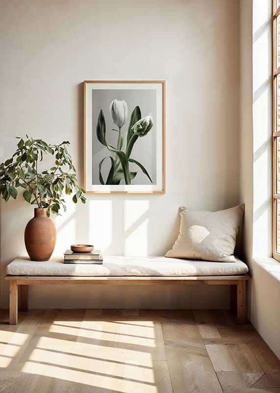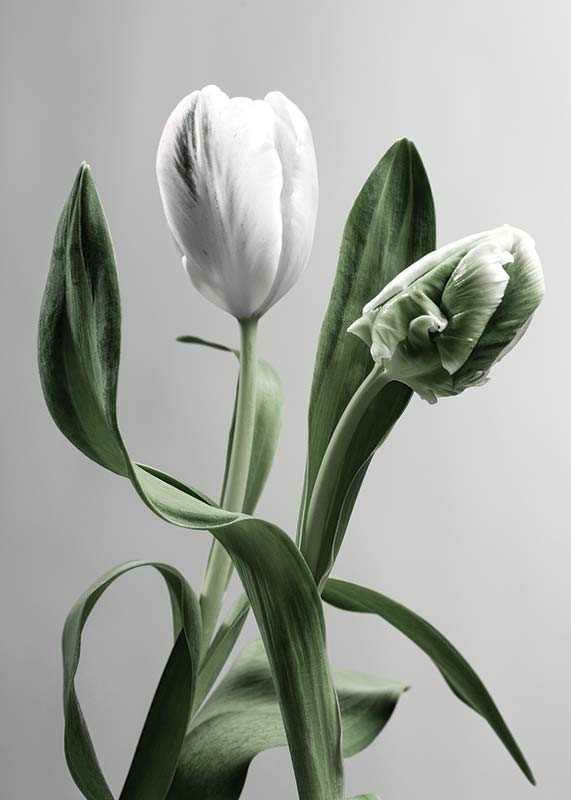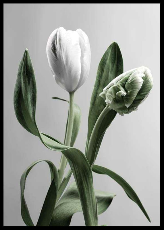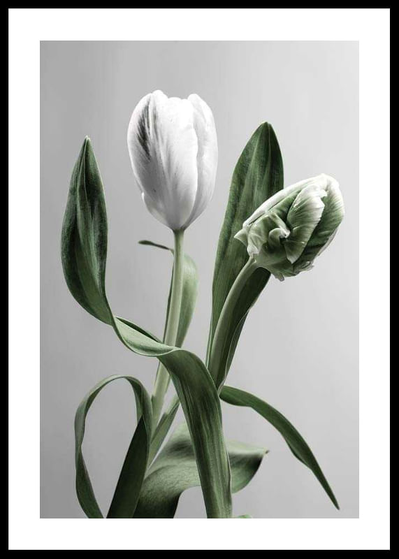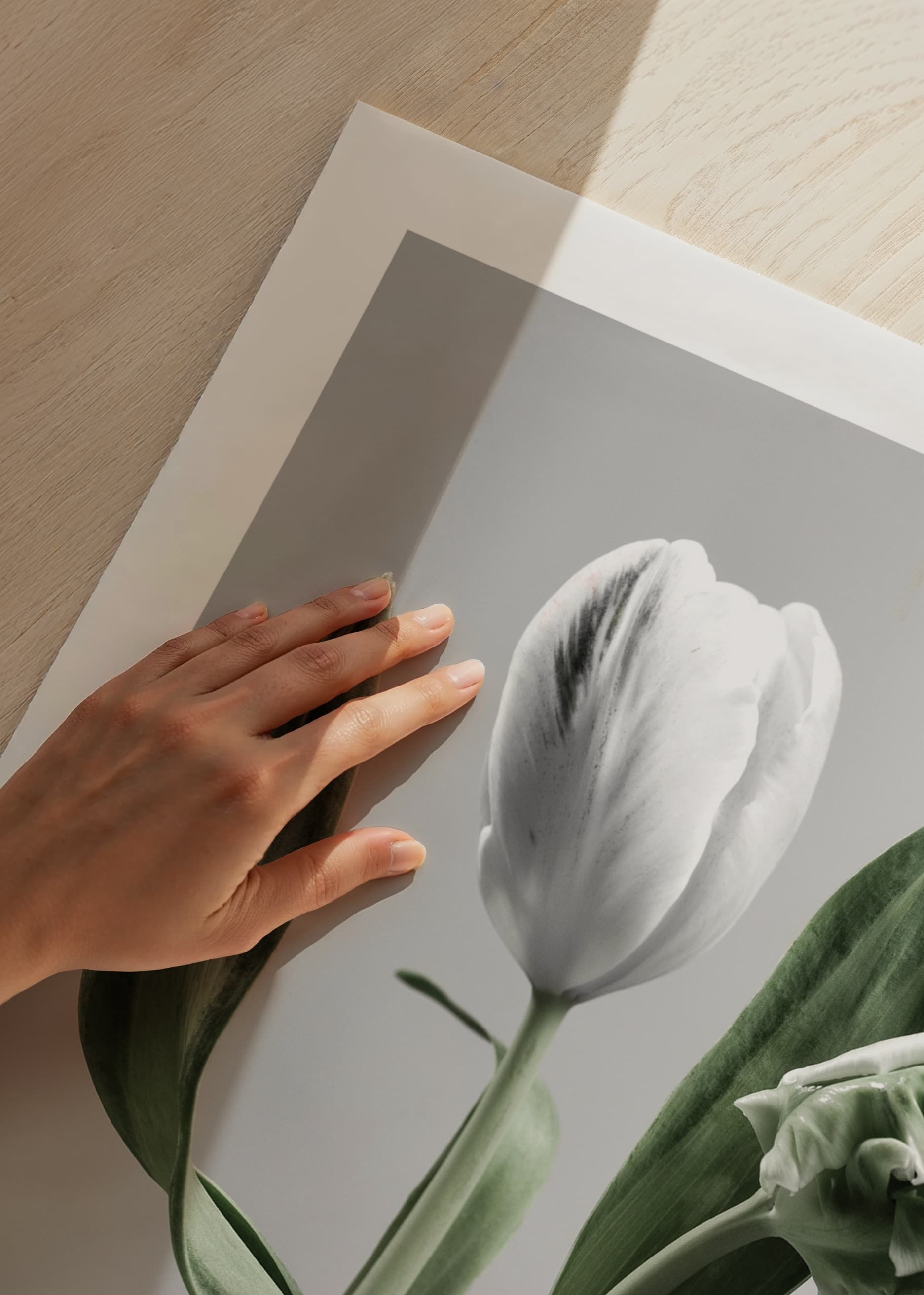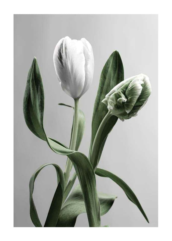 A close-up of two white tulips with distinct green leaves, captured against a soft grey background. The classic design and subtle colours make this botanical poster a discreet and stylish addition to your home. Perfect for a living room, hallway or bedroom for a calm and spring-inspired feel.