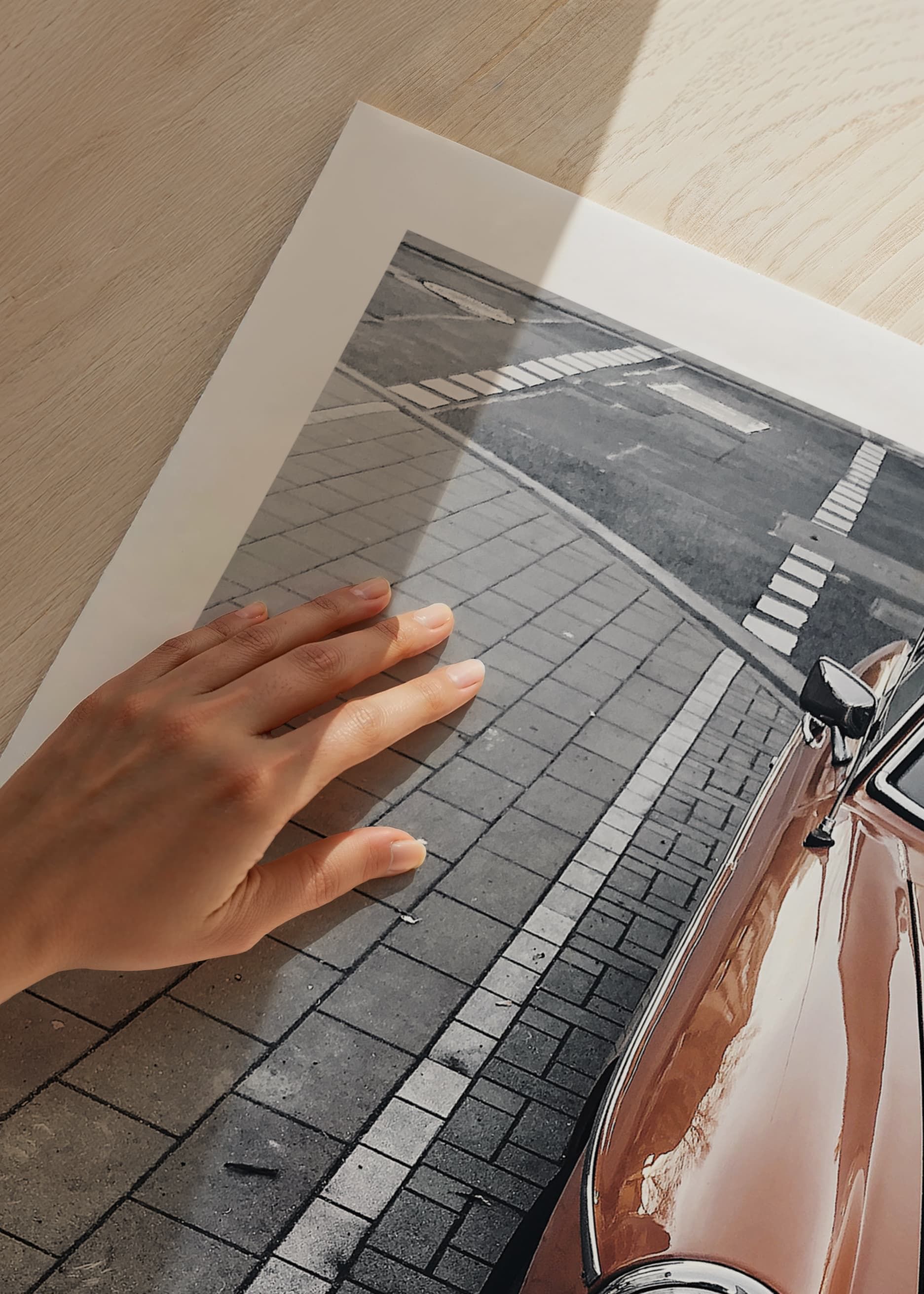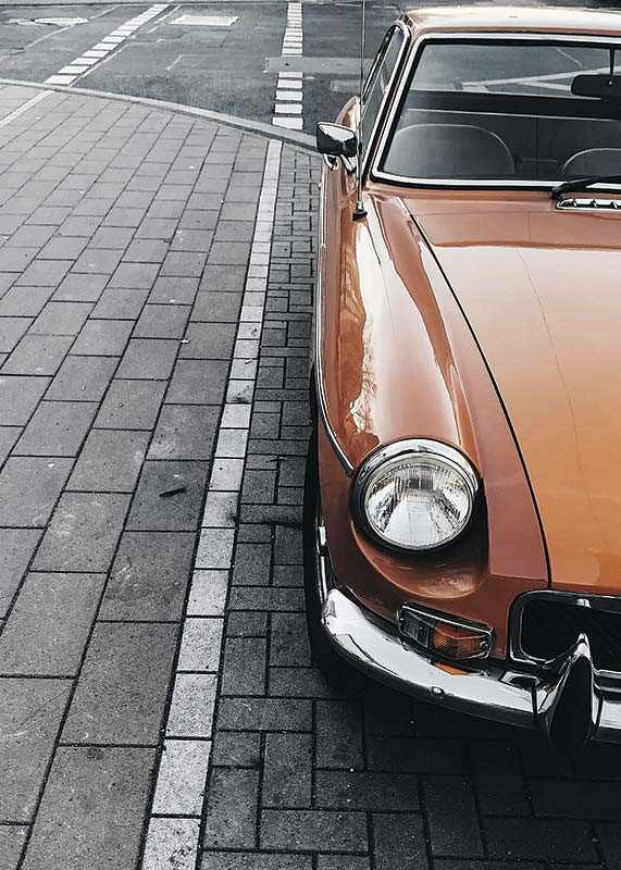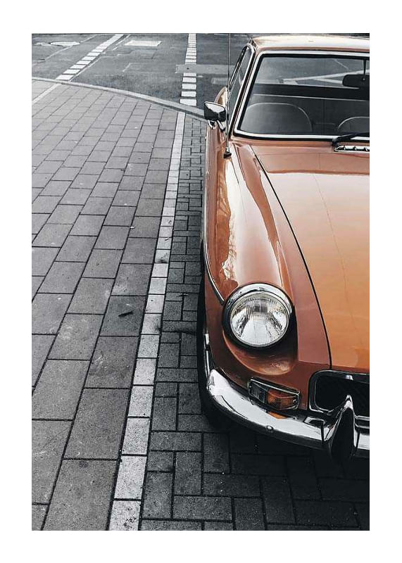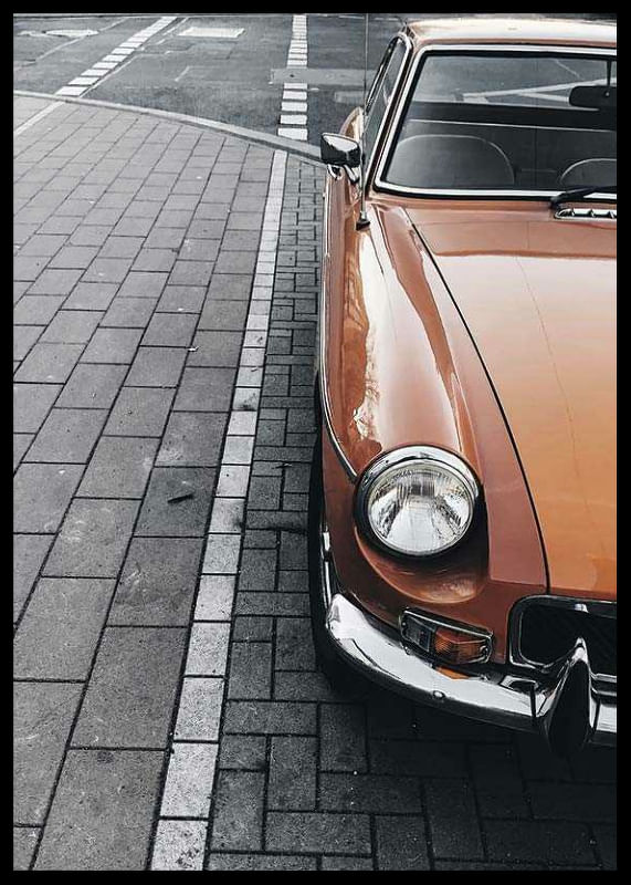 Close-up of the front of an orange vintage car with chrome details, parked along a sidewalk with gray paving stones. Asphalt road and marked lines are visible in the background. Detailed poster with an urban feel that fits in a hallway or living room and gives a timeless character to the room.