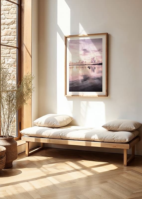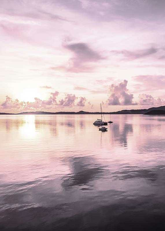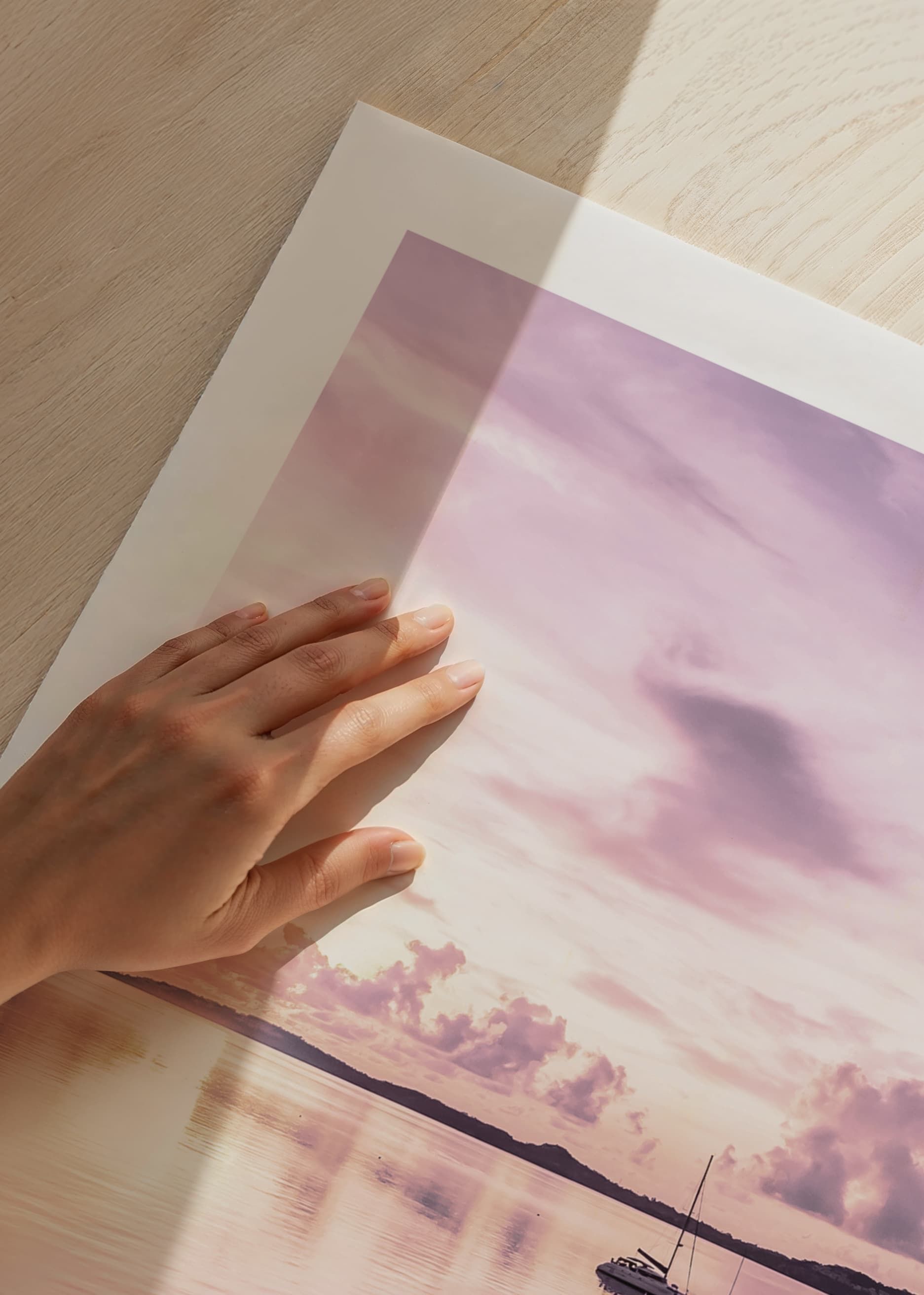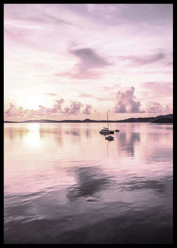 The motif consists of a calm sea off the coast of Thailand, where a lone sailboat rests on the water. The sky and water are colored in soft purple and pink tones from the sunset, while low mountains are visible in the background. With its dreamy colors, this poster brings a tranquil atmosphere to a bedroom or living room.