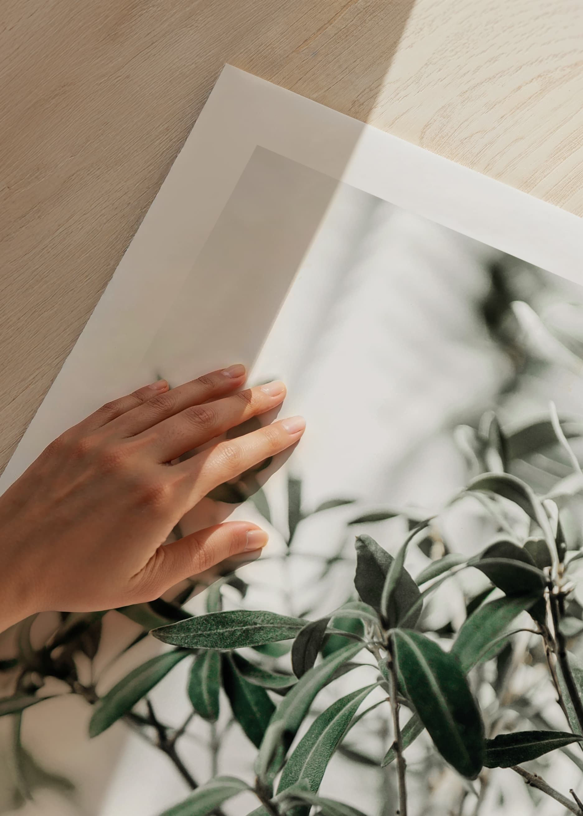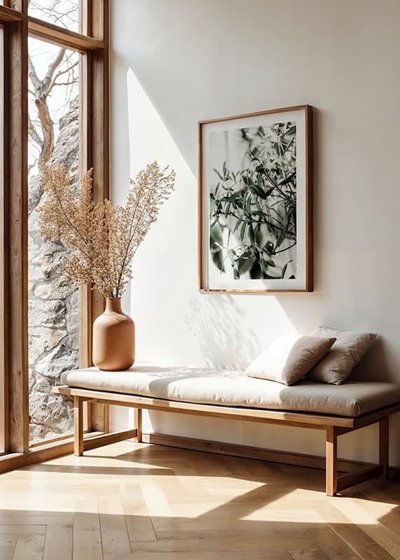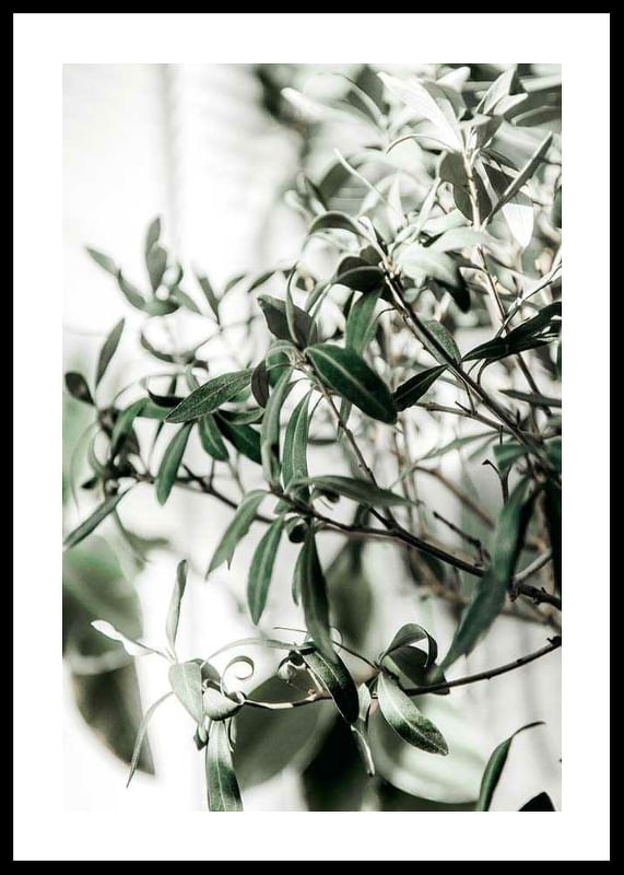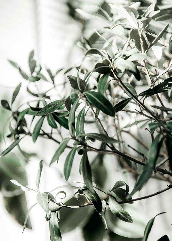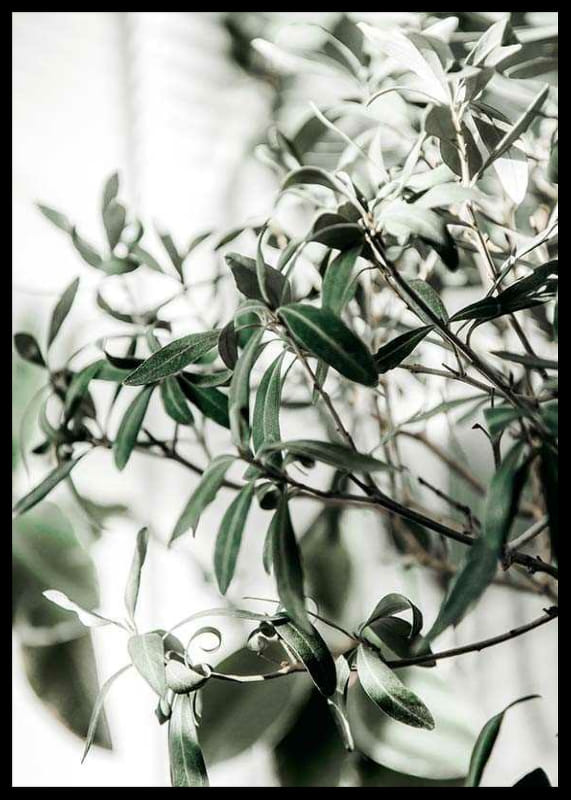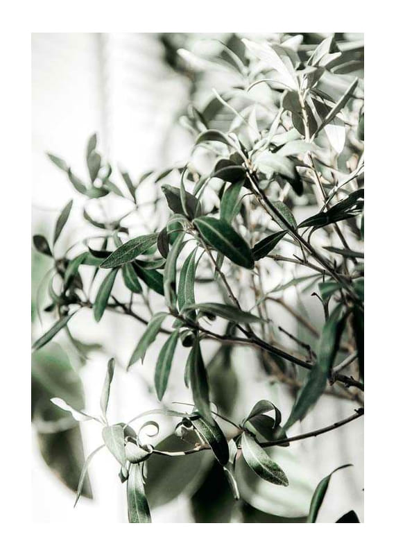 A close-up of the olive tree's narrow, gray-green leaves and thin branches against a light, blurred background. The natural details and soft green tones give the poster a fresh and timeless expression, making it easy to combine with other botanical motifs in both the kitchen and living room.