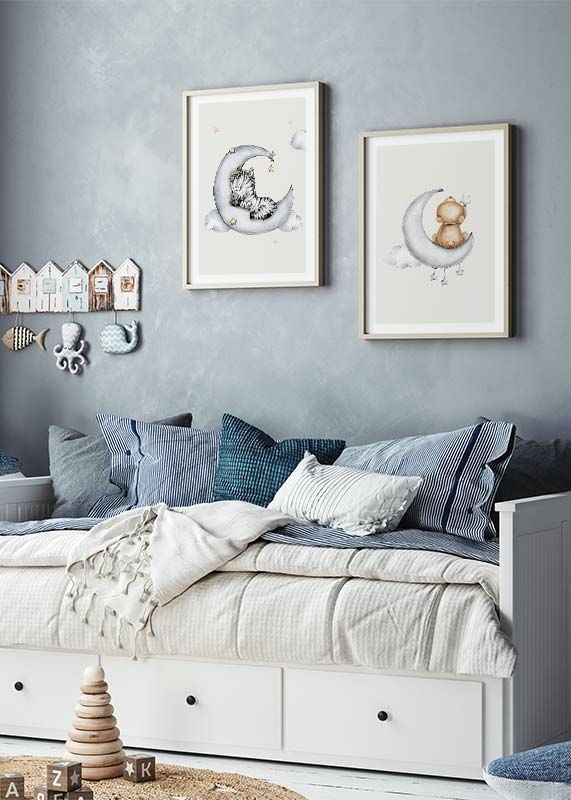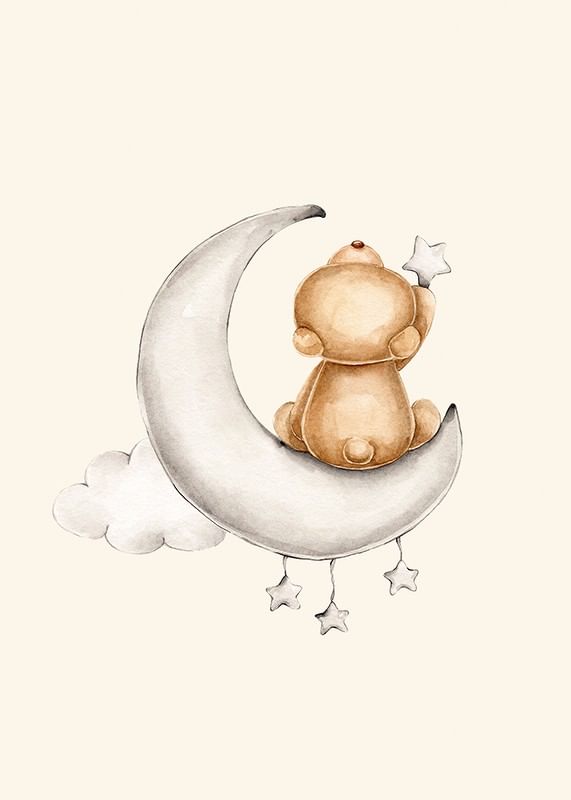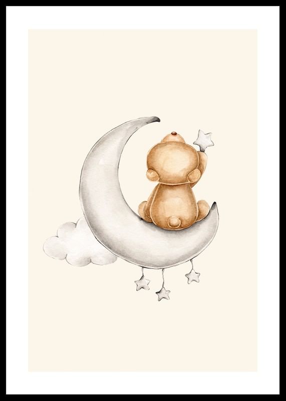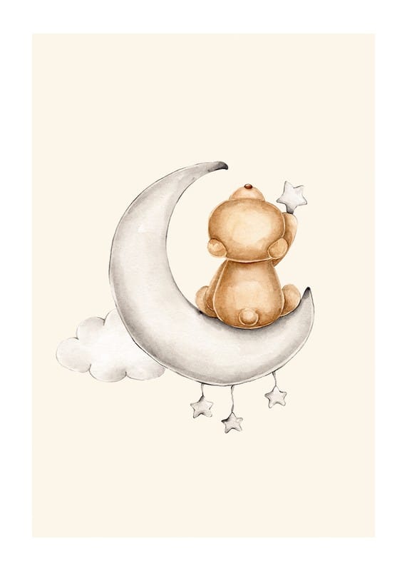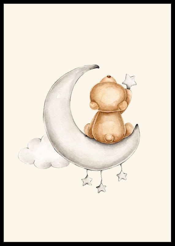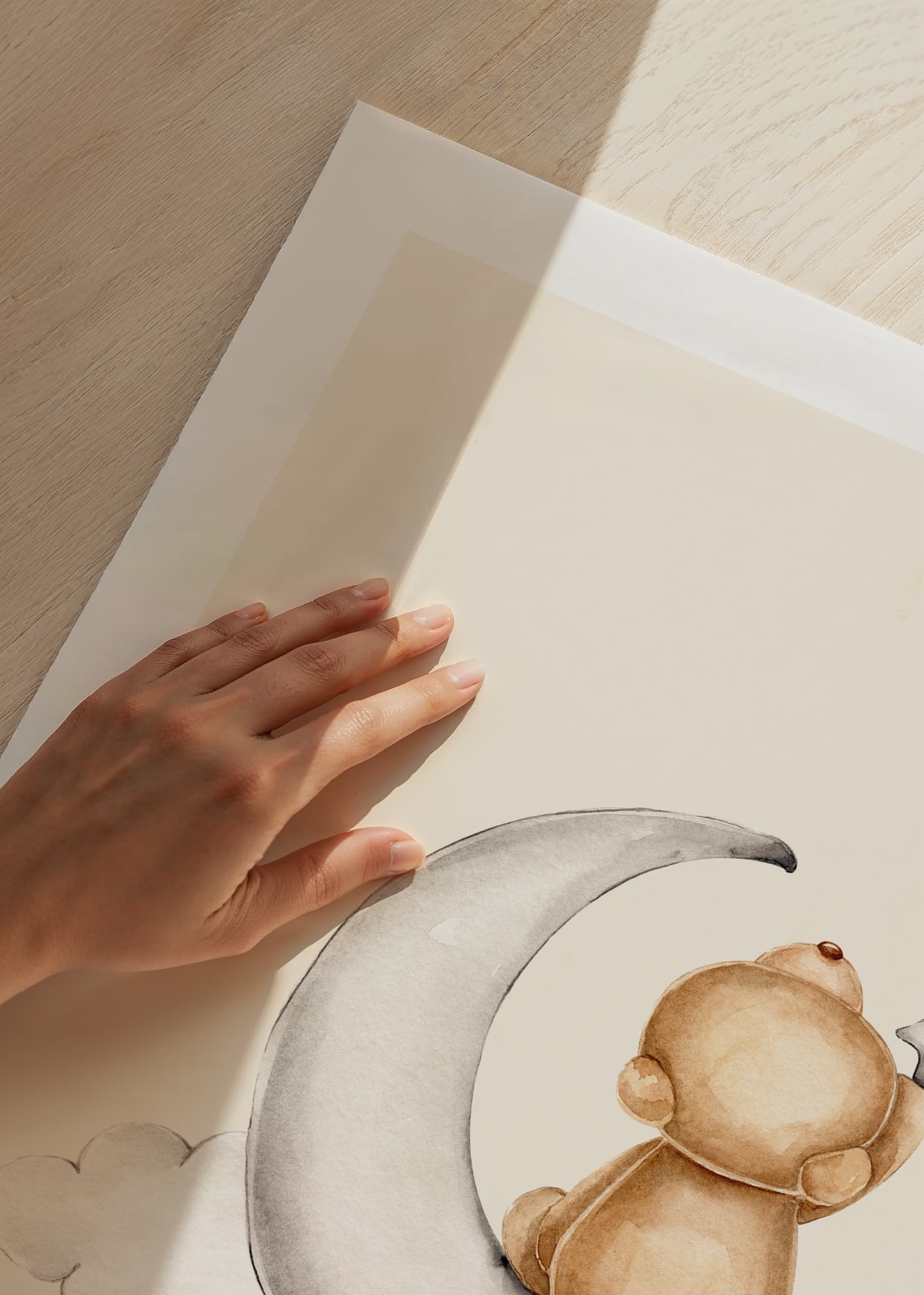 A cute watercolor illustration of a brown teddy bear sitting on a gray crescent moon. The bear is holding a star in his hand, and under the moon hang three small stars. A soft cloud shape is visible in the background and the motif has a light beige base. This poster gives a playful feel to the children's room and fits nicely in calm environments.