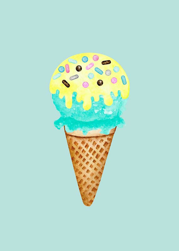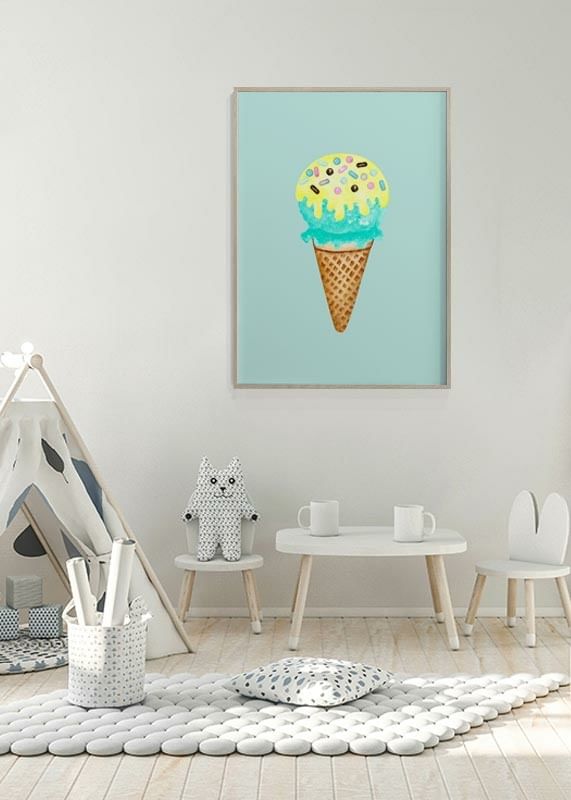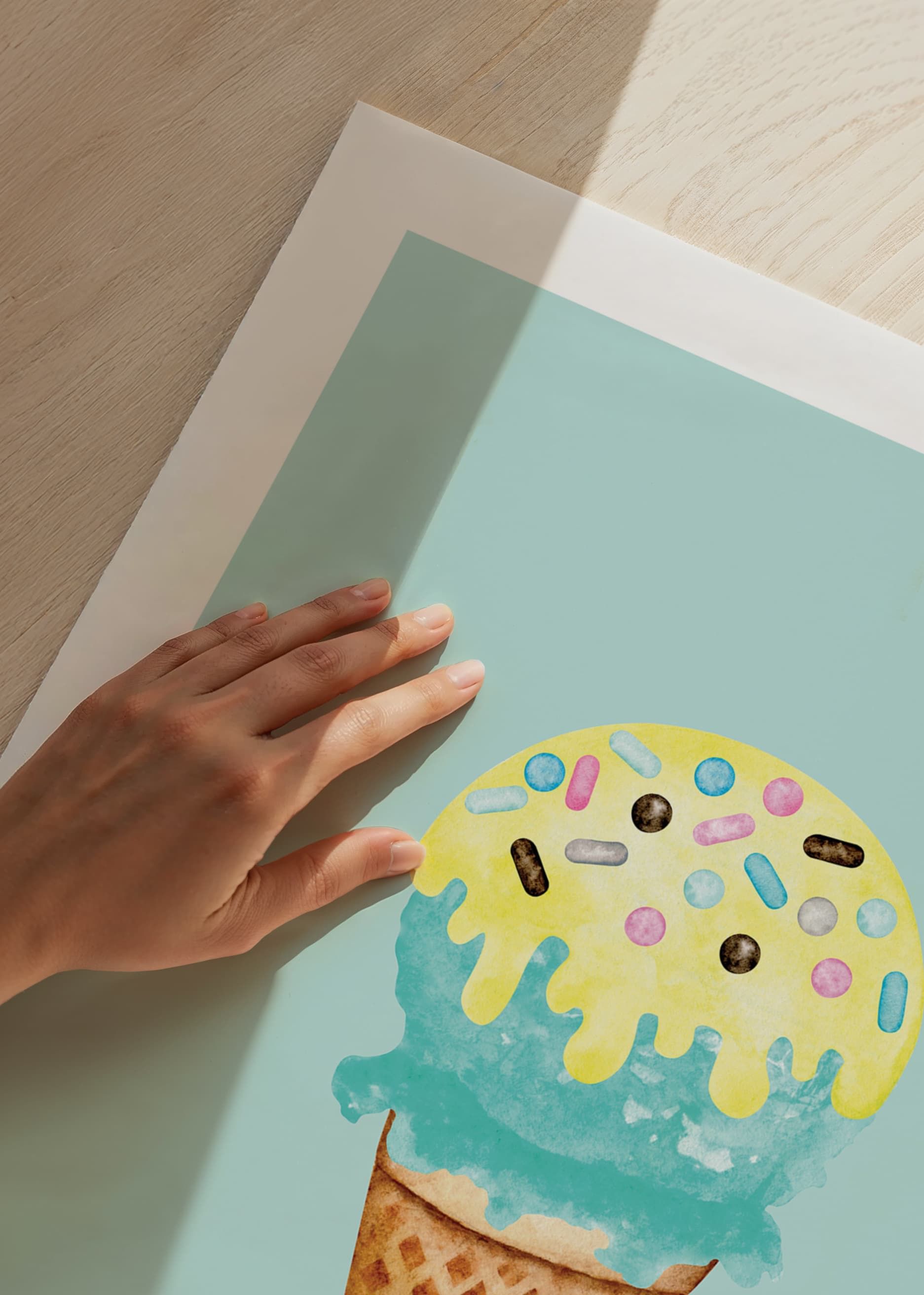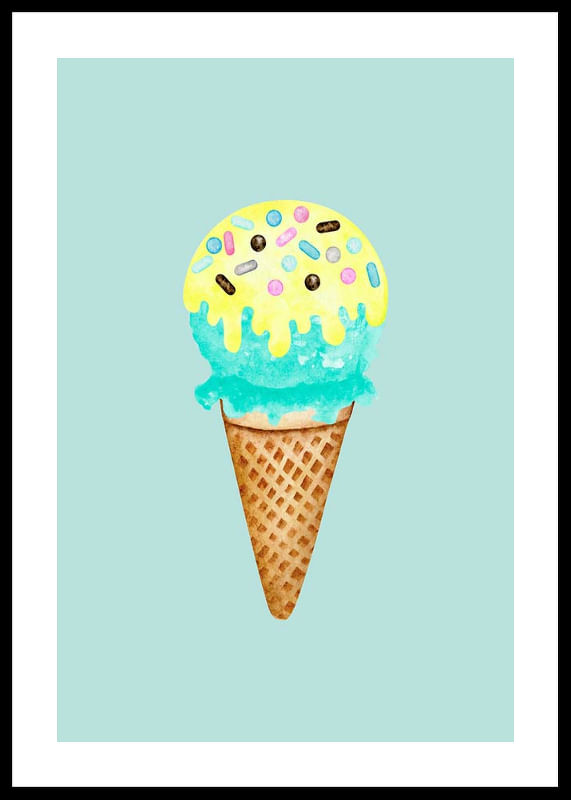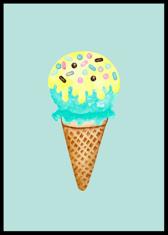 A colorful illustration shows an ice cream cone filled with turquoise ice cream, topped with yellow frosting and colorful sprinkles. The background is a solid light blue, which highlights the vibrant tones and makes the motif playful. This poster will add joy and a lighthearted feel to a child's room or playroom.