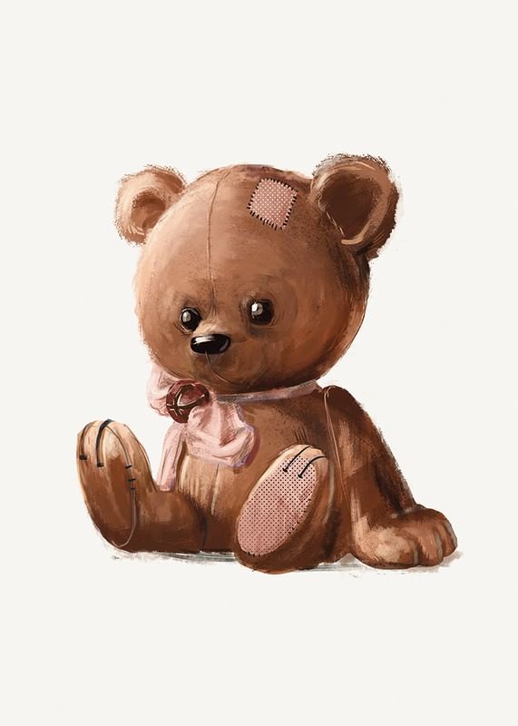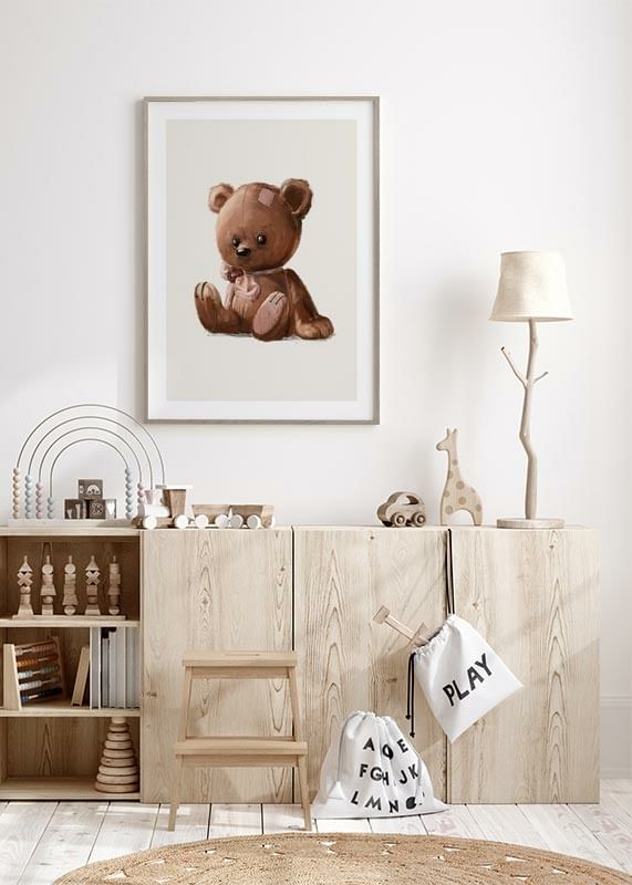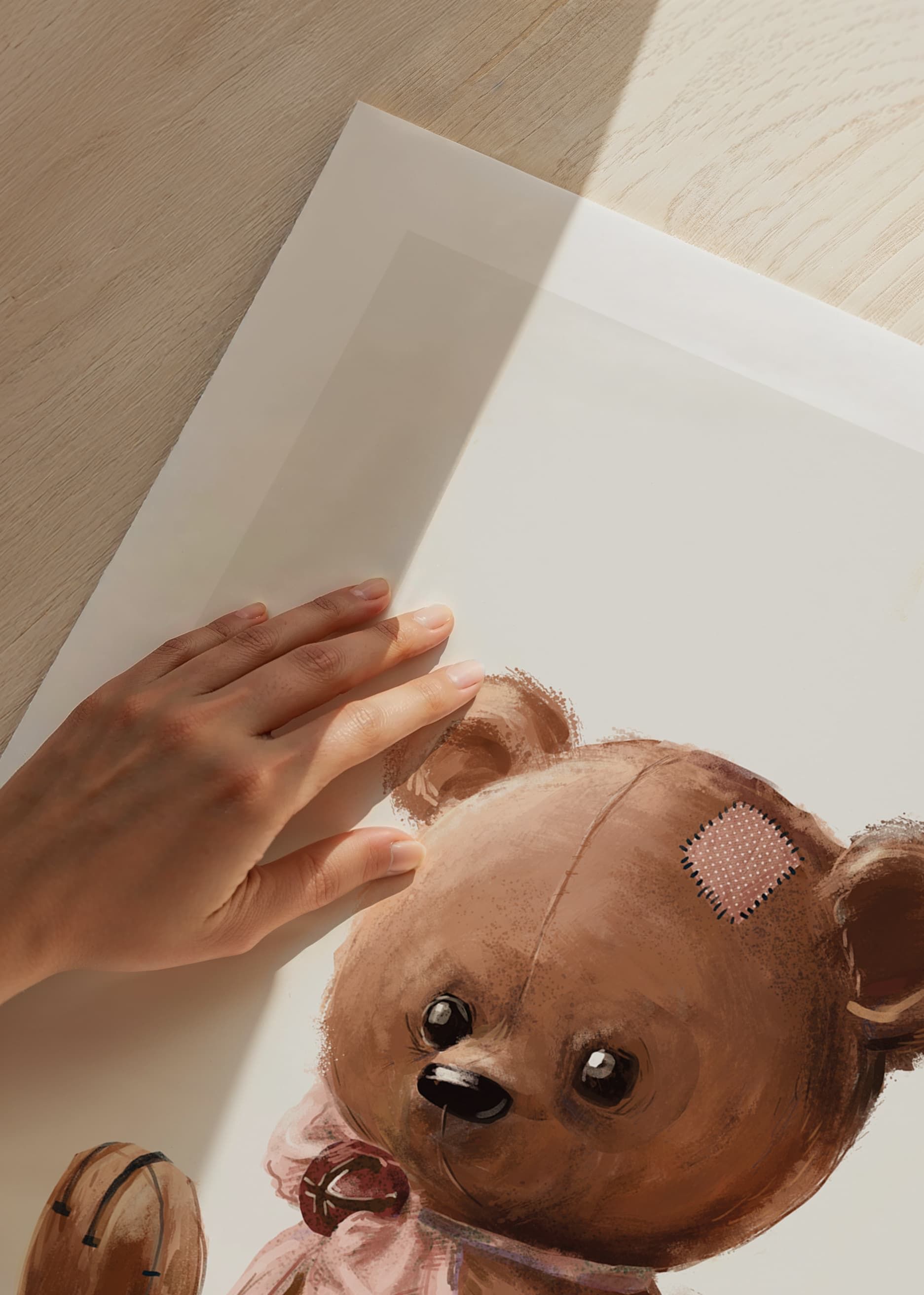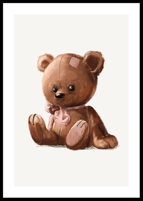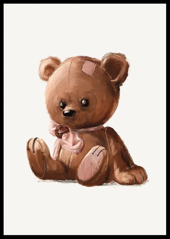 Sitting teddy bear in shades of brown, illustrated with clear stitched details, patches on head and paw and a pink bow around the neck. Soft, light background highlights the bear's round shapes. This poster creates an inviting and nostalgic atmosphere in children's rooms and fits well in various children's environments.
