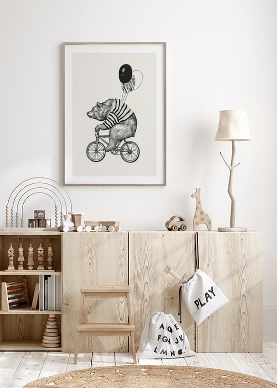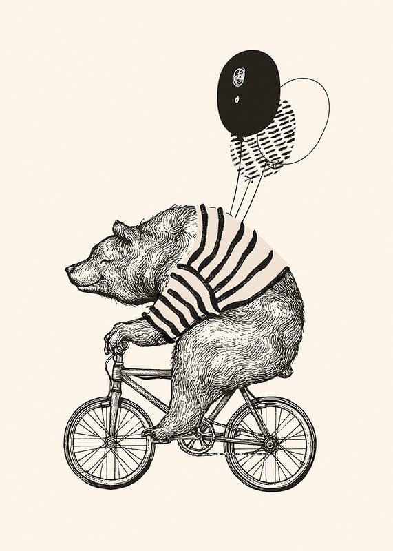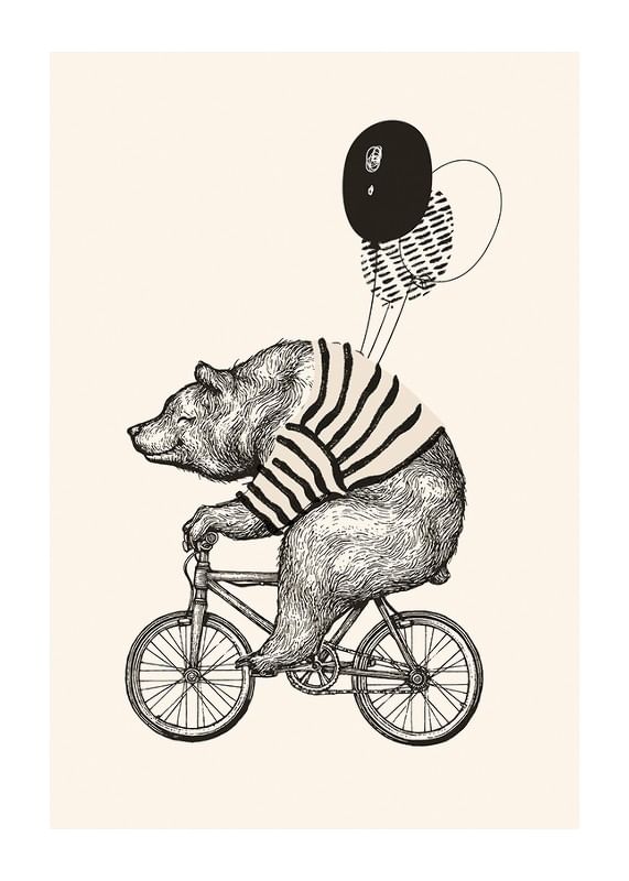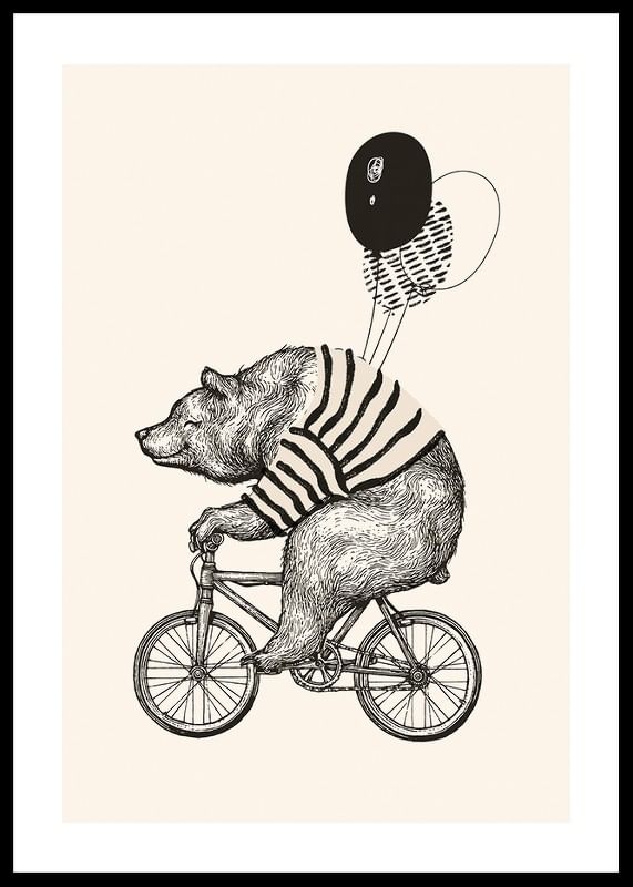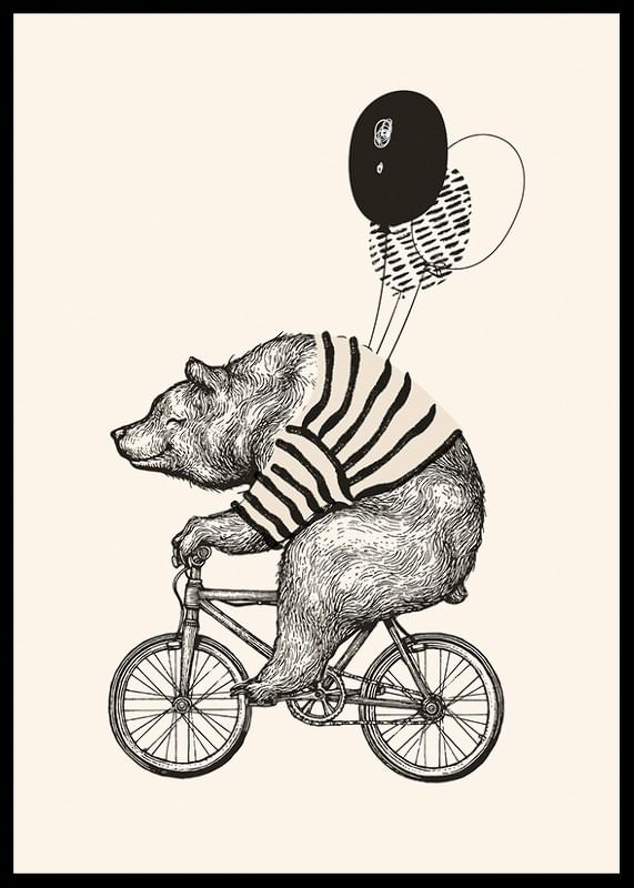 Pencil drawing of a bear in a striped sweater riding a bicycle in profile, with two black balloons floating above his back. Soft contrasts against a light beige background create a playful and stylish expression. This poster is an expressive choice for children's rooms and also fits into playful family spaces.