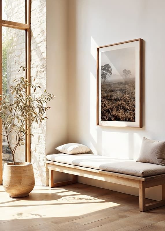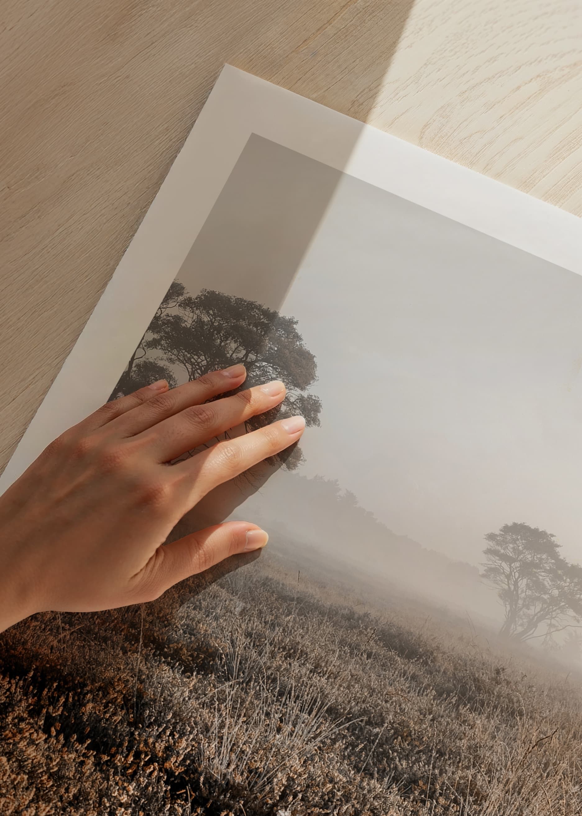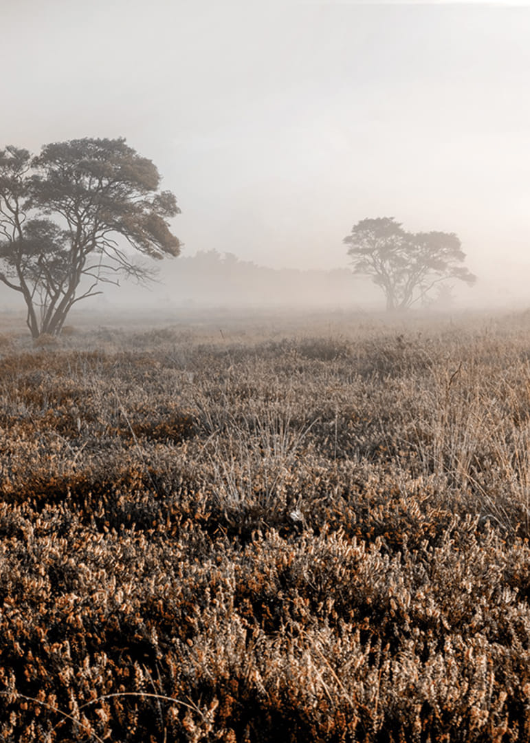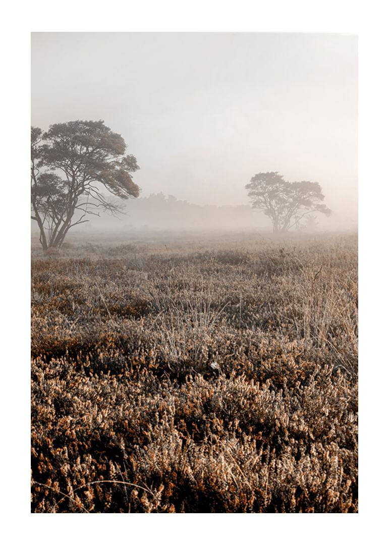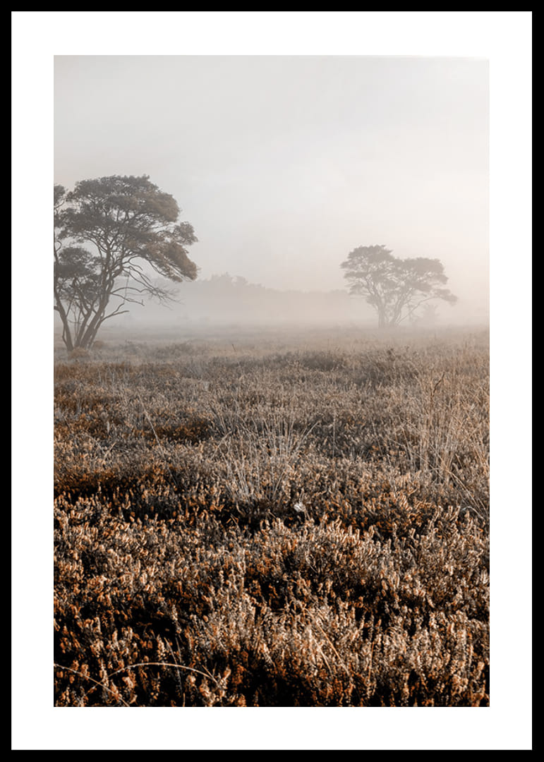 Low-growing grass and plants in warm brown and beige tones spread across an open field with a few sparse trees nestled in light morning mist. Neutral color scheme and soft light create a calm, natural impression. This poster adds a peaceful autumn feel to a living room or hallway.