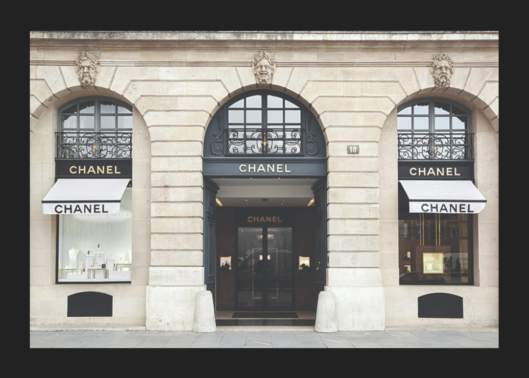 Facade of a Chanel store with tall arched windows, elegant black signs and awnings against a light beige stone building. The style combines classic architecture with modern design. This poster gives a subtle sense of fashion and big city life, and is perfect for a living room, hallway or office.