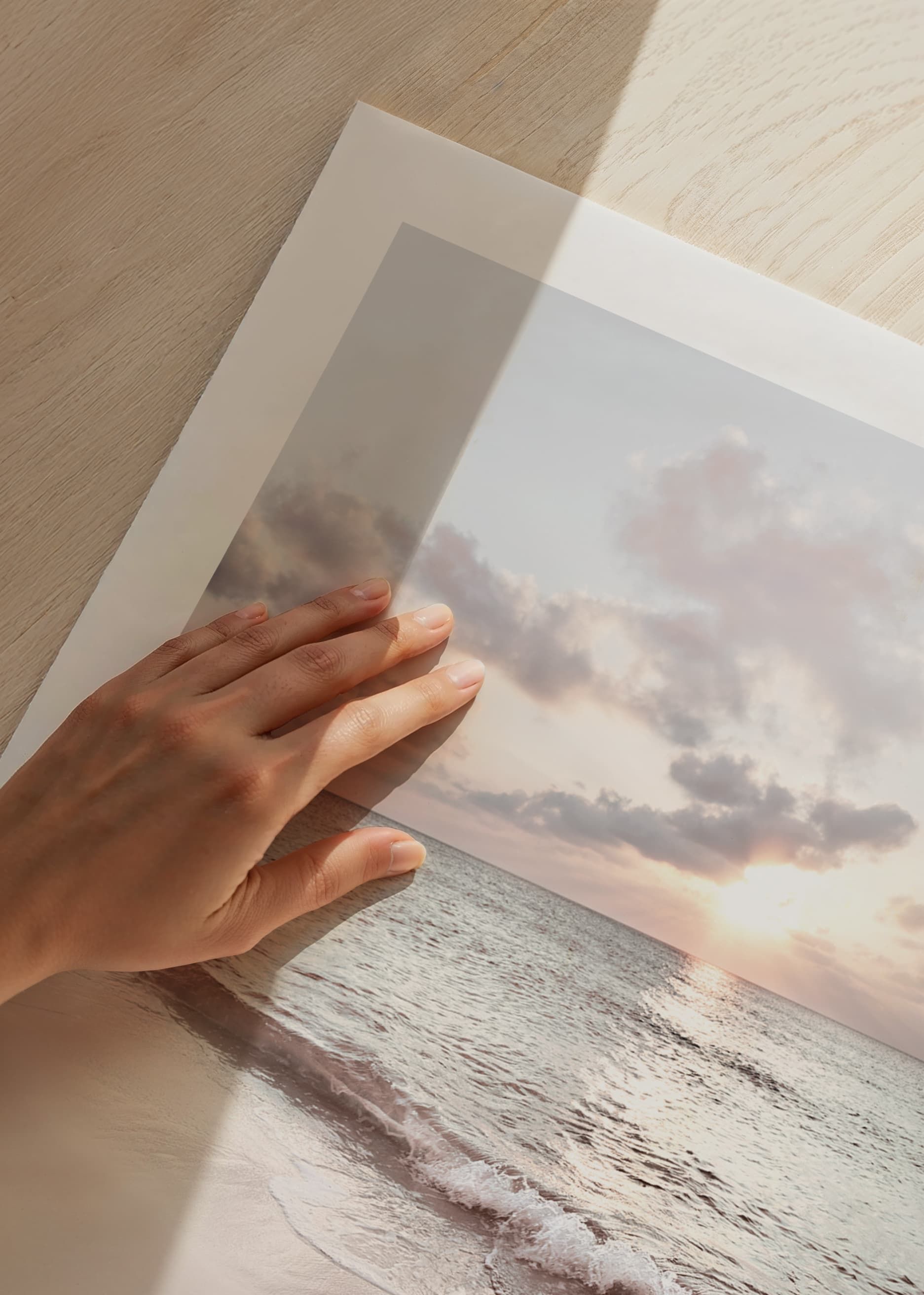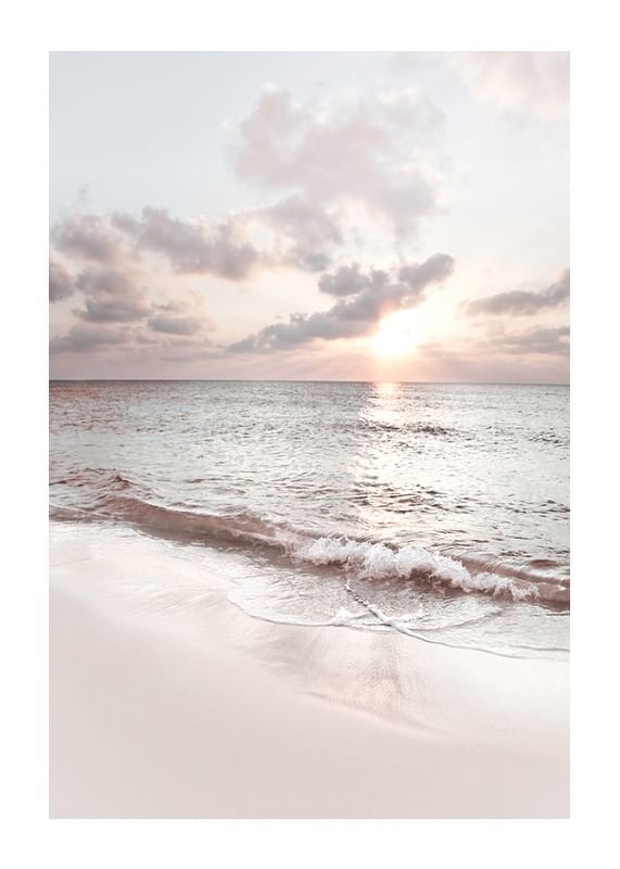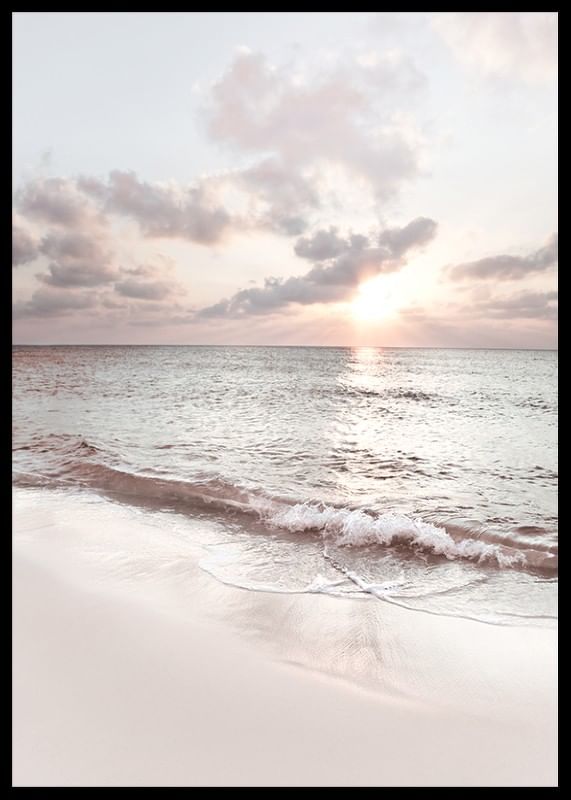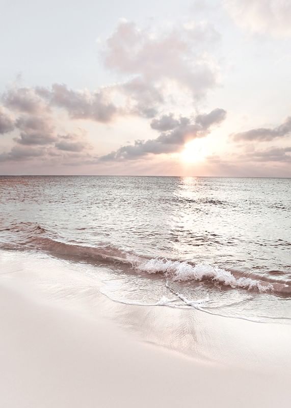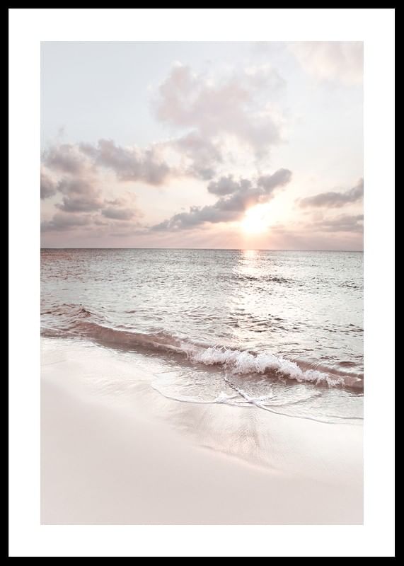 The motif consists of gentle waves rolling onto the light sand of Seven Mile Beach. The sun is visible low over the horizon and reflected on the water's surface, while pastel-colored clouds characterize the sky. With its calm expression, this poster is suitable for bedrooms, living rooms or workplaces for a peaceful feeling.