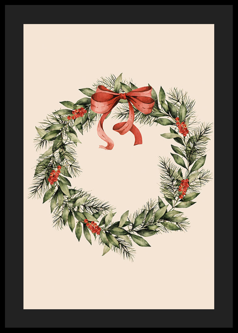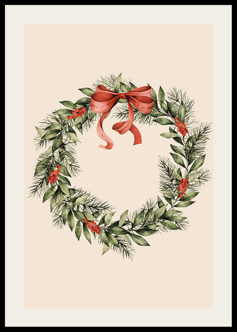 The motif consists of a classic Christmas wreath with green leaves, pine branches and red berries, adorned with a large red bow at the top. The sand-colored background gives a light and airy impression. This poster gives a subtle Christmas feel and works well as a seasonal decoration in the hallway, living room or kitchen.