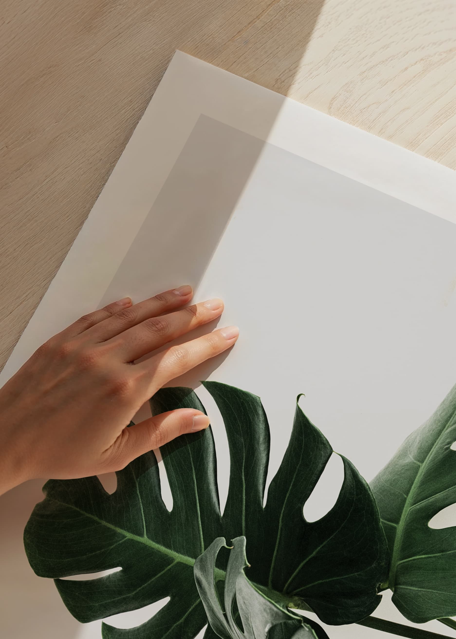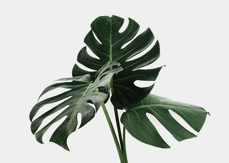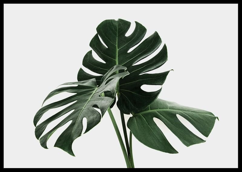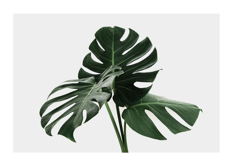 Large, deep green leaves from a monstera plant stand in focus against a uniform light gray background. The clear cuts and holes in the leaves give the motif a graphic feel. The minimalist composition highlights the plant's shape in a timeless way. A botanical poster that gives a fresh expression to modern interior environments.