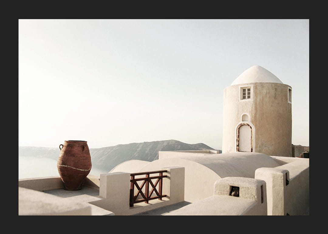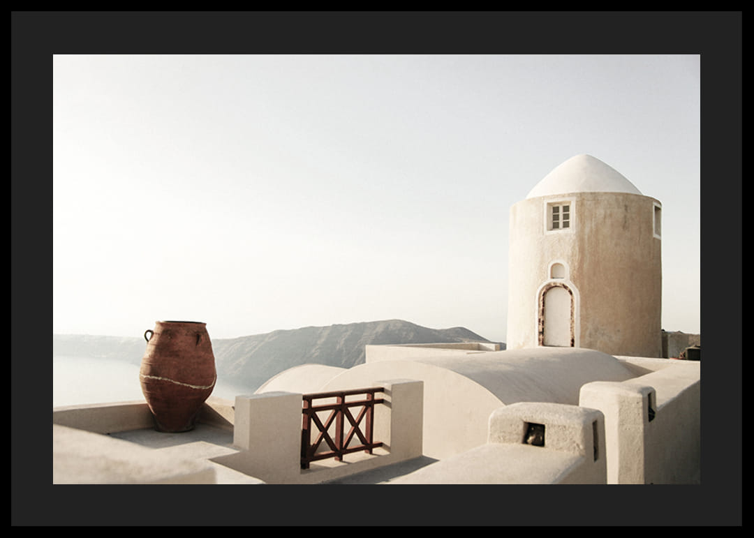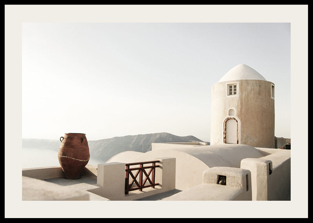 Whitewashed houses with rounded architecture and an old terracotta pot dominate the motif in this poster, with mountains and sea in the background. Soft sunlight highlights the bright surfaces and shadows. The poster captures the feeling of a Greek coastal town and is suitable for both summer homes and modern living rooms where light is desired.