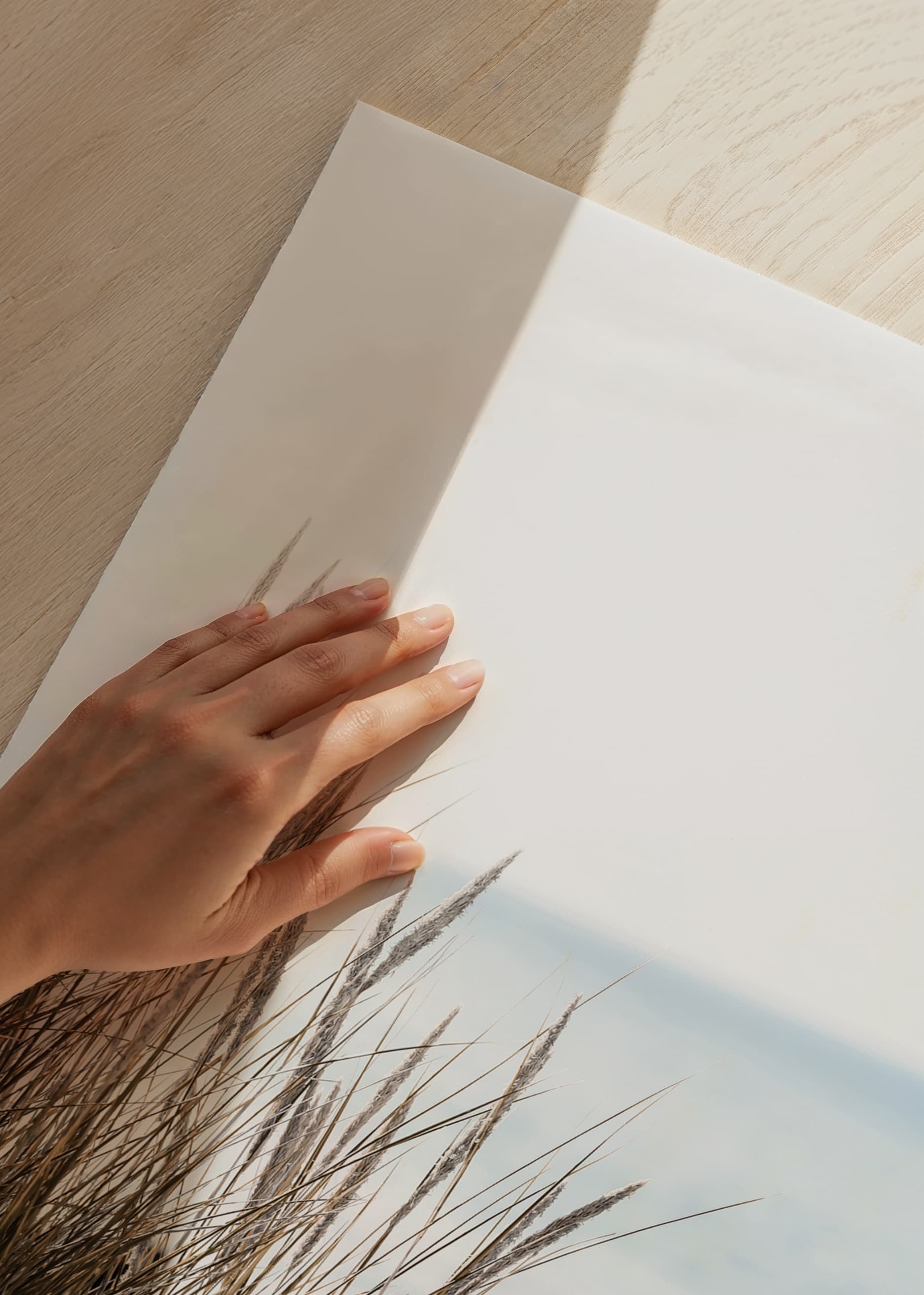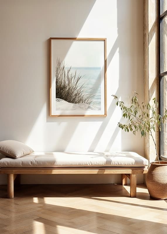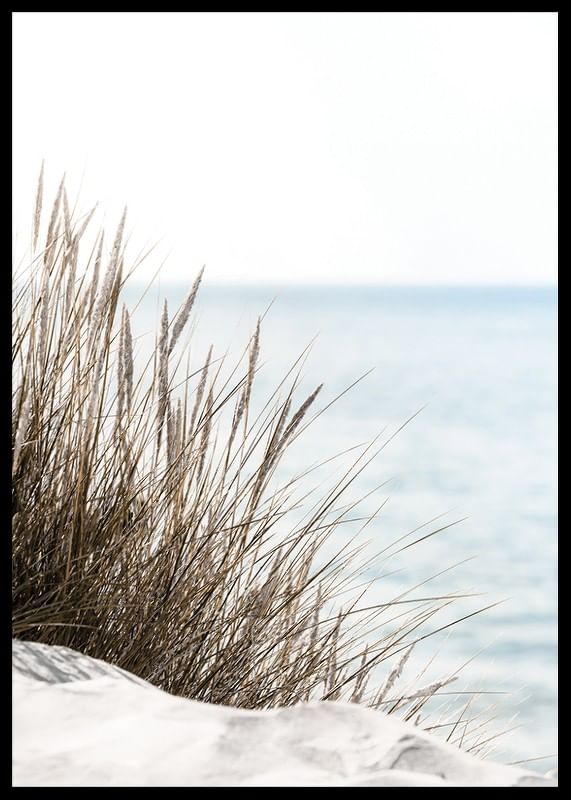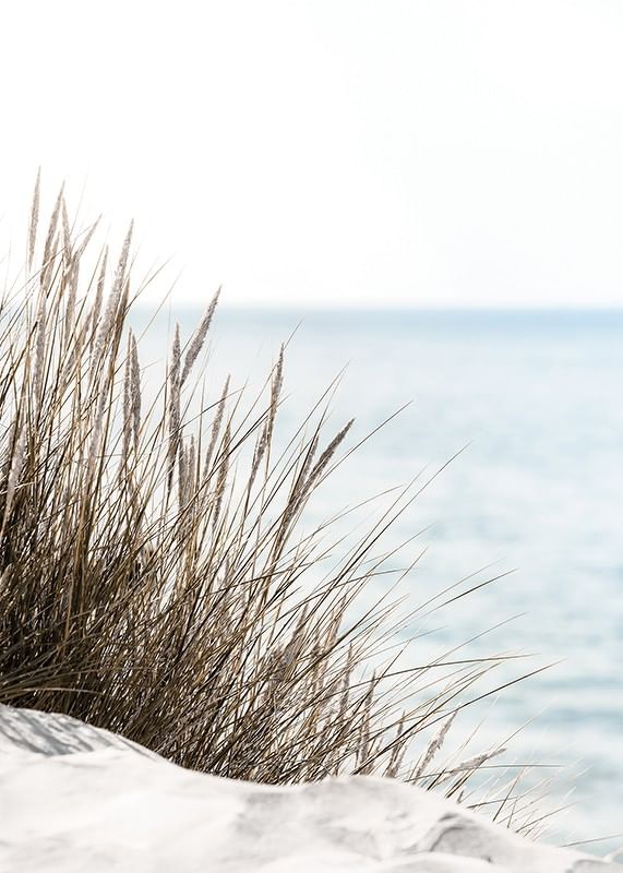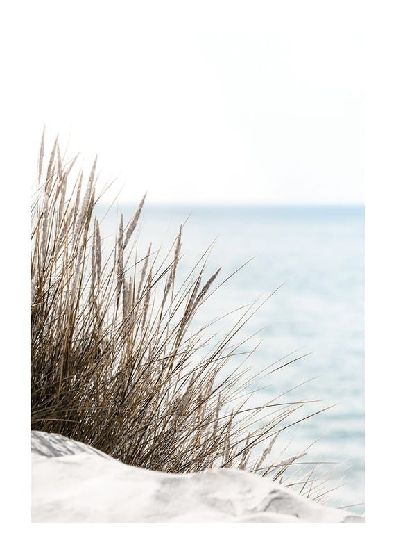 Tall beige-green beach grass rises from light sand, with the sea softly blurred in the background and the sky bright blue over the horizon. Natural, muted colors and minimalism characterize the motif, making this poster a peaceful element in the living room or bedroom where nature and tranquility can take place.