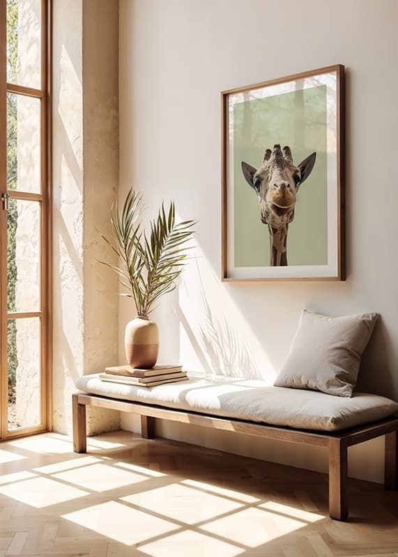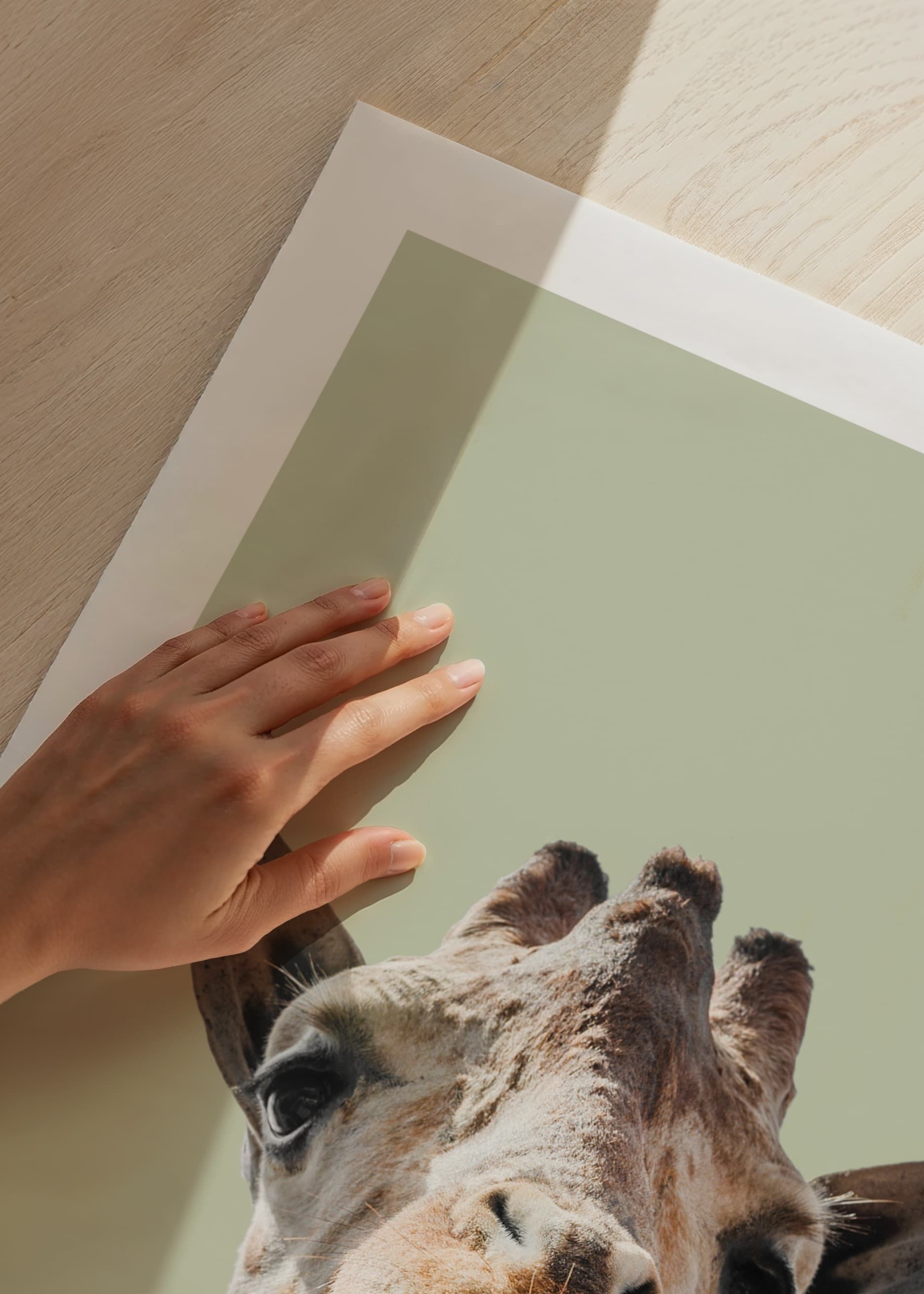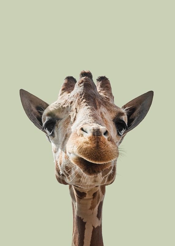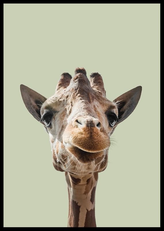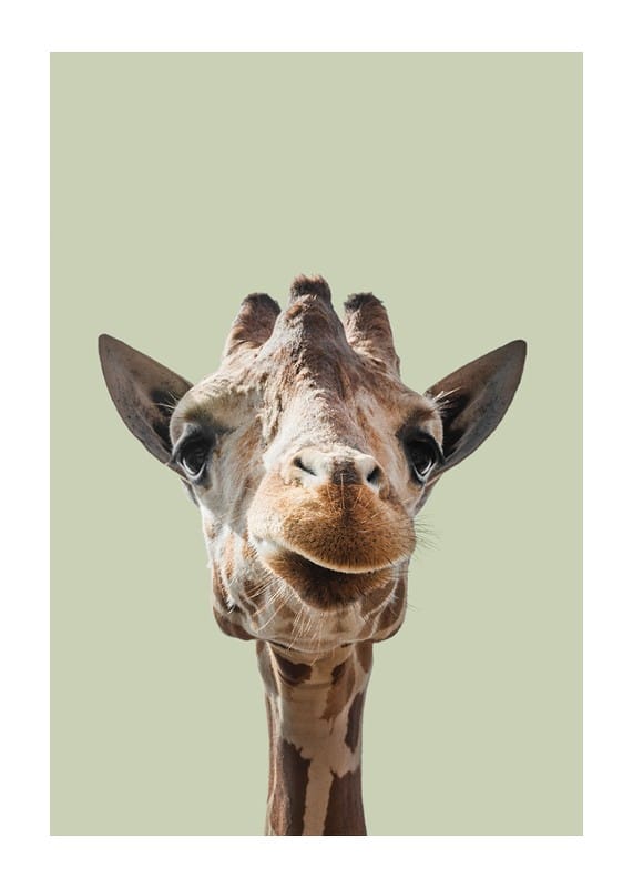 Smiling giraffe portrayed in close-up where the animal's expressive face stands out clearly against a light green and solid color background. The large eyes and soft nose give the motif a playful feel. This poster contributes to a warm and friendly atmosphere and can give a personal touch to children's rooms or playful environments.