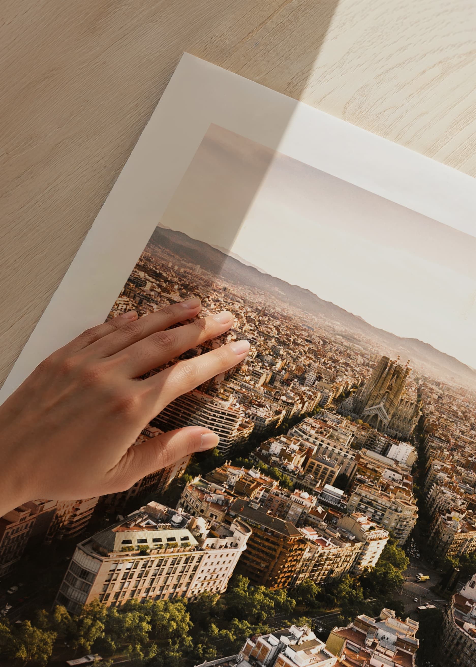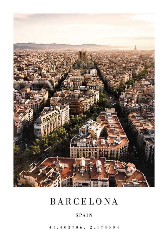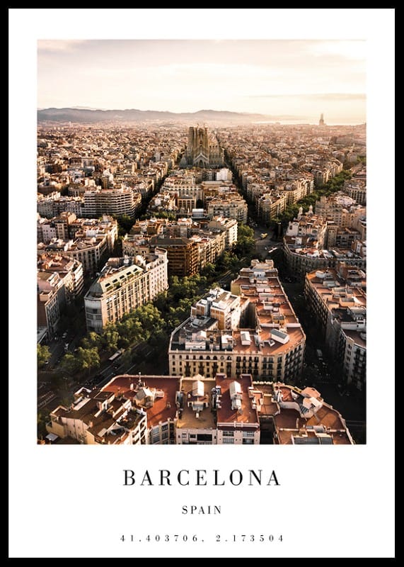 The cityscape of Barcelona, ​​Spain, spreads out in a graphic grid where avenues and buildings lead the eye towards the iconic Sagrada Família. Warm light from the sunset gives the motifs soft tones and clear contrasts between buildings and greenery. A poster that adds urban character to a living room or office.