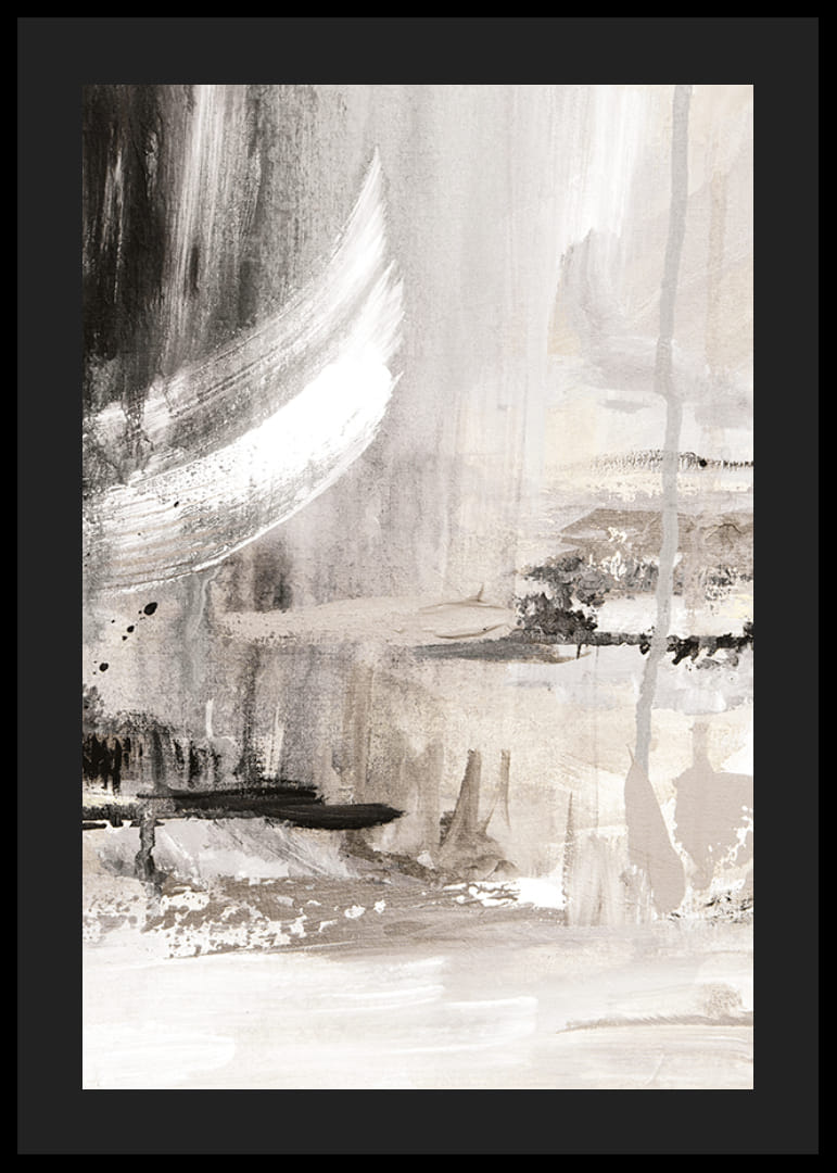 Large and dynamic brushstrokes in black, beige and white interact in this abstract motif. Soft transitions between the color fields are combined with clear contrasts and structure. This poster in neutral tones contributes to a modern feel and is suitable for both living rooms and offices.
