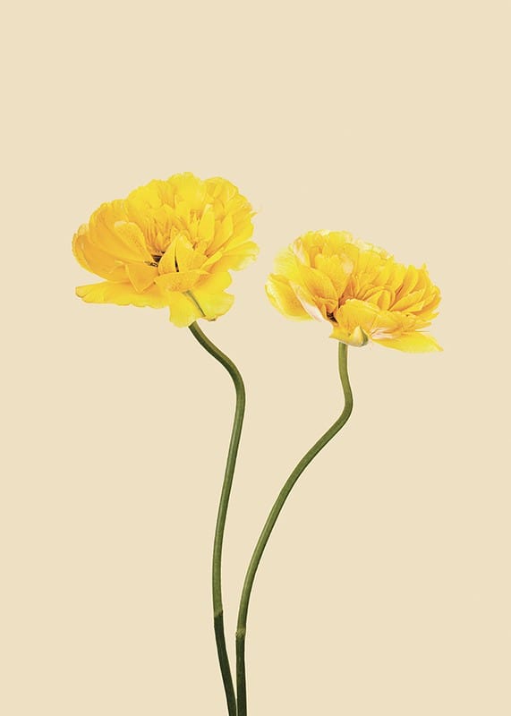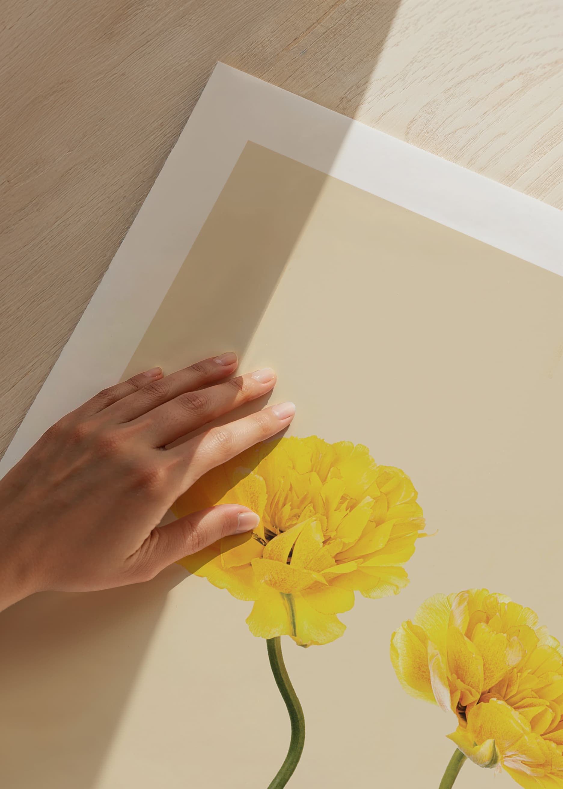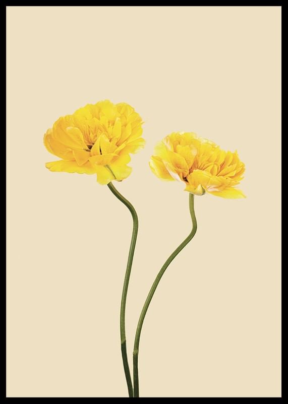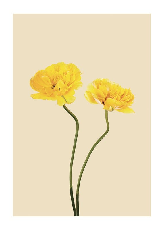 Two bright yellow tulips with full petals stand side by side against a soft sand-colored background. The long, thin stems give the motif a graphic feel and emphasize the shape of the flowers. This poster fits nicely in a hallway or living room and adds a subtle spring feeling to the interior with its warm color tones.