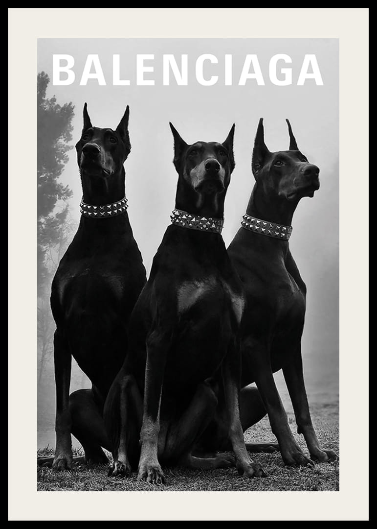 Three stately Dobermans with pointed ears and heavy studded collars sit side by side against a misty background. Above, the text 'Balenciaga' appears in clear letters. The black and white poster combines fashion and strength, and is perfect for a modern hallway, study or living room.