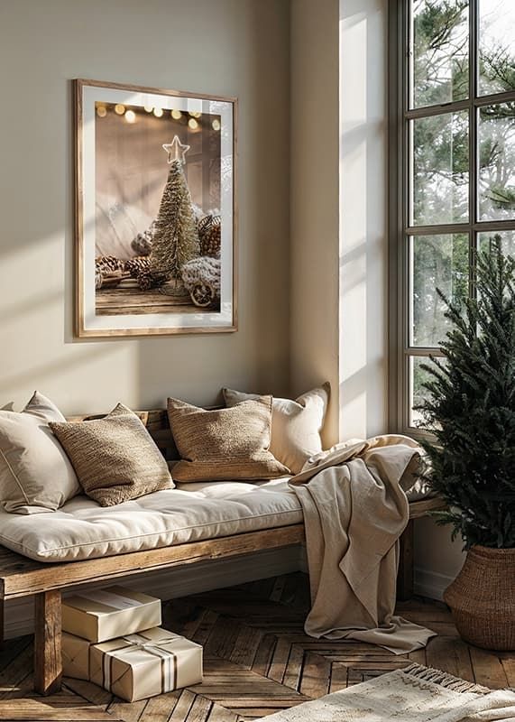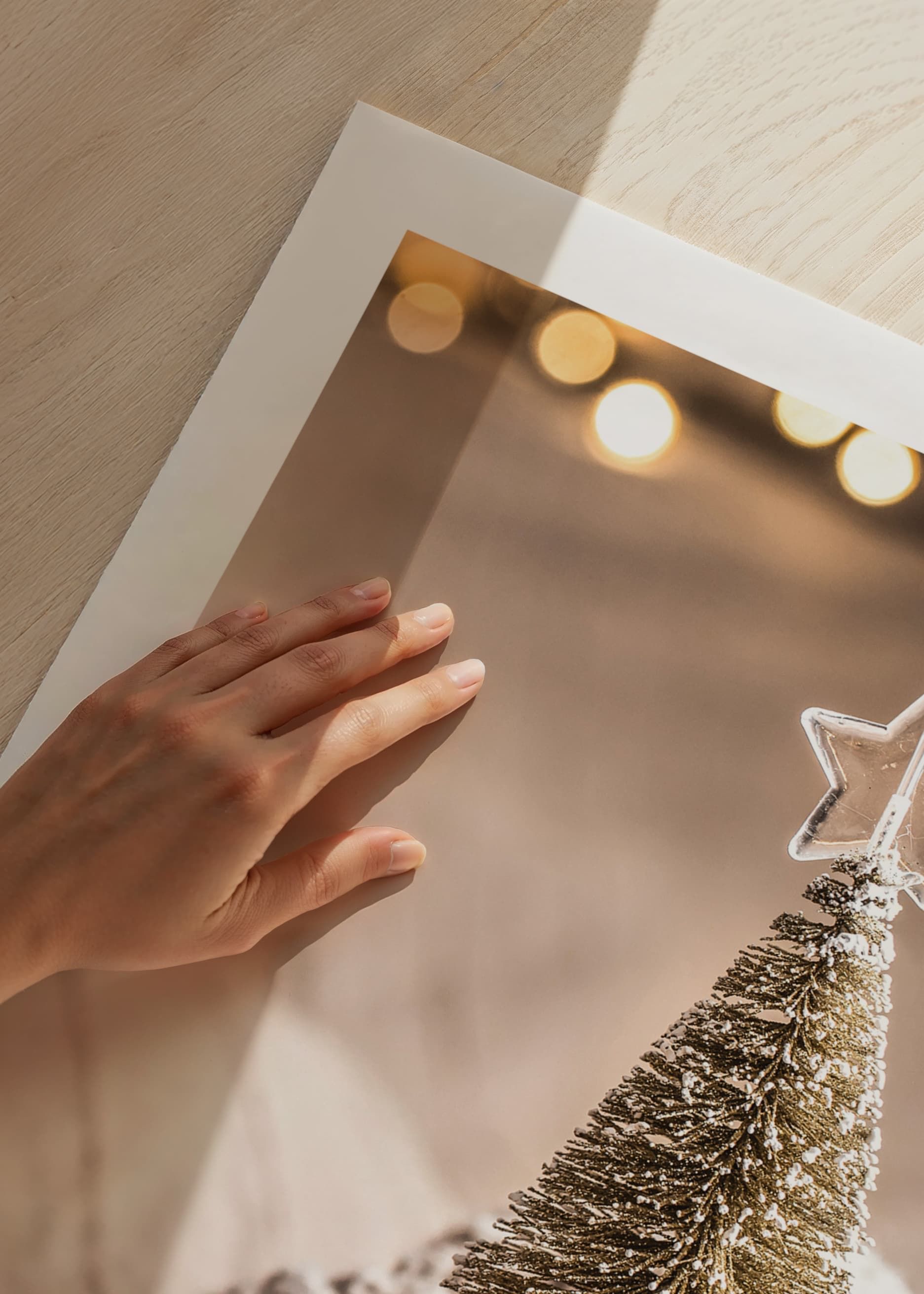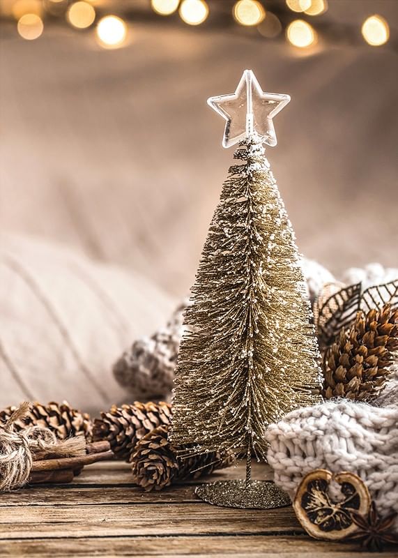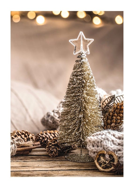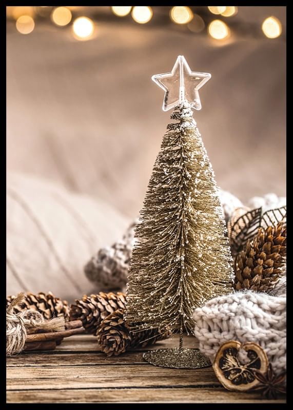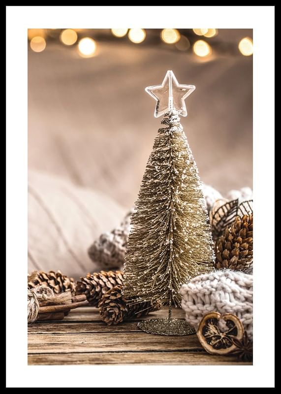 A small decorative Christmas tree with a sparkling snow effect and a star on top stands surrounded by pine cones, cinnamon sticks, dried orange slices and knitted fabric. Warm, blurred string lights in the background create a seasonal expression. This poster gives a winter feel to, for example, a hallway or kitchen.