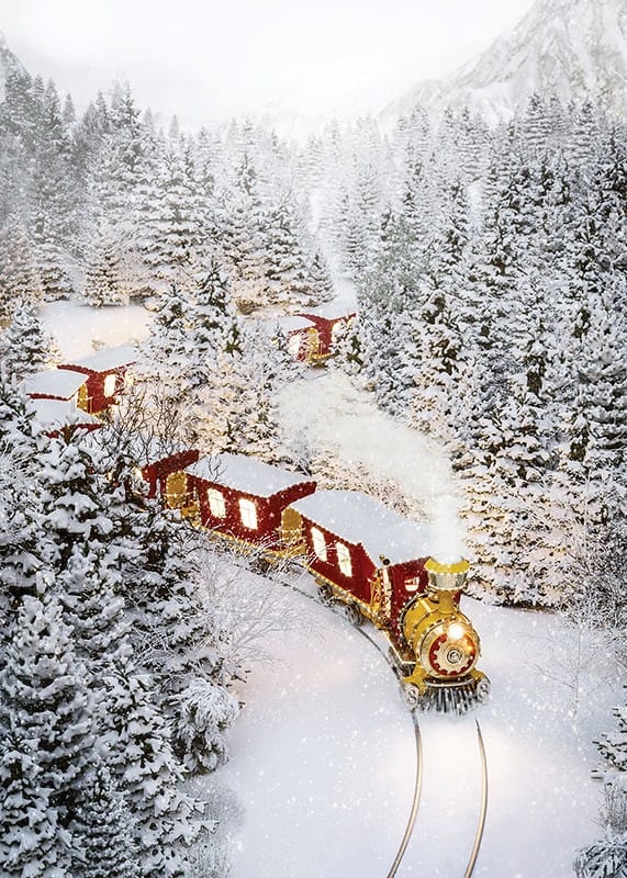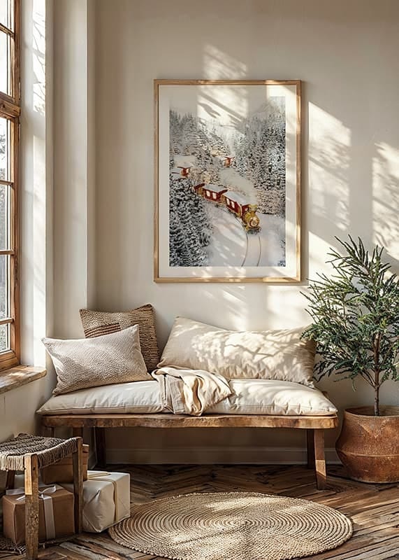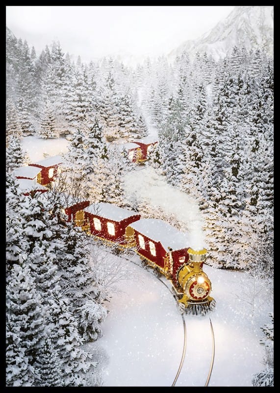 A red and gold train winds its way through dense, snow-laden fir trees and soft winter white landscapes. The motif is characterized by sparkling lights from the train's windows, creating a warm contrast to the frosty surroundings. This poster adds an atmospheric winter feel to a child's room or at the Christmas gathering place.