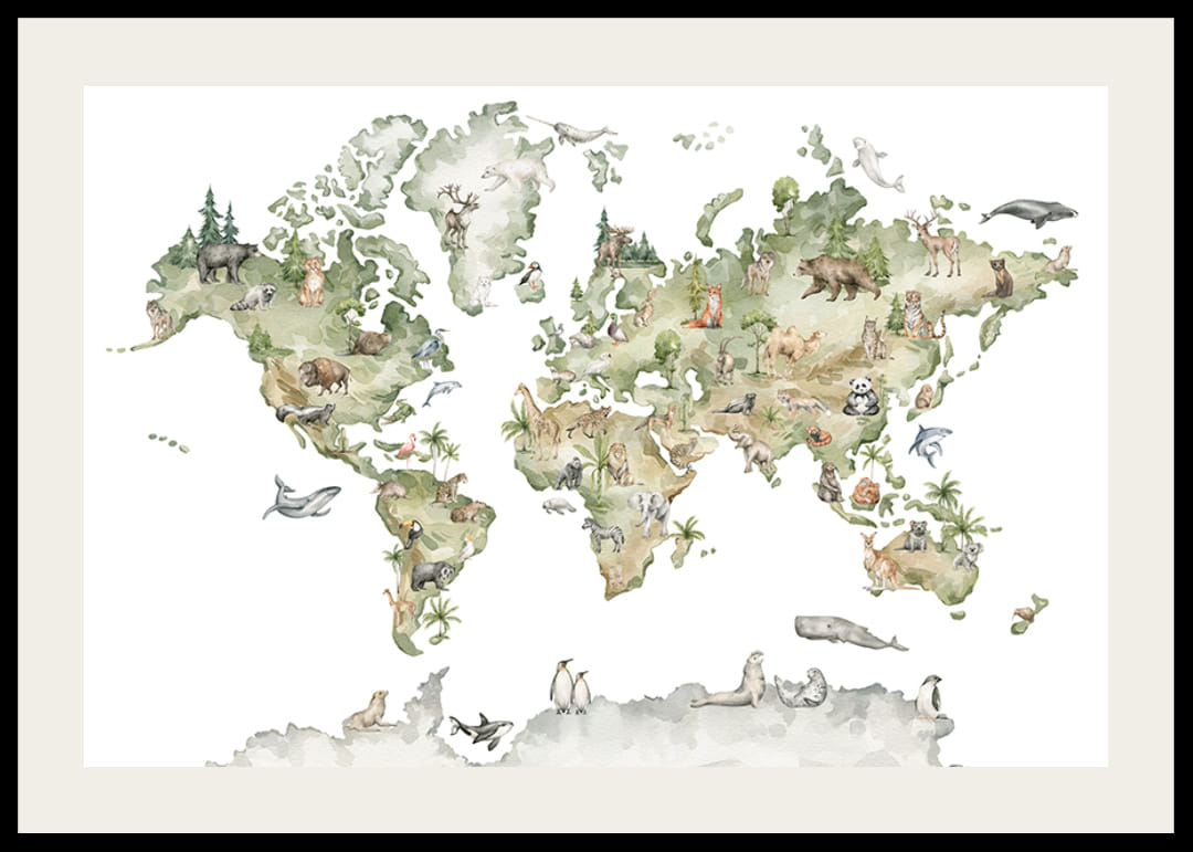 The motif consists of a world map with different animals on their respective continents. The colors are in soft green and brown shades against a white background, and the animals are illustrated in detail with natural elements. This poster is particularly suitable for children's rooms and arouses curiosity about animals and geography.