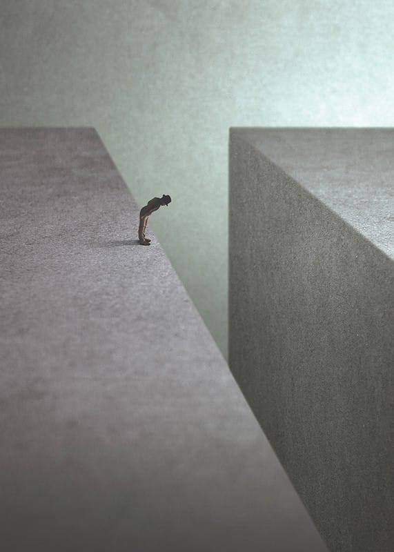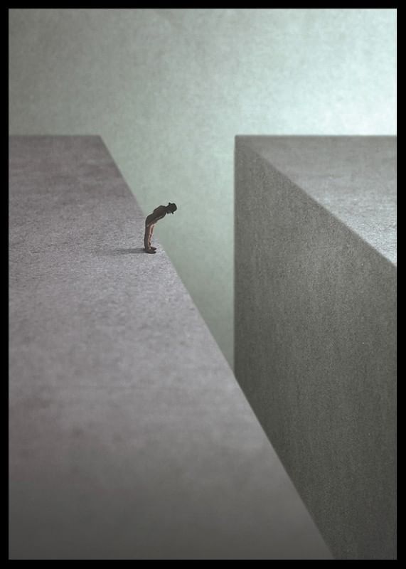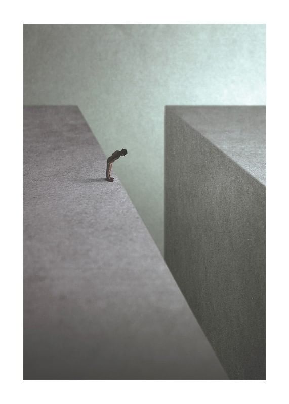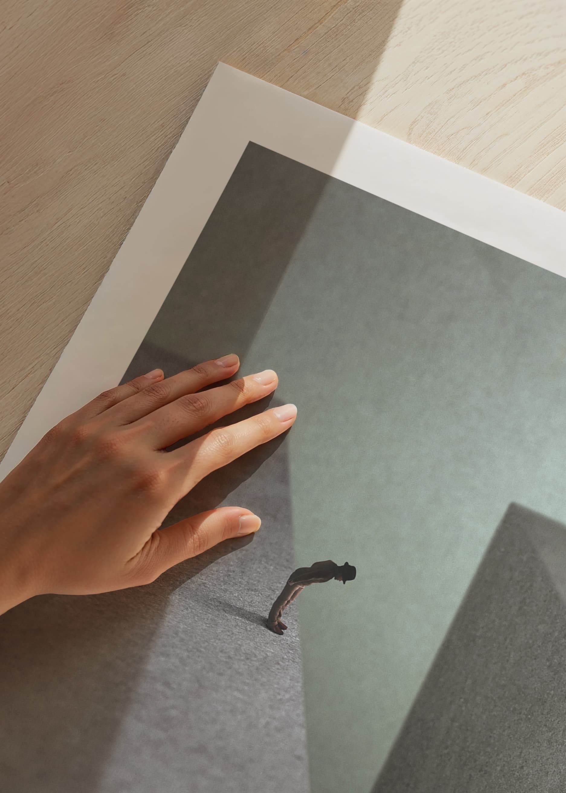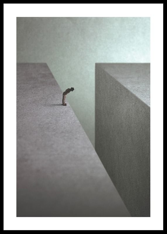 A lone figure stands on the edge of a massive, grey cliff, gazing down into a deep void. The simple and stripped-down shapes give the motif a conceptual and pensive character. With its neutral colours, this poster fits in modern environments where stylish abstraction is desired.