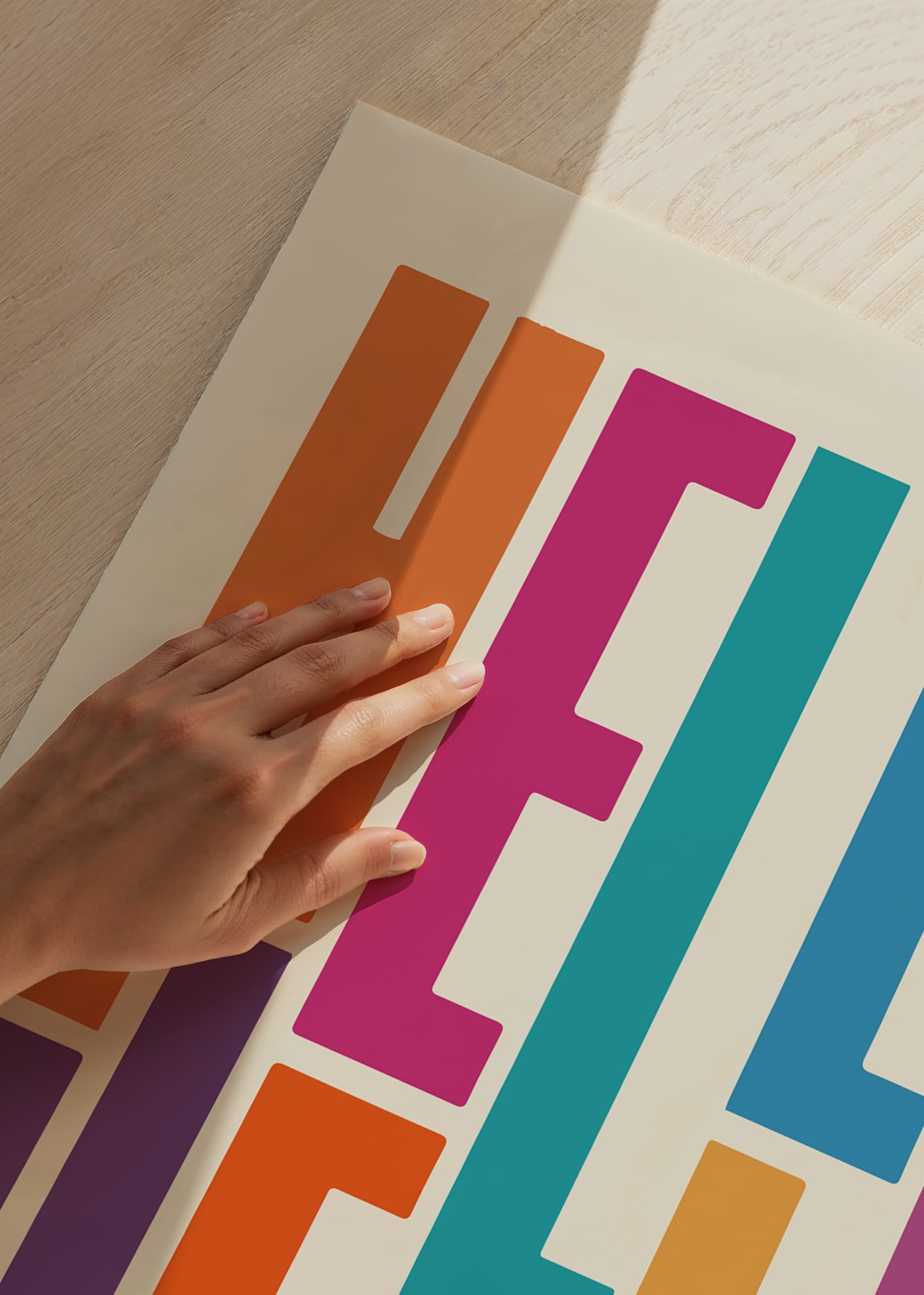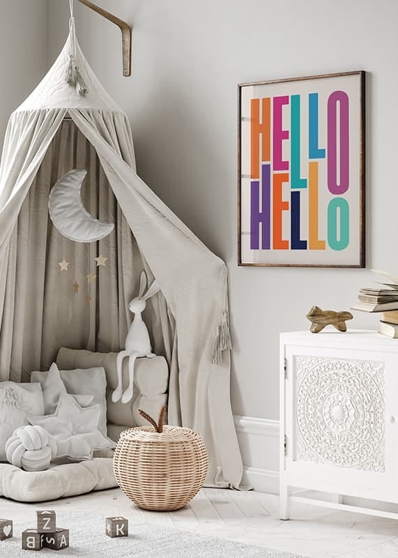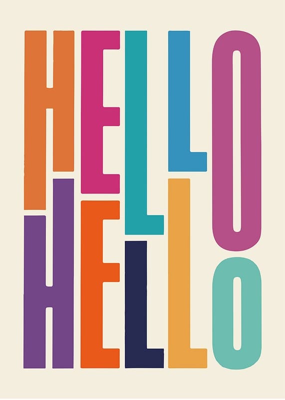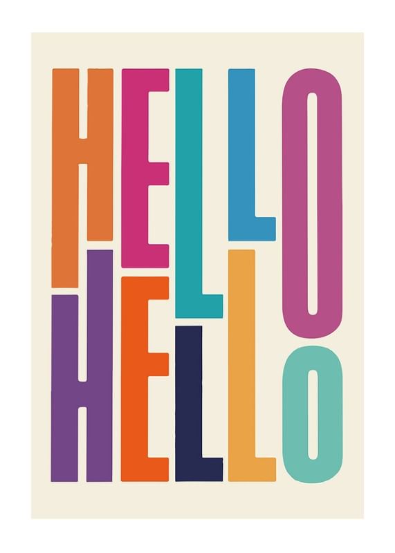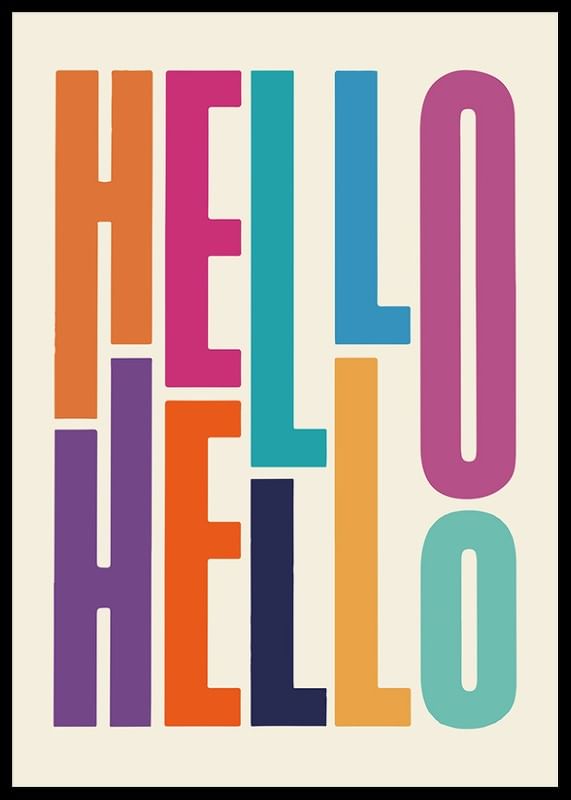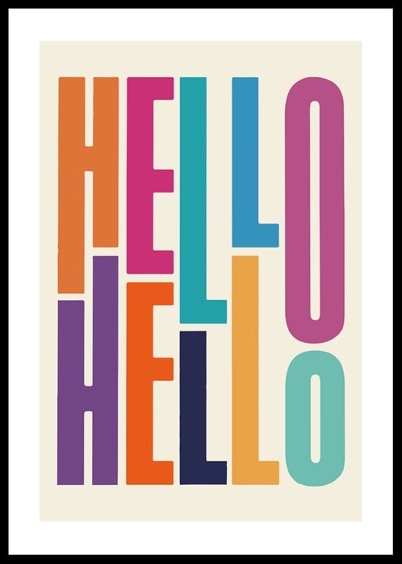 Capital letters of the word HELLO are reproduced twice, stacked and arranged in a graphic pattern. Each letter has its own bright color, including orange, purple, blue, turquoise and yellow, against a light sand-colored background. This poster gives a playful feel and fits nicely in a child's room or creative workspace.