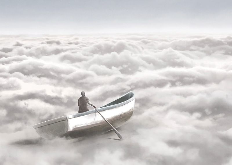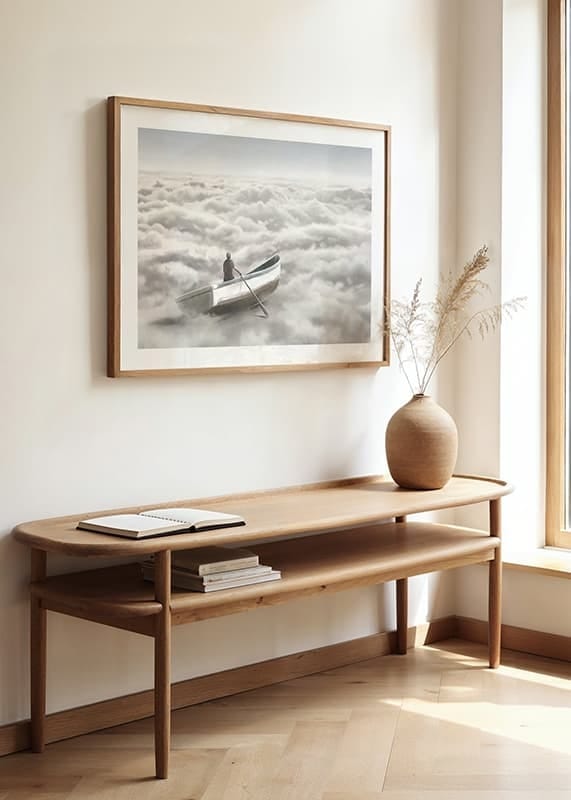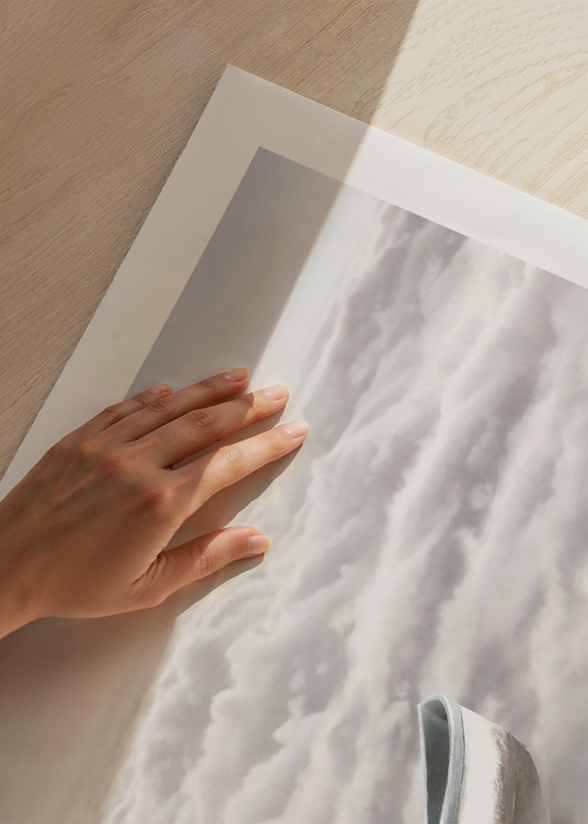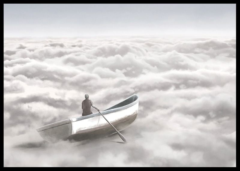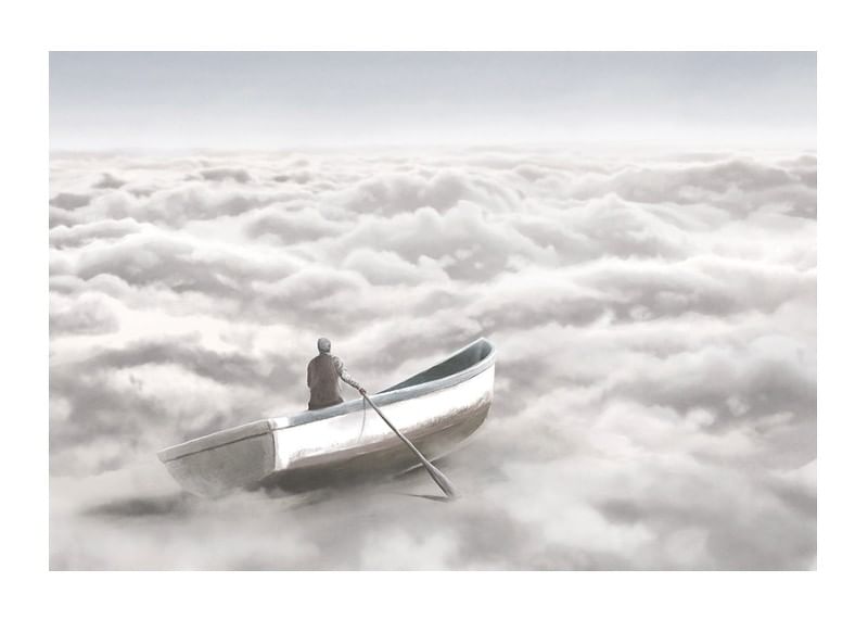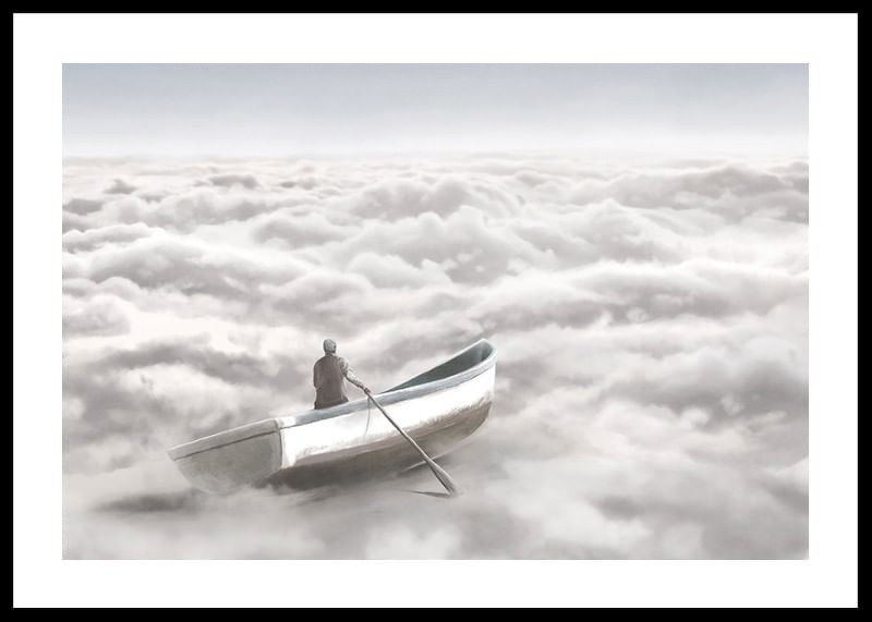 A lone person sits in a rowboat and rows through a vast, soft cloud cover in muted, light gray-white tones. The perspective from above enhances the feeling of a boundless landscape. This surrealist-style poster will be an elegant addition to rooms that desire a calm and dreamy atmosphere.