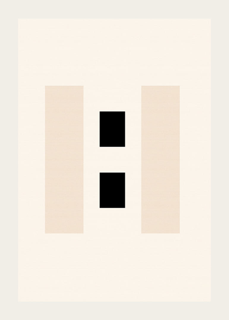 Two black rectangles are placed vertically in the middle while two wide, light beige fields run parallel along the sides against a sand-colored background with a subtle texture. The balance between the geometric shapes gives the poster a strict yet soft expression that fits nicely in modern and calm home environments.