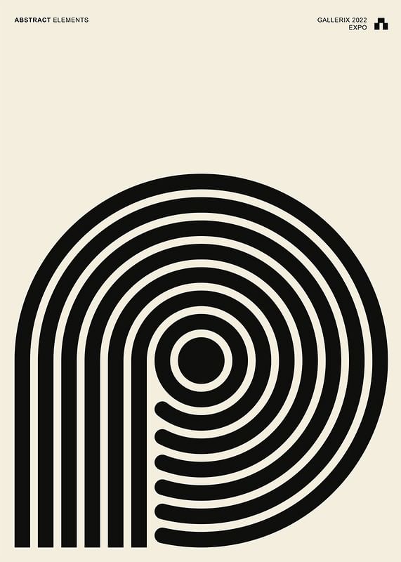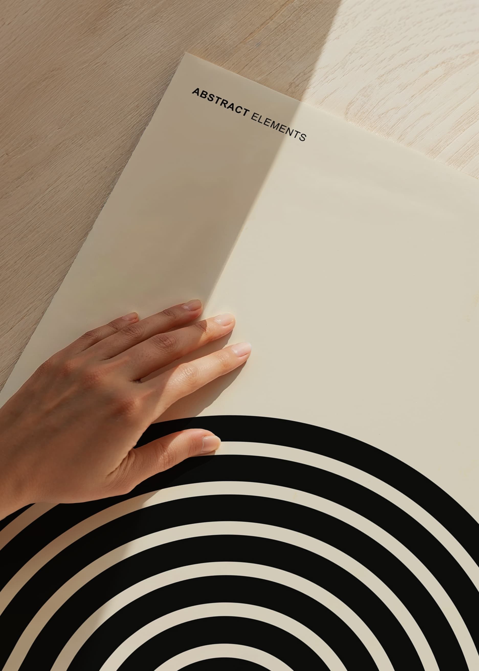 The motif consists of broad, black lines that form an abstract, semi-circular pattern with a circle in the center. The beige background provides a soft contrast to the clear design language. A stylish poster that adds a modern and graphic feel, ideal for living rooms, study rooms or offices.