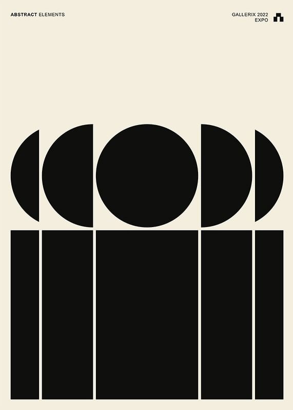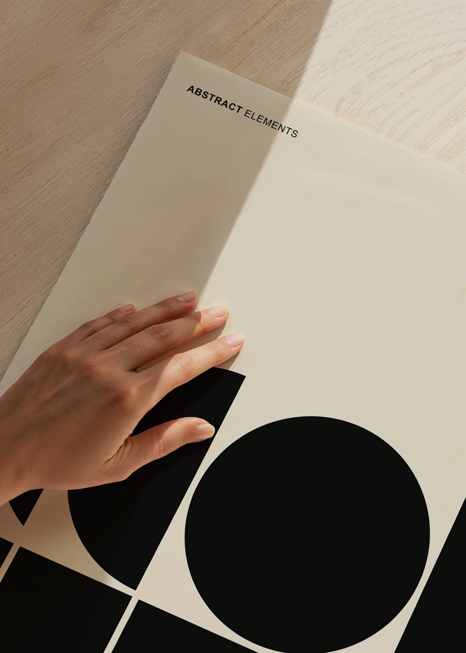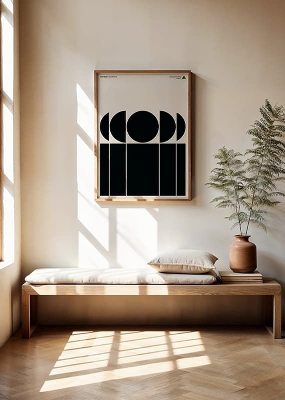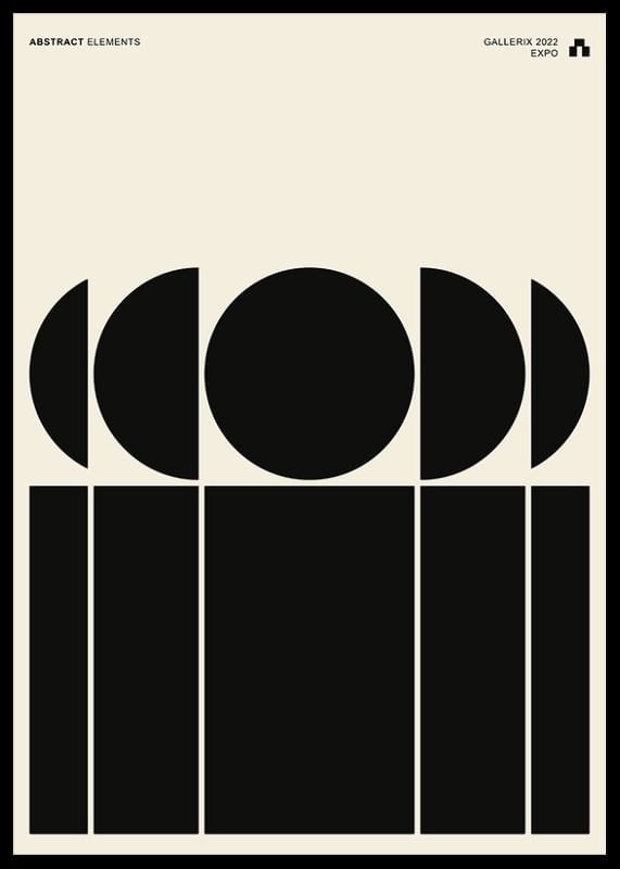 Large black circles, semicircles and rectangles form a graphic abstract pattern against a soft sand-coloured background. Combined geometric shapes create balance and symmetry that give a modern expression. This poster fits particularly well in minimalist or Scandinavian-style rooms.