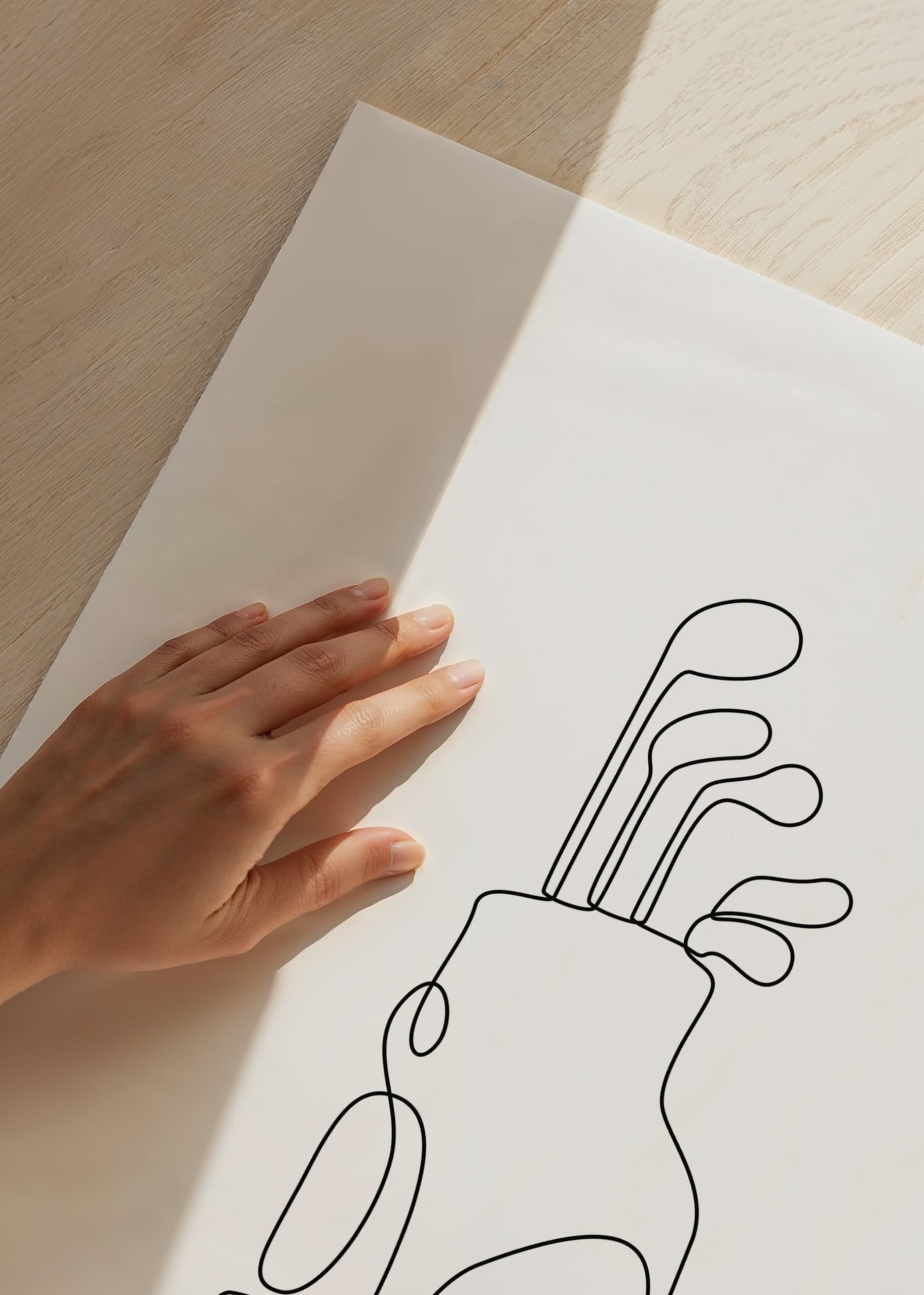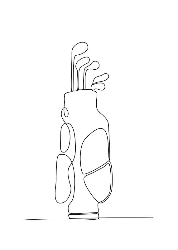 Outline motif of a golf bag with clubs drawn in a single line. Black lines on a white background create a stylish and sports-inspired expression in a graphic style. This poster is perfect for a study, hallway or other space where a subtle sports theme adds character to the interior.